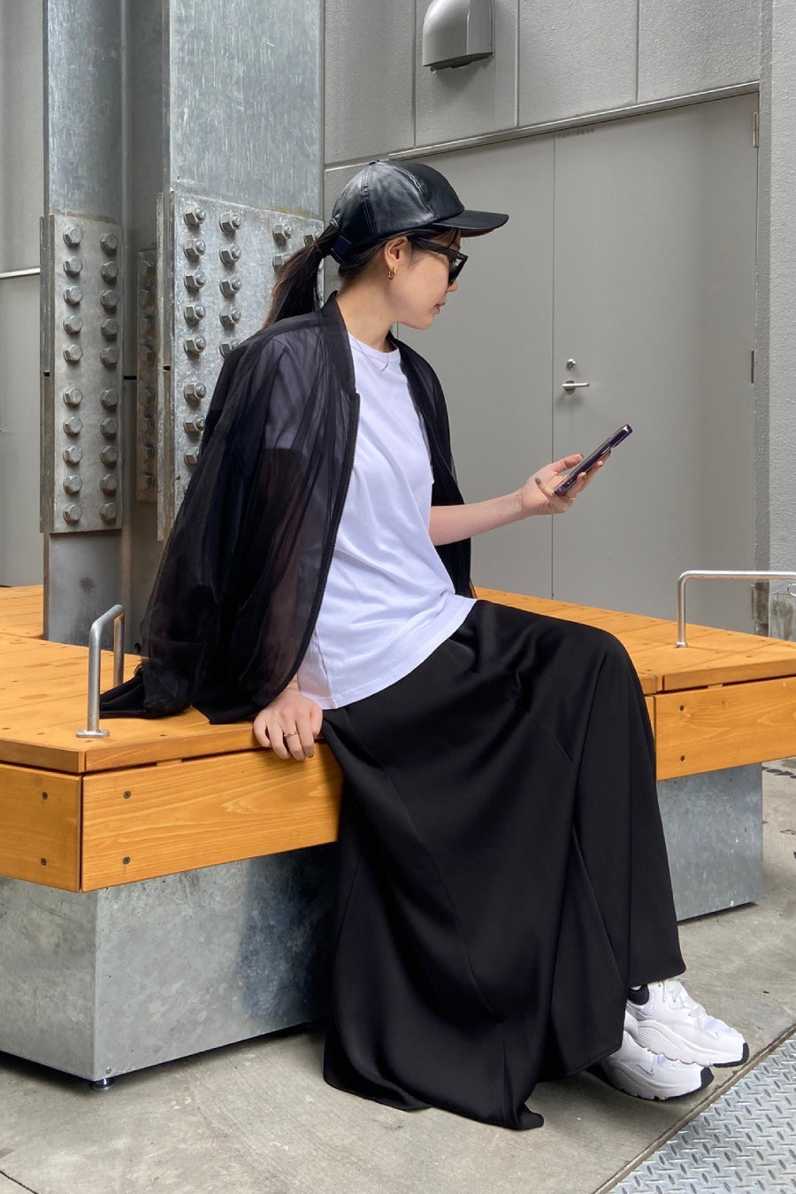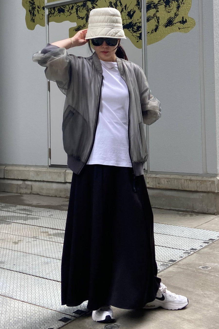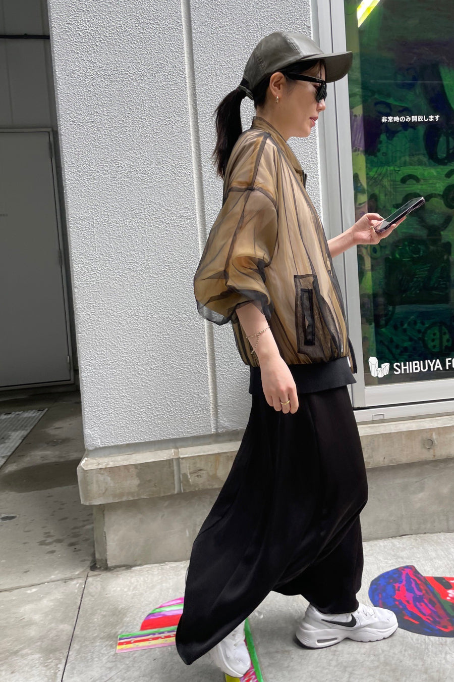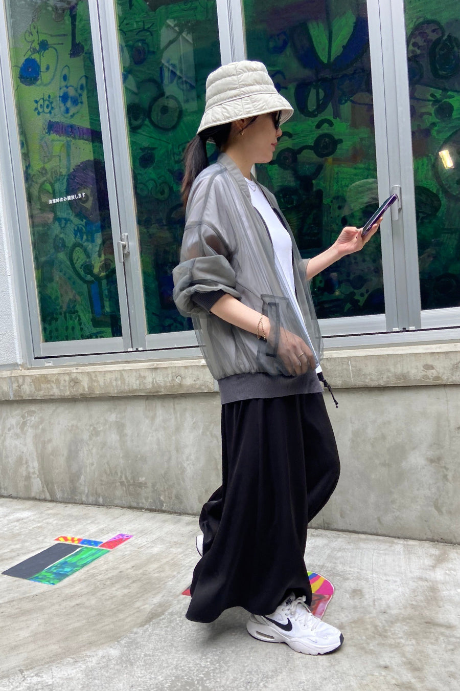 リブテレコの切り替えで、カジュアルダウンし、程よいオーバーシルエットとシアー感がリラックスした雰囲気を演出してくれます。