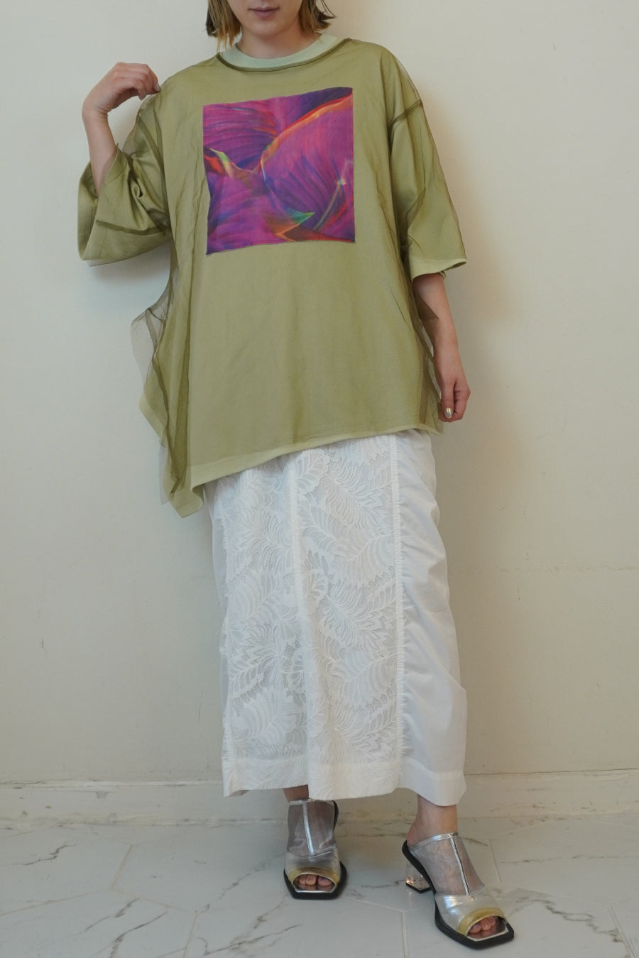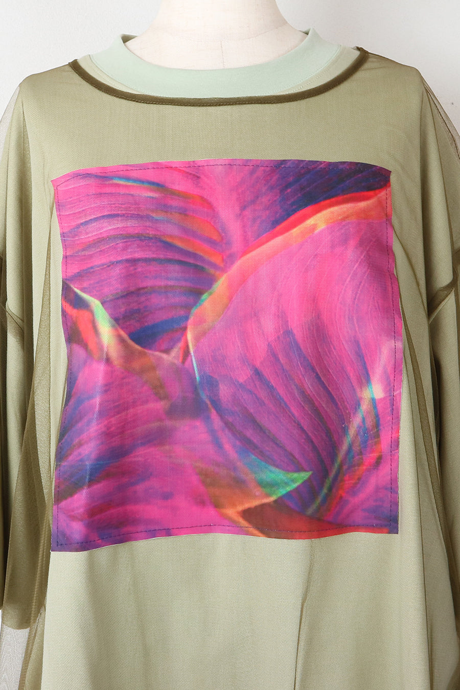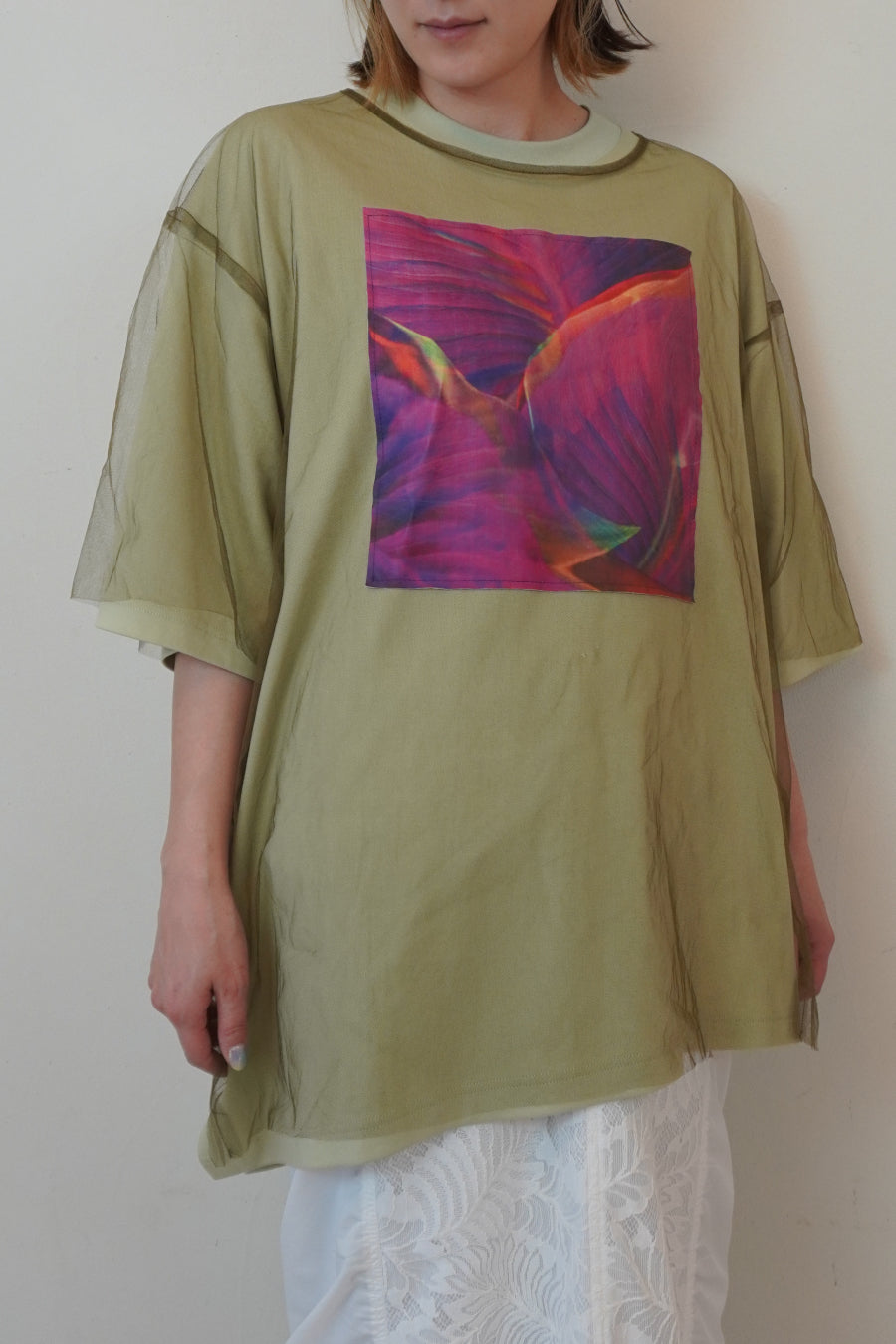今シーズンはリーフフォトをグラフィック加工し、チュールをレイヤードしたデザインに。