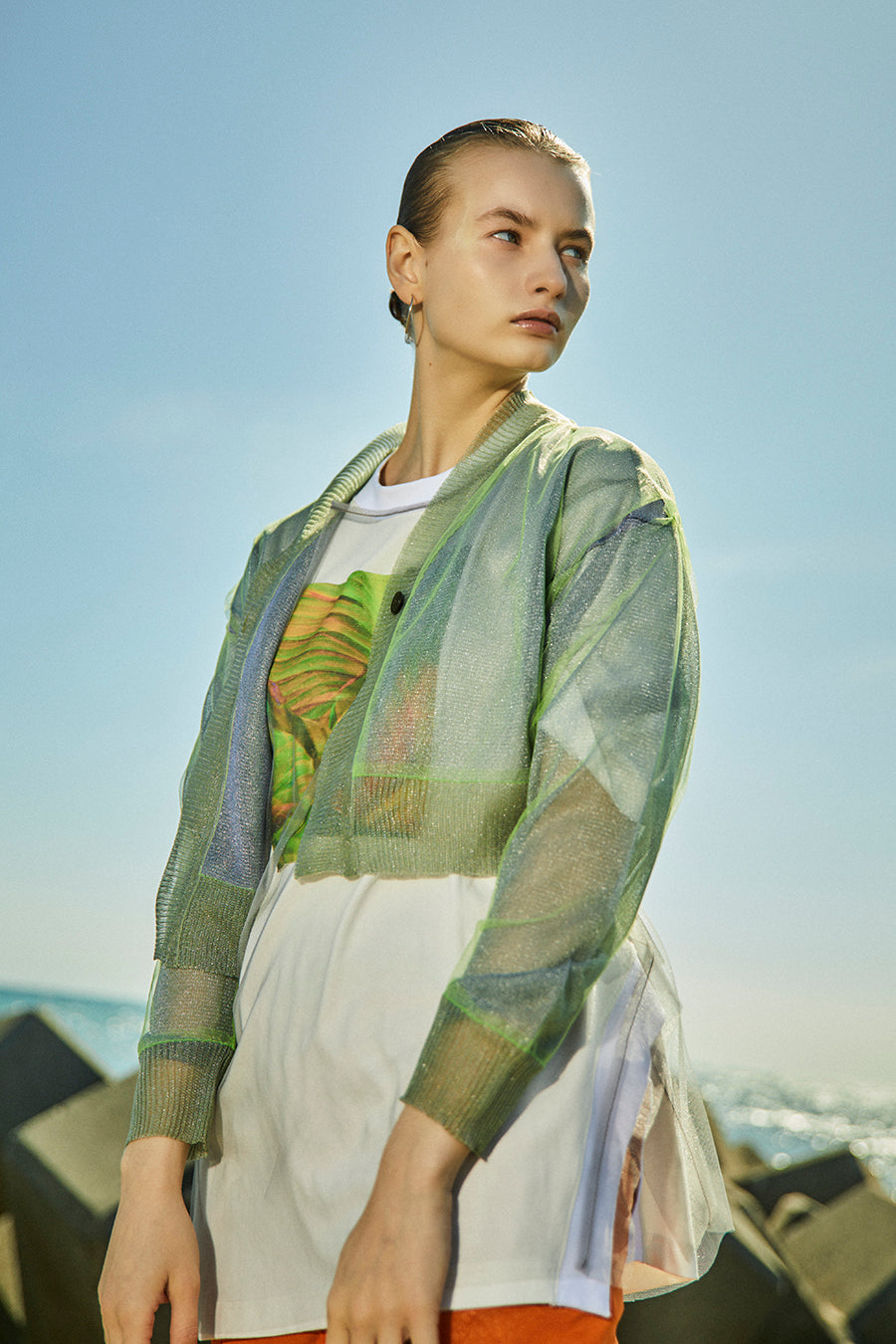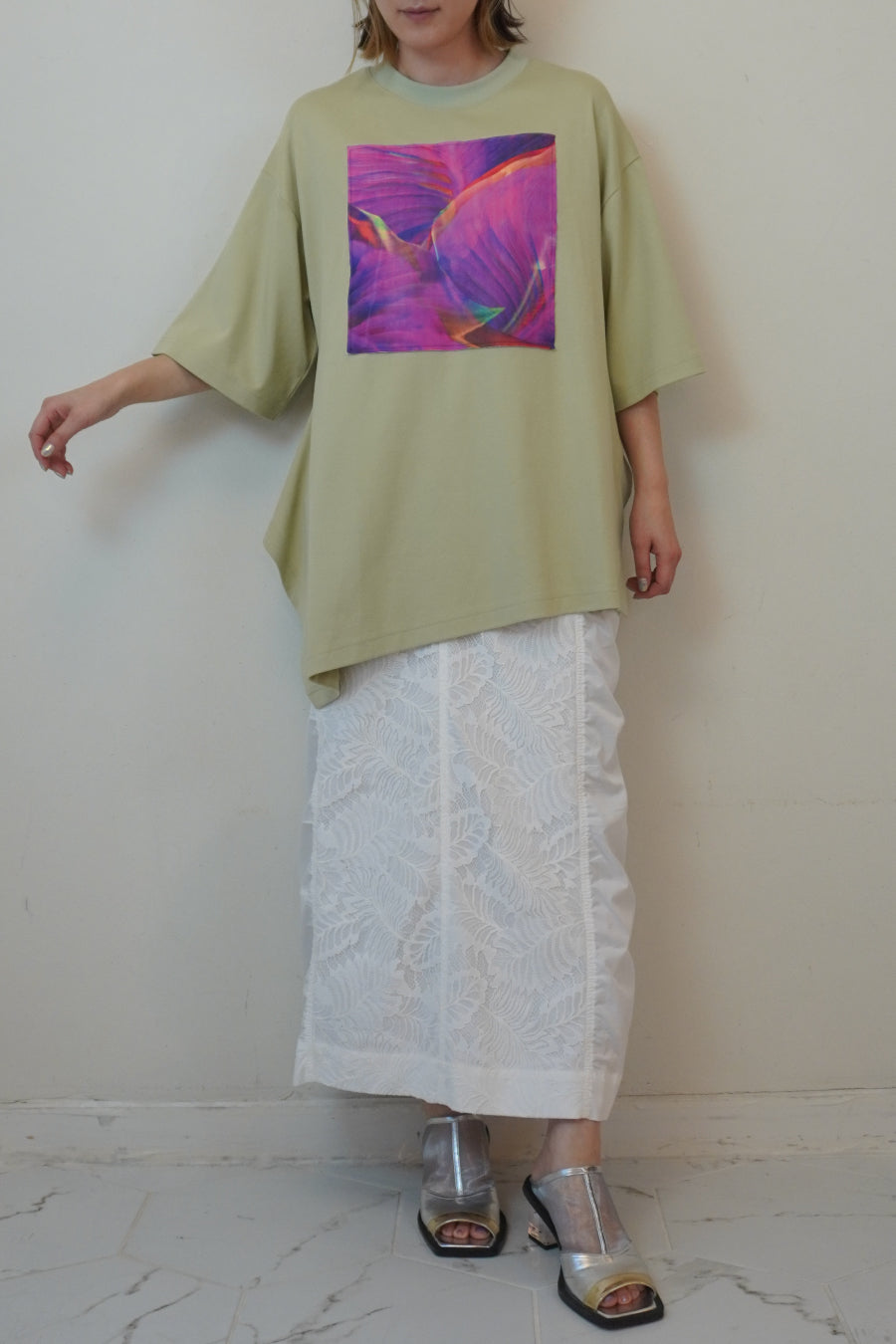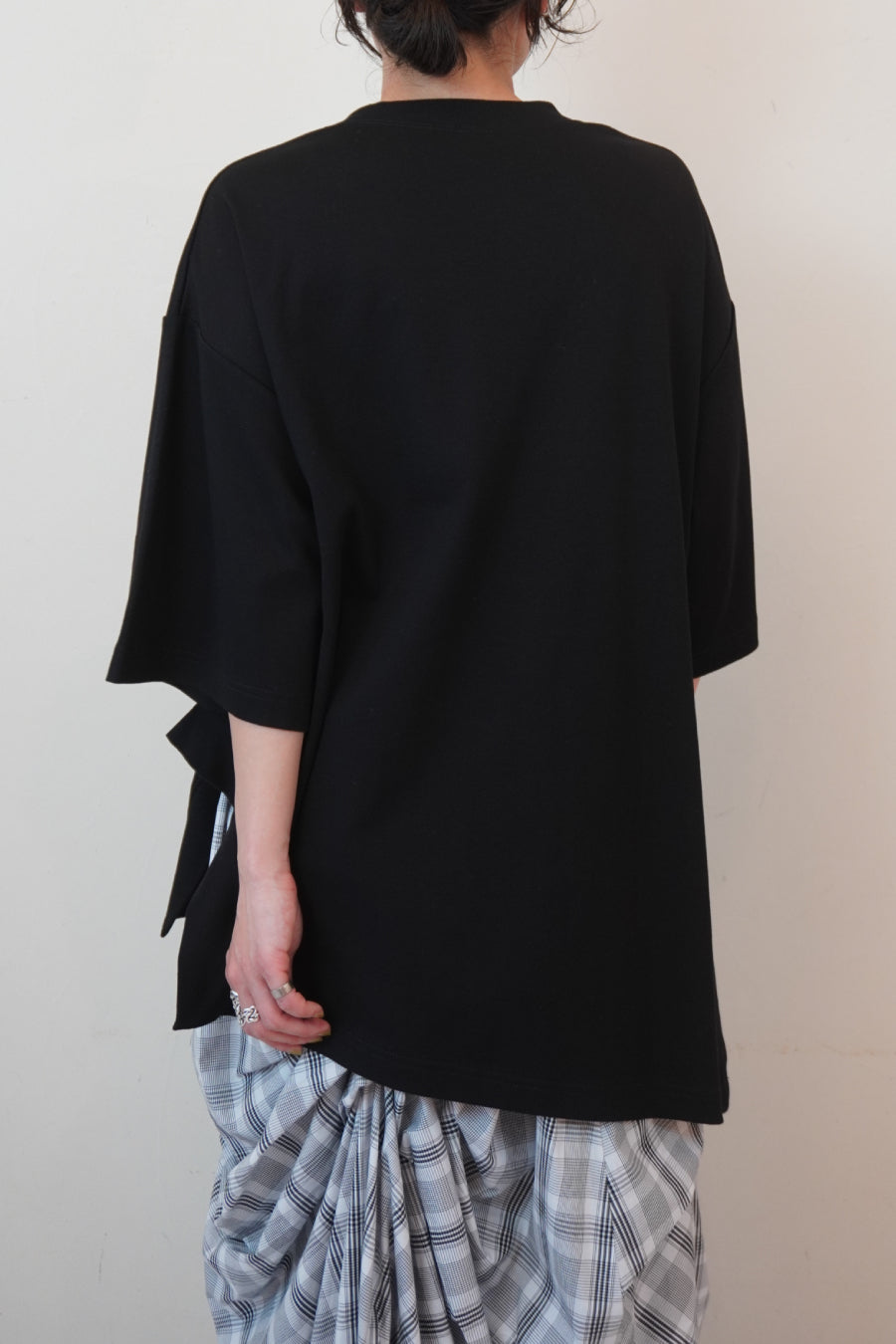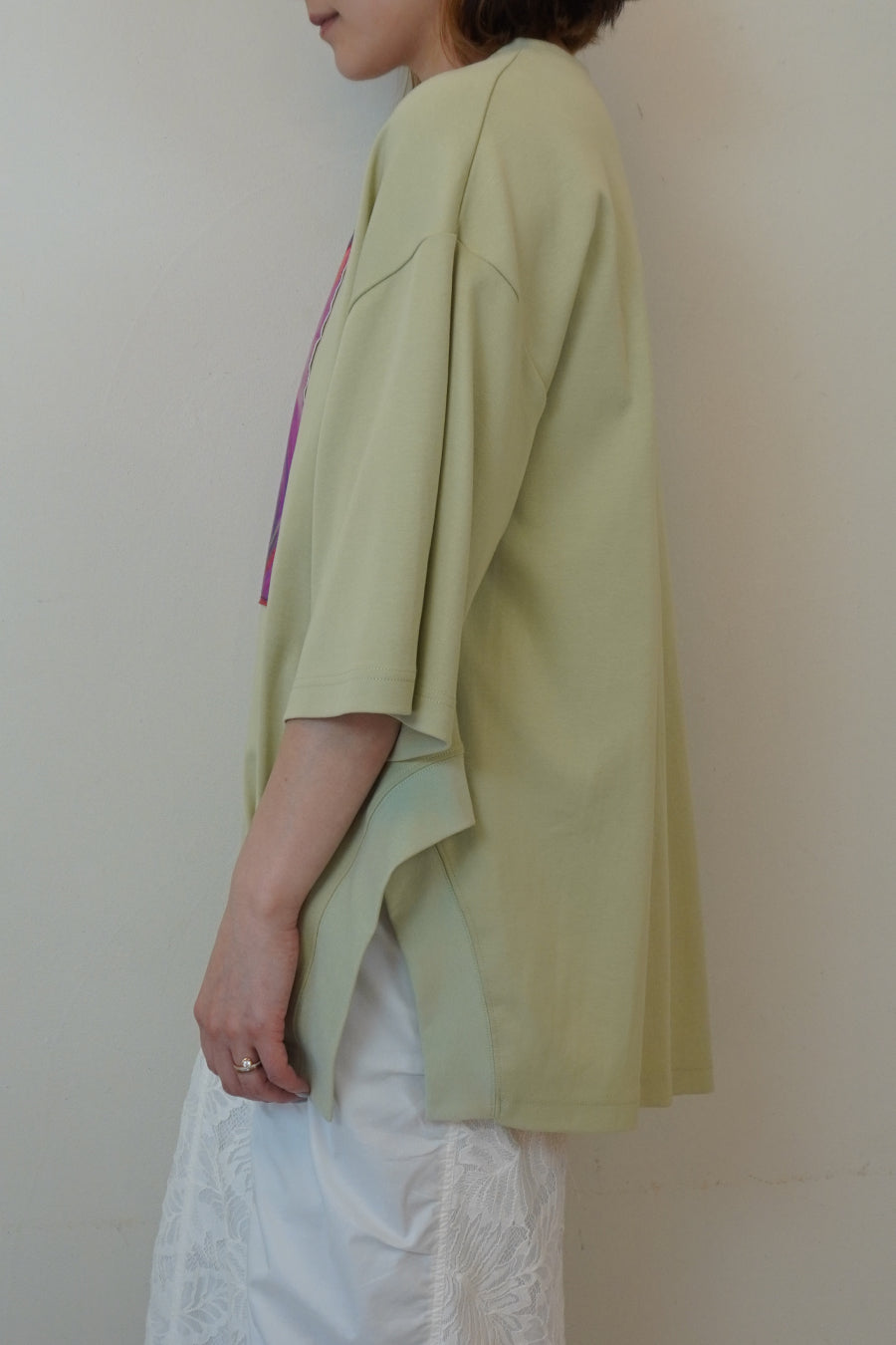 袖丈は長めの半袖で着丈も長いので、抜け感のあるスタイルには欠かせないバランスに。