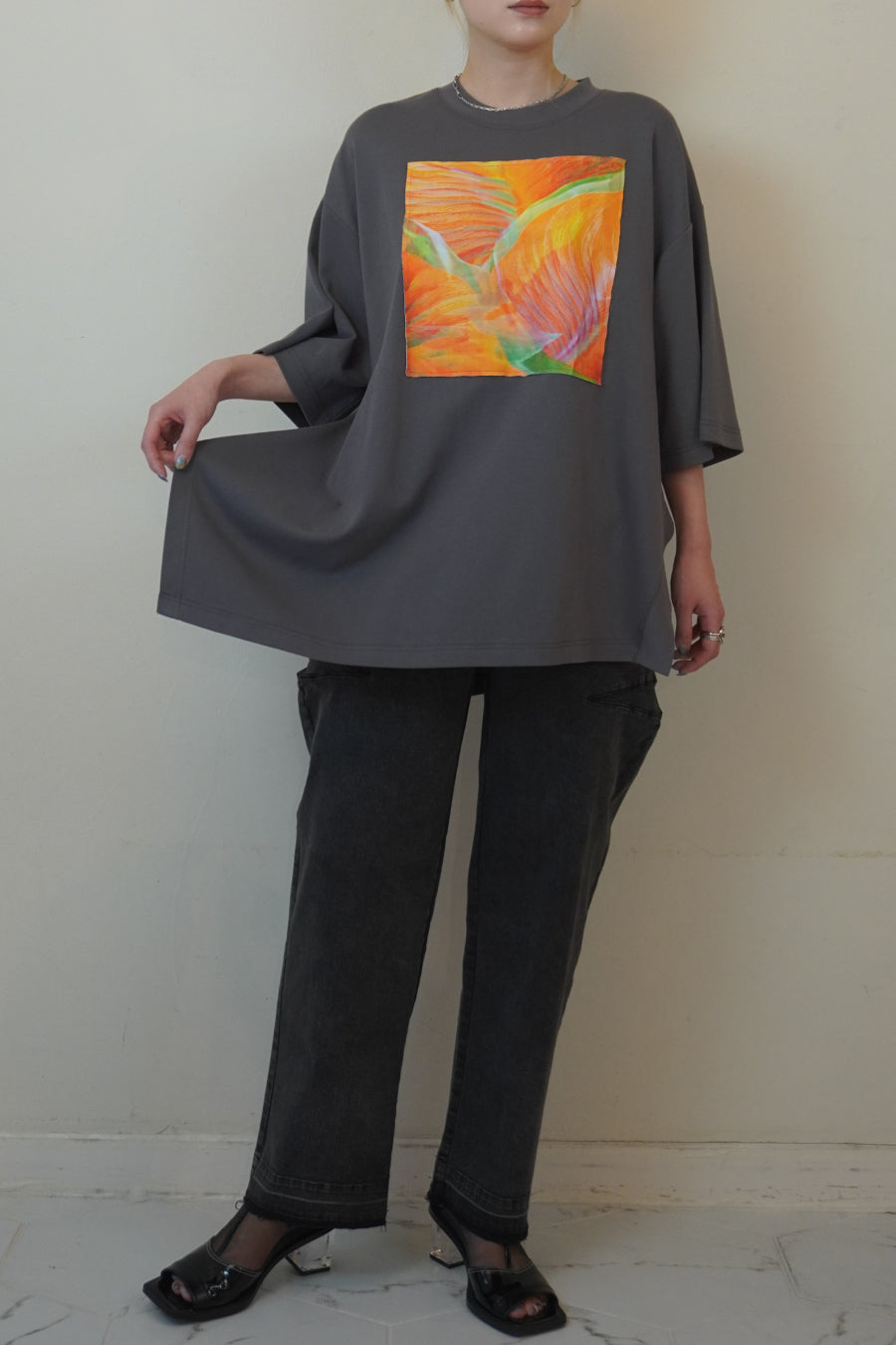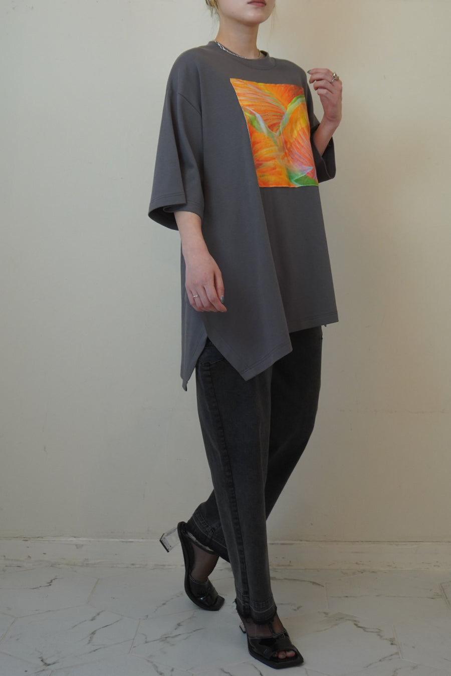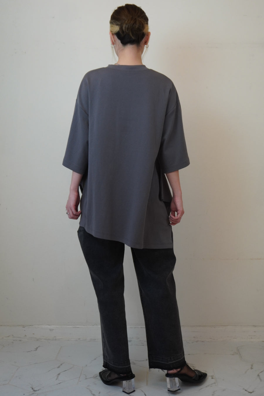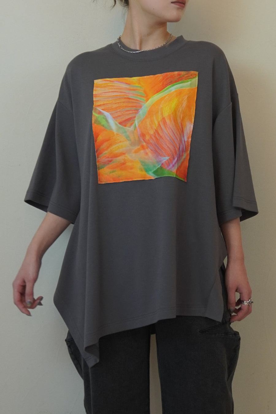 オーバーサイズで、アシンメトリーな裾のラインもポイント。
