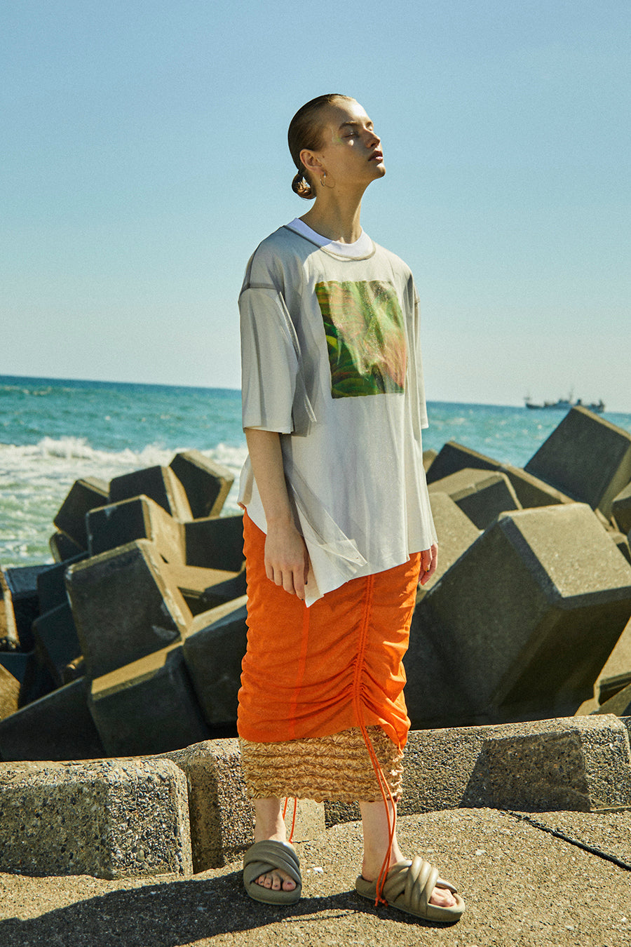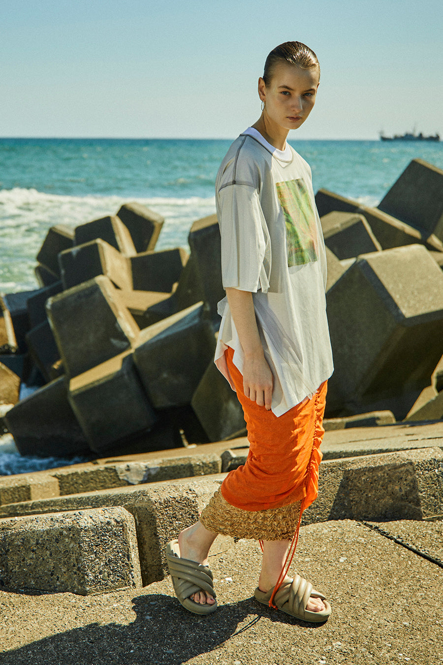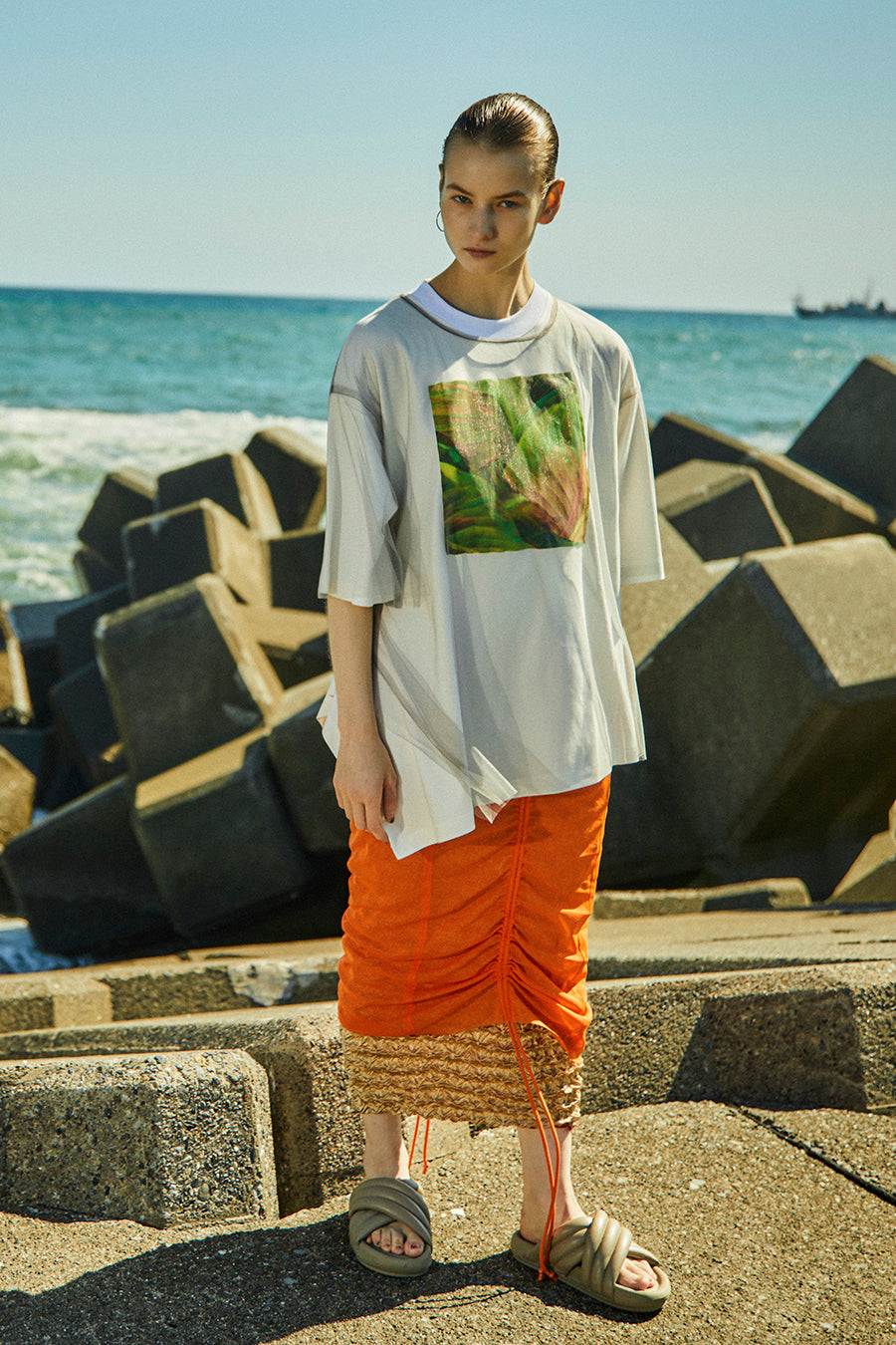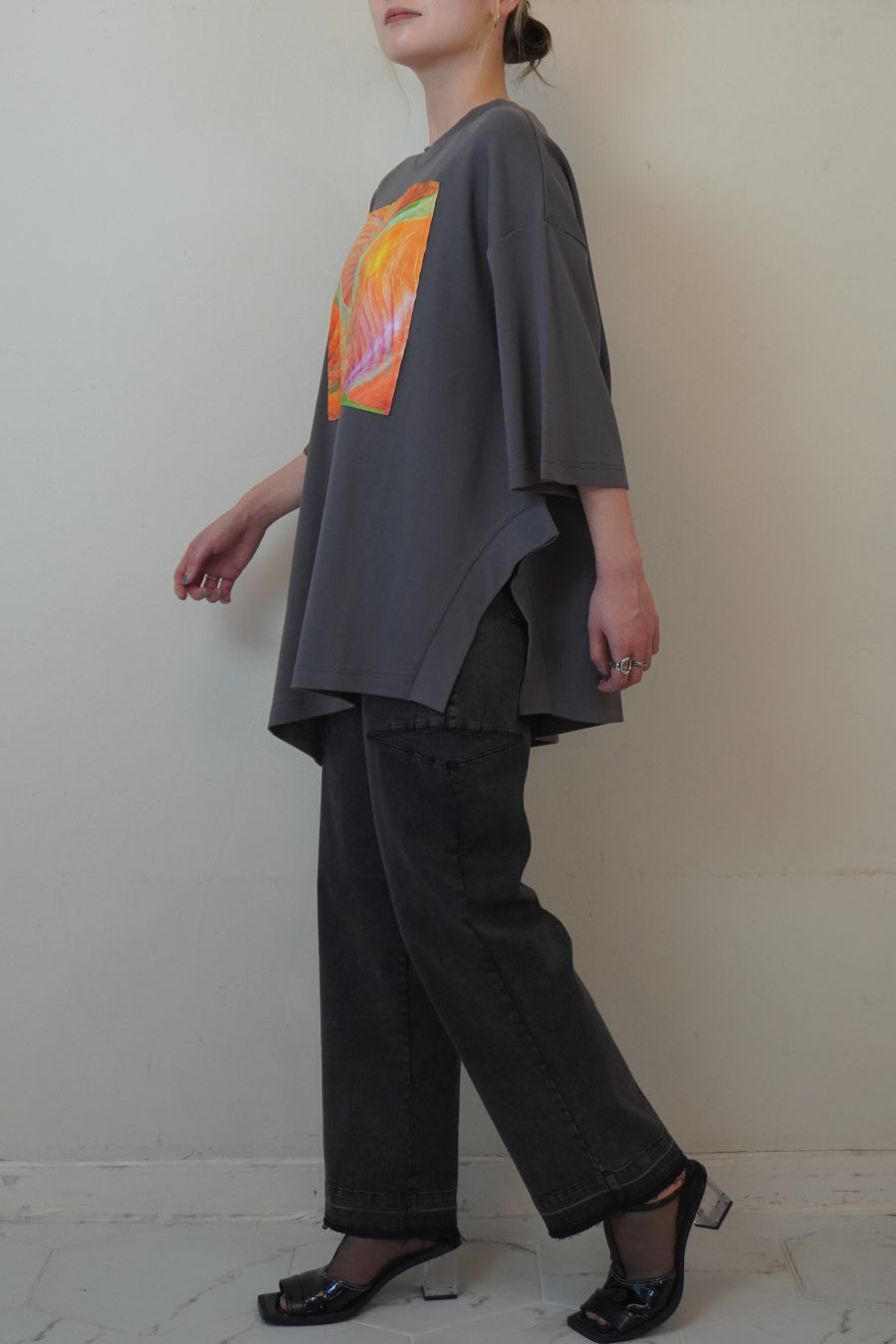 オーバーサイズで、アシンメトリーな裾のラインもポイント。