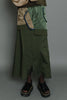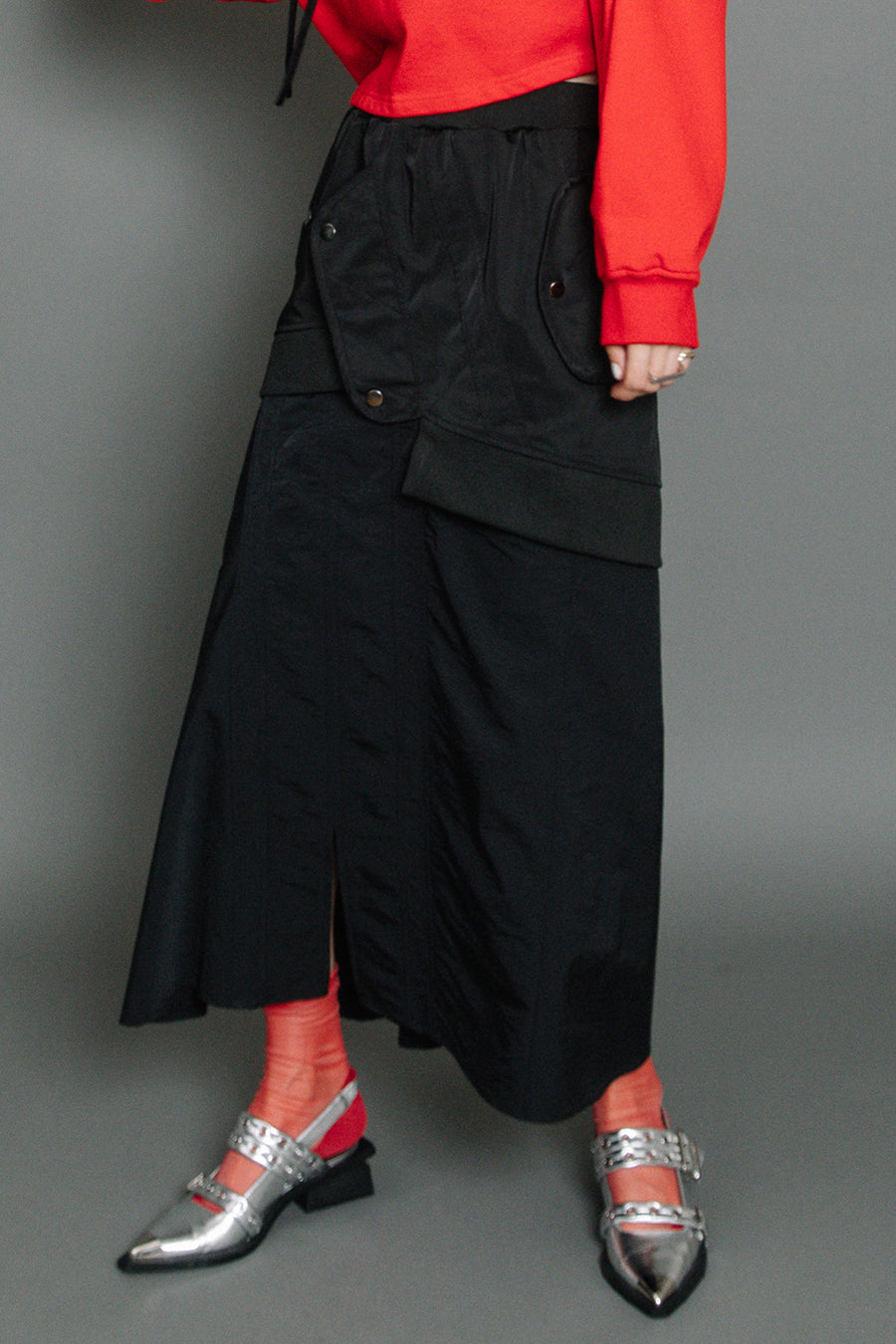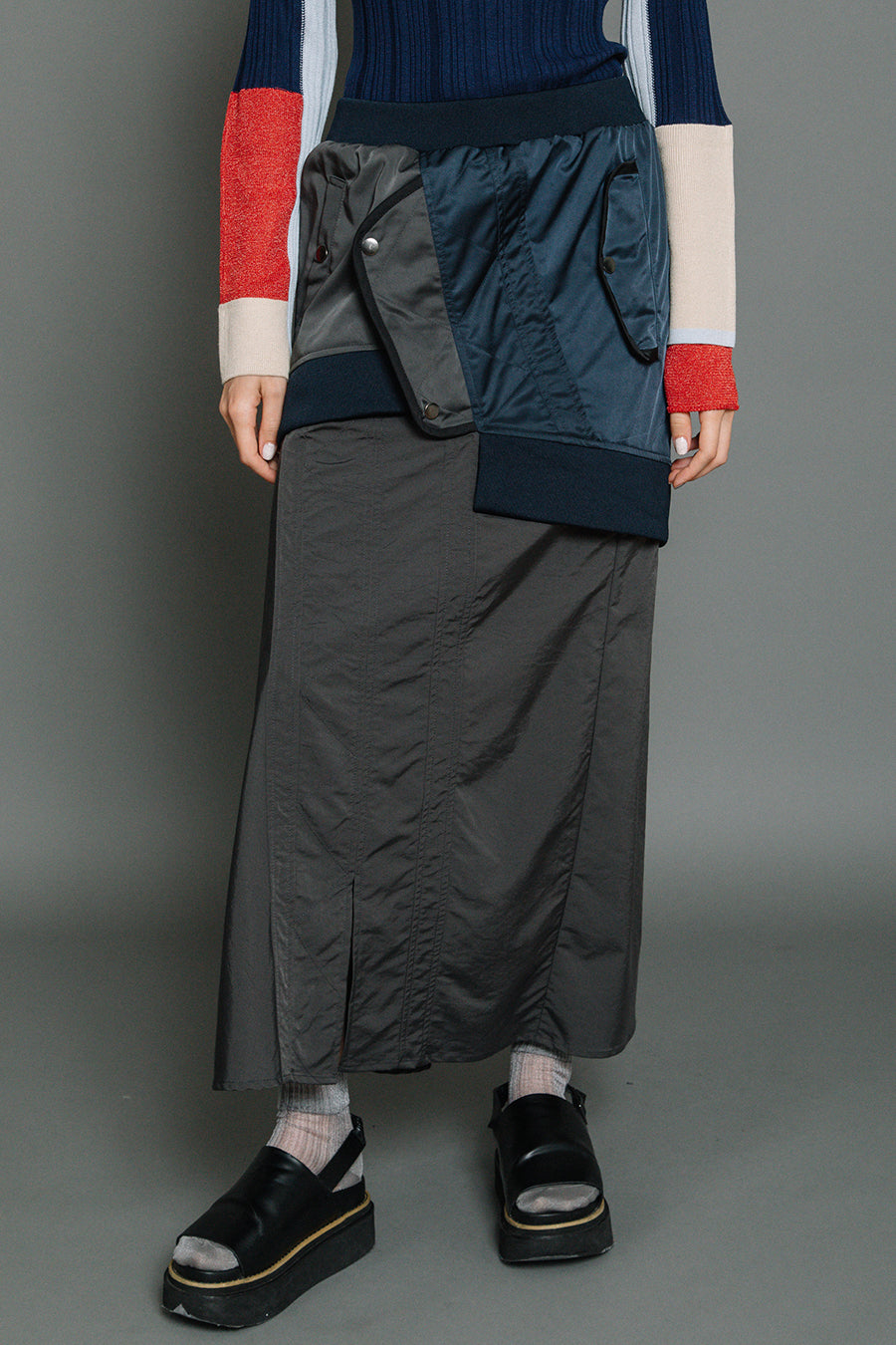 ナイロンツイルミリタリーテイストのスカートで、ミニスカートとロングスカートのレイヤード風のデザイン。