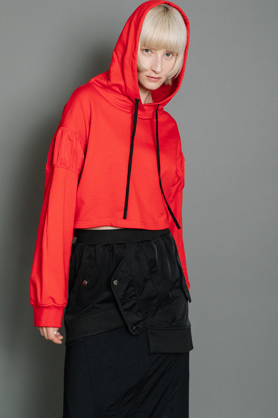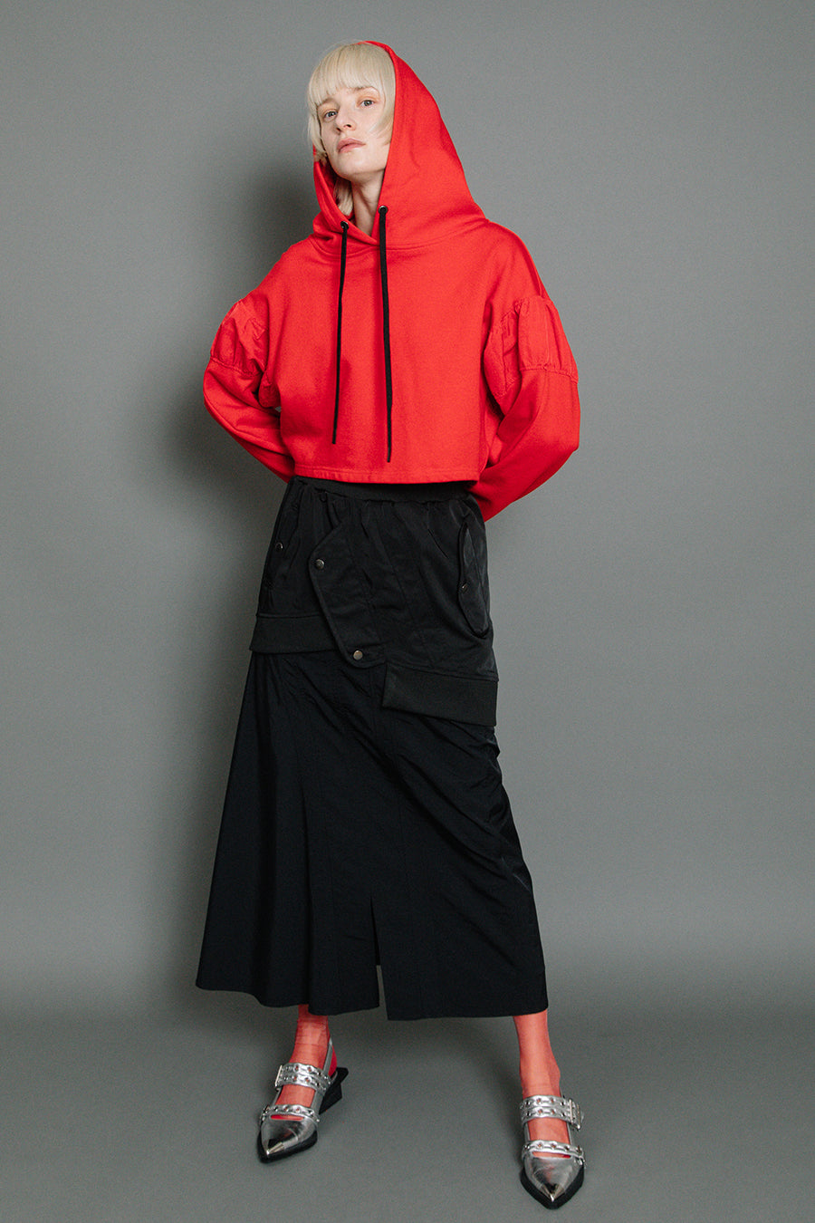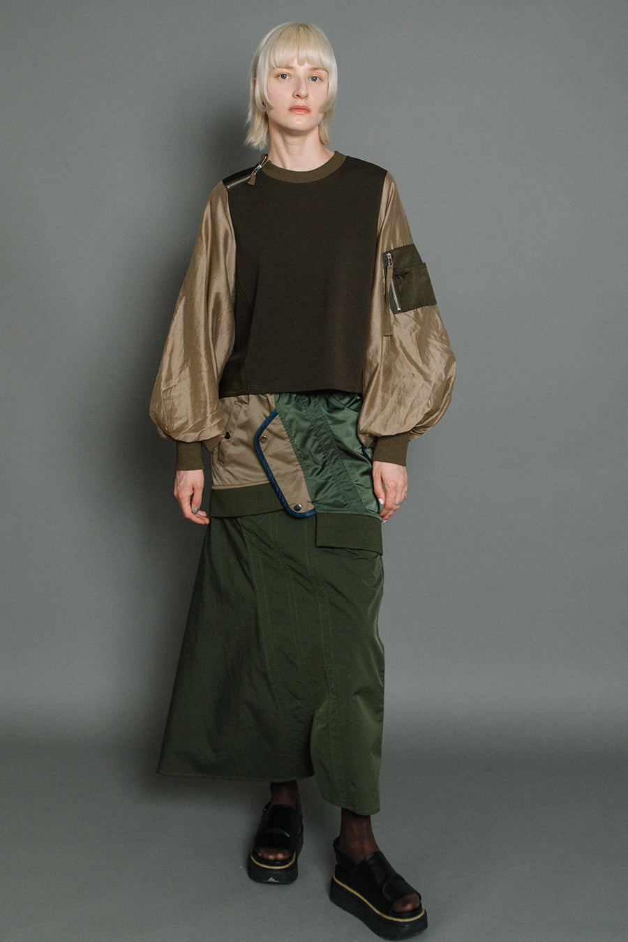 ポケットや持ち出し、ジグザグステッチ、ニットリブなどMA-1のディテールが盛り込まれ、裾シルエットも左右アシンメトリーにデザインされた、1枚で目を惹くデザイン。