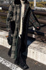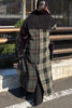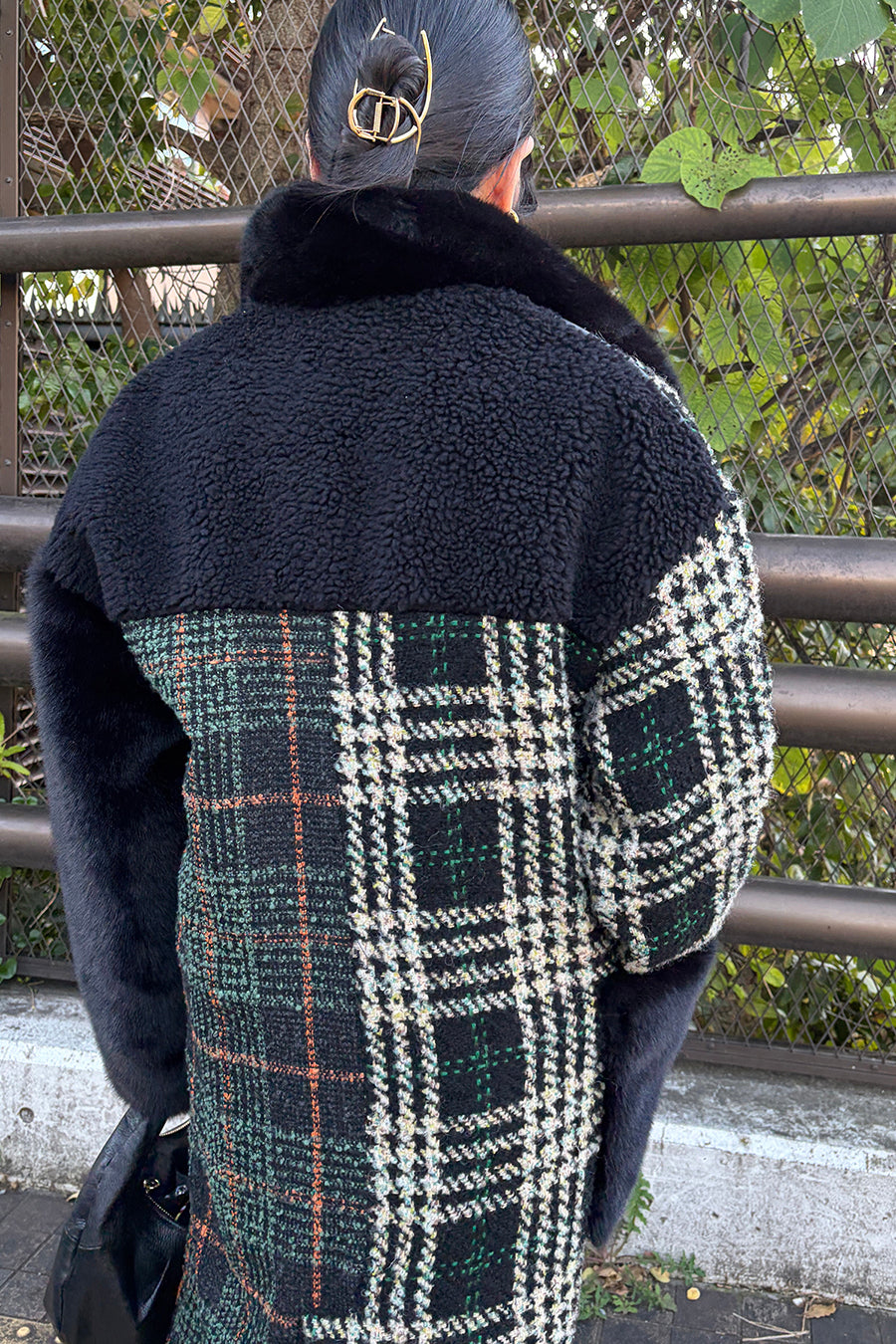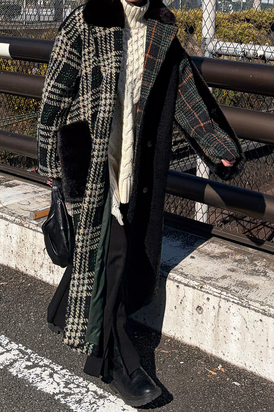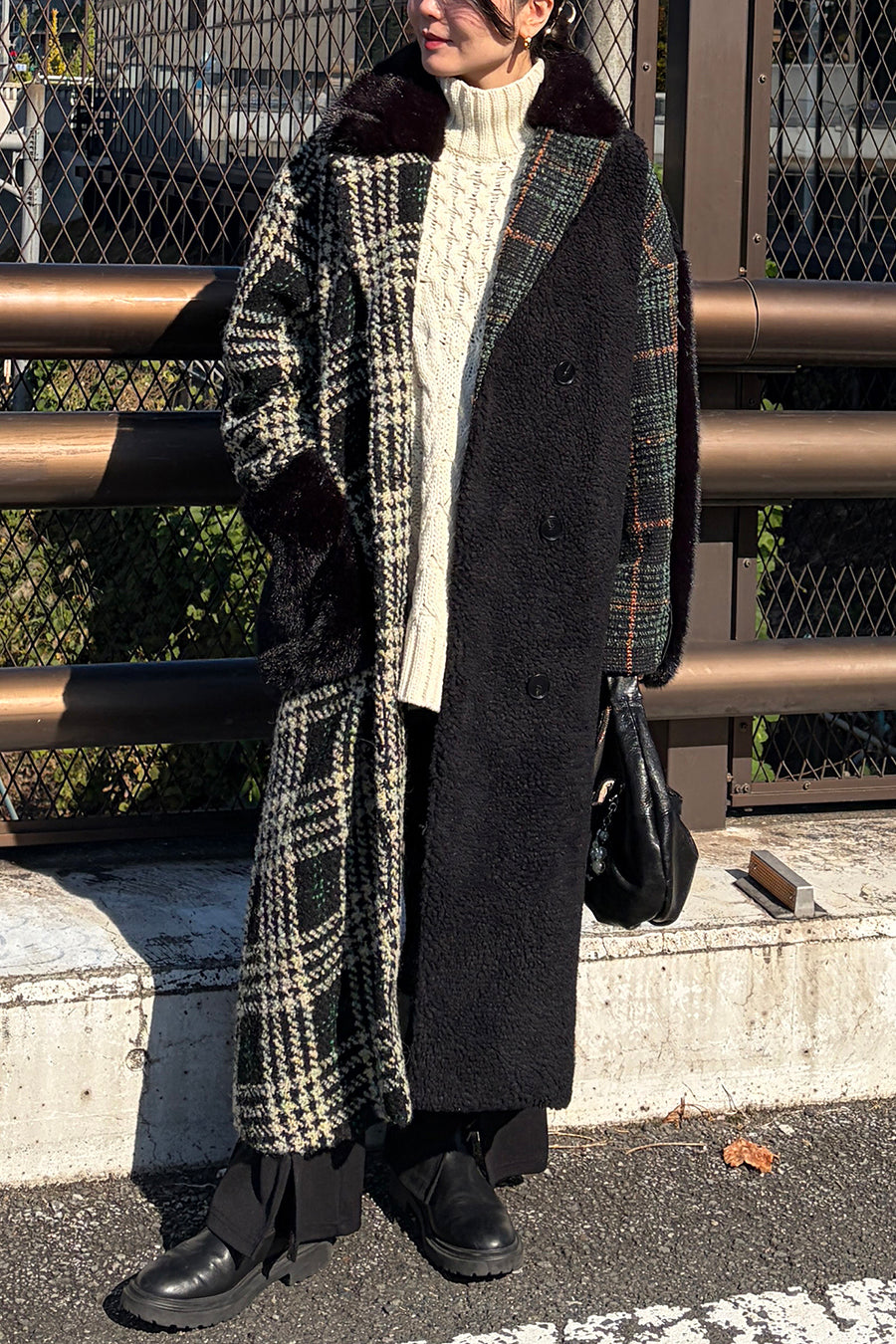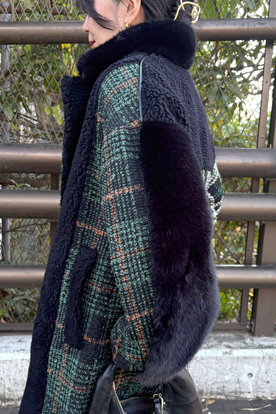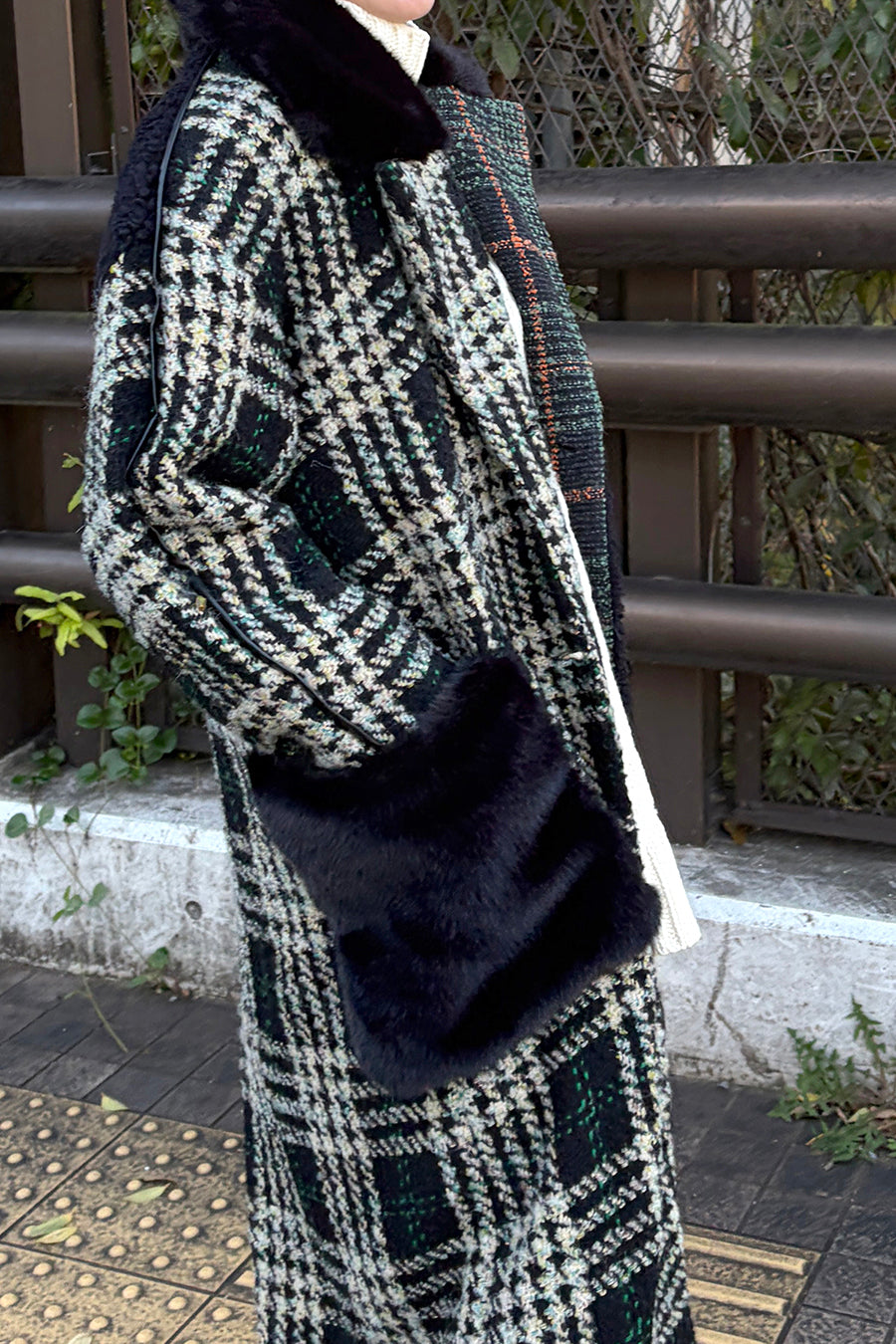 ツイードチェック、ヘリンボーンツイード、シャギー、ロービングなどと、異素材のエコファーやボアの4素材をコンビネーションしたロングコート。