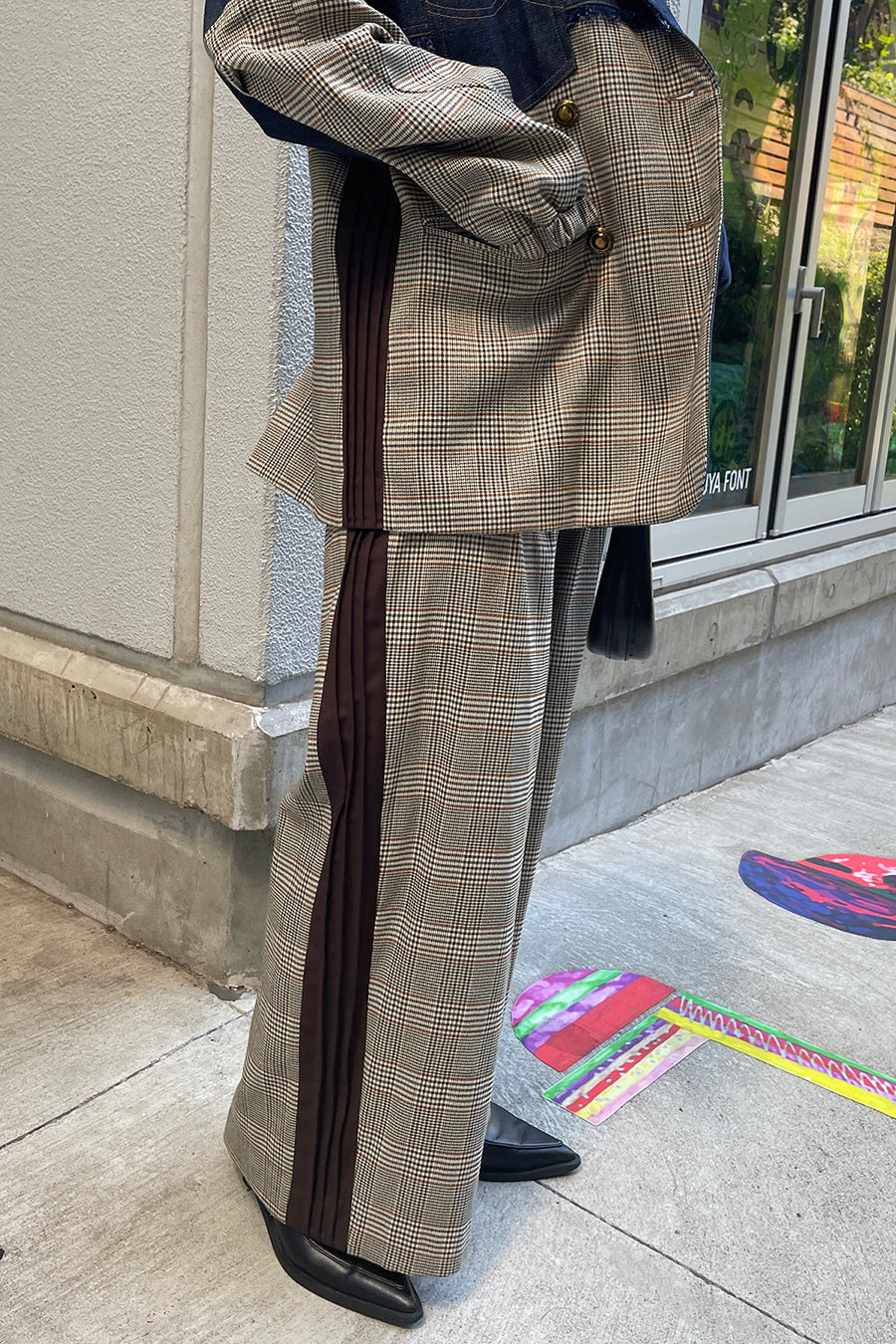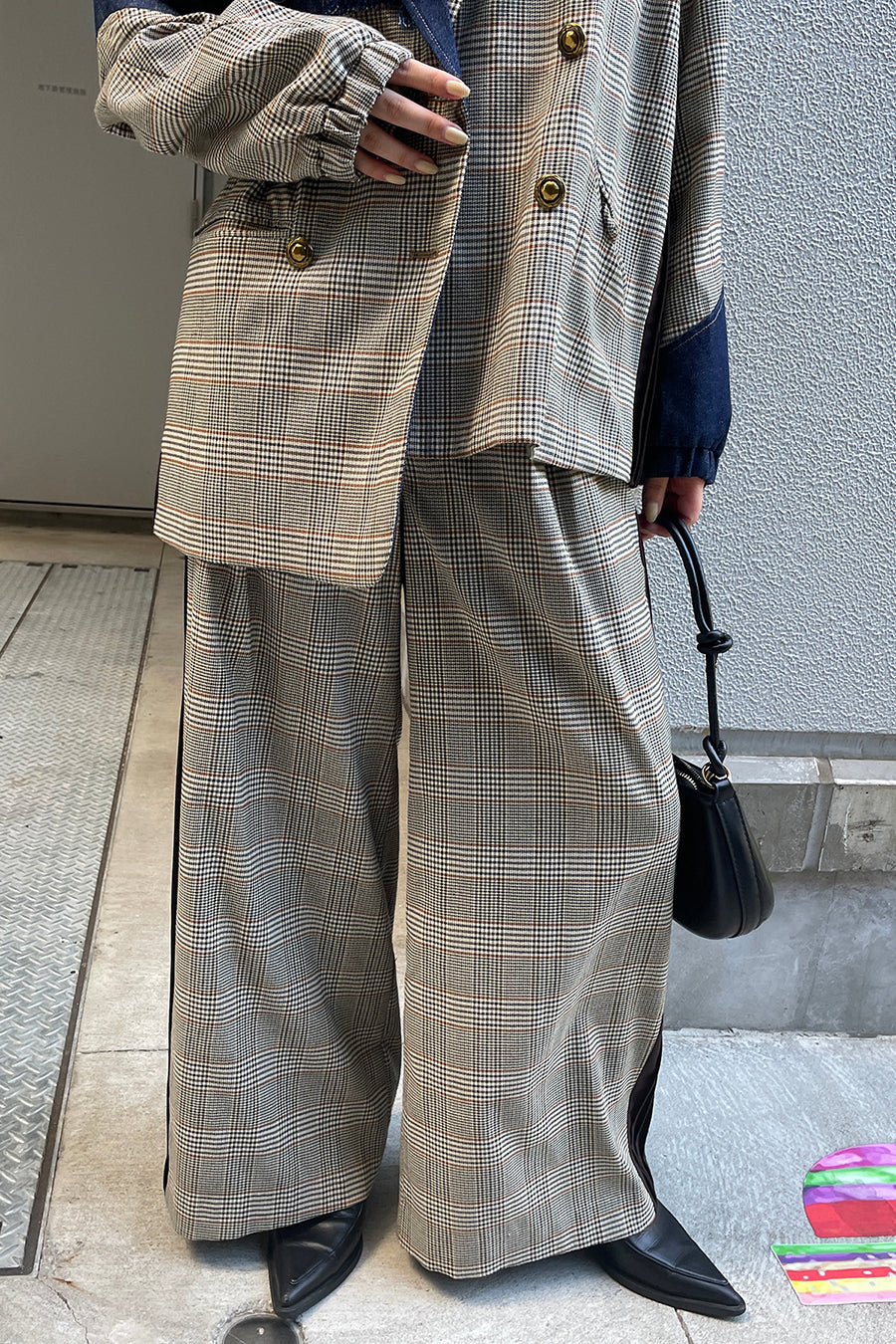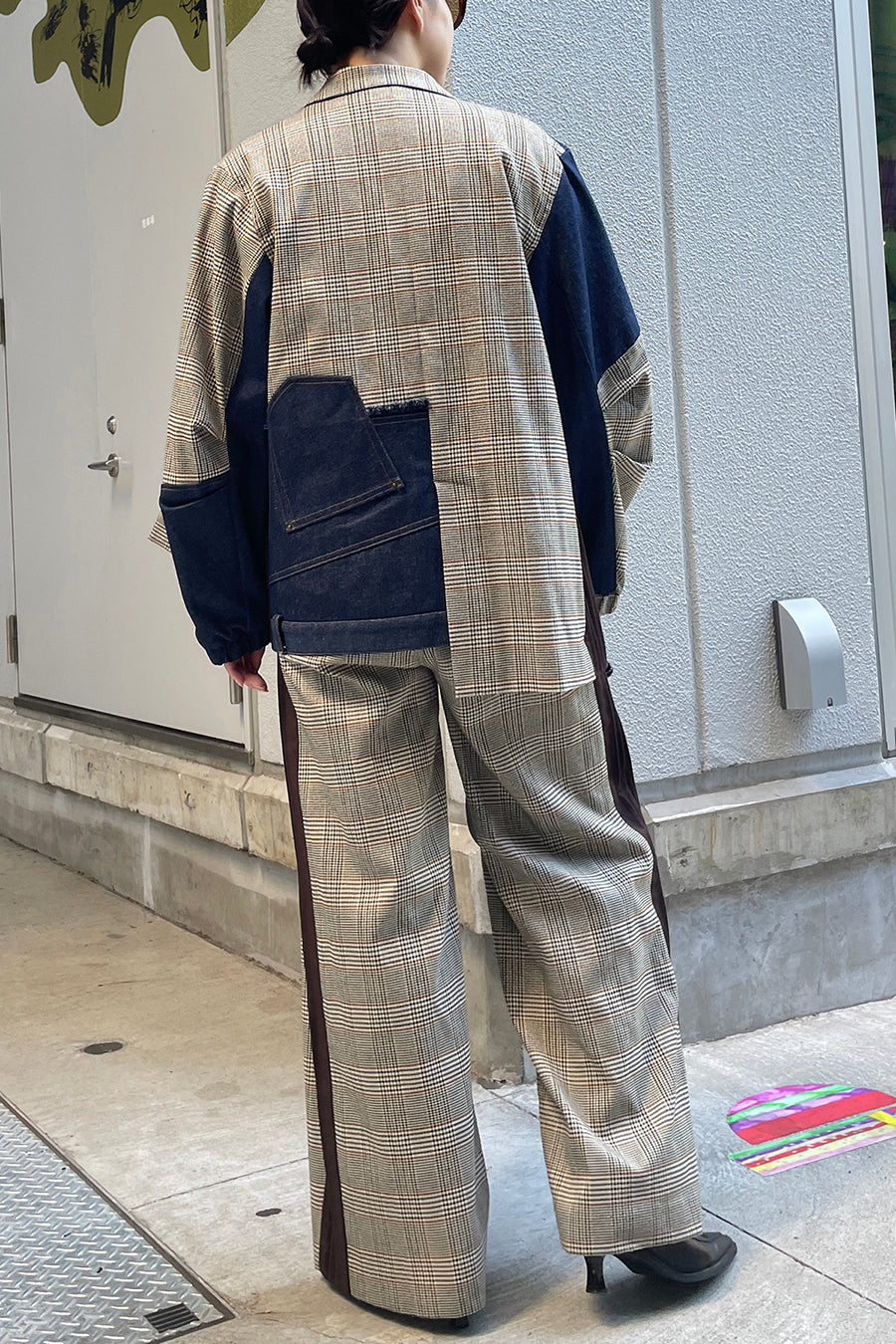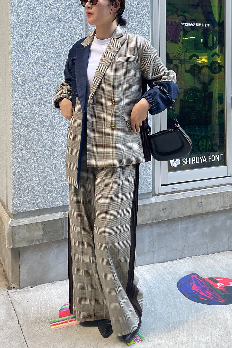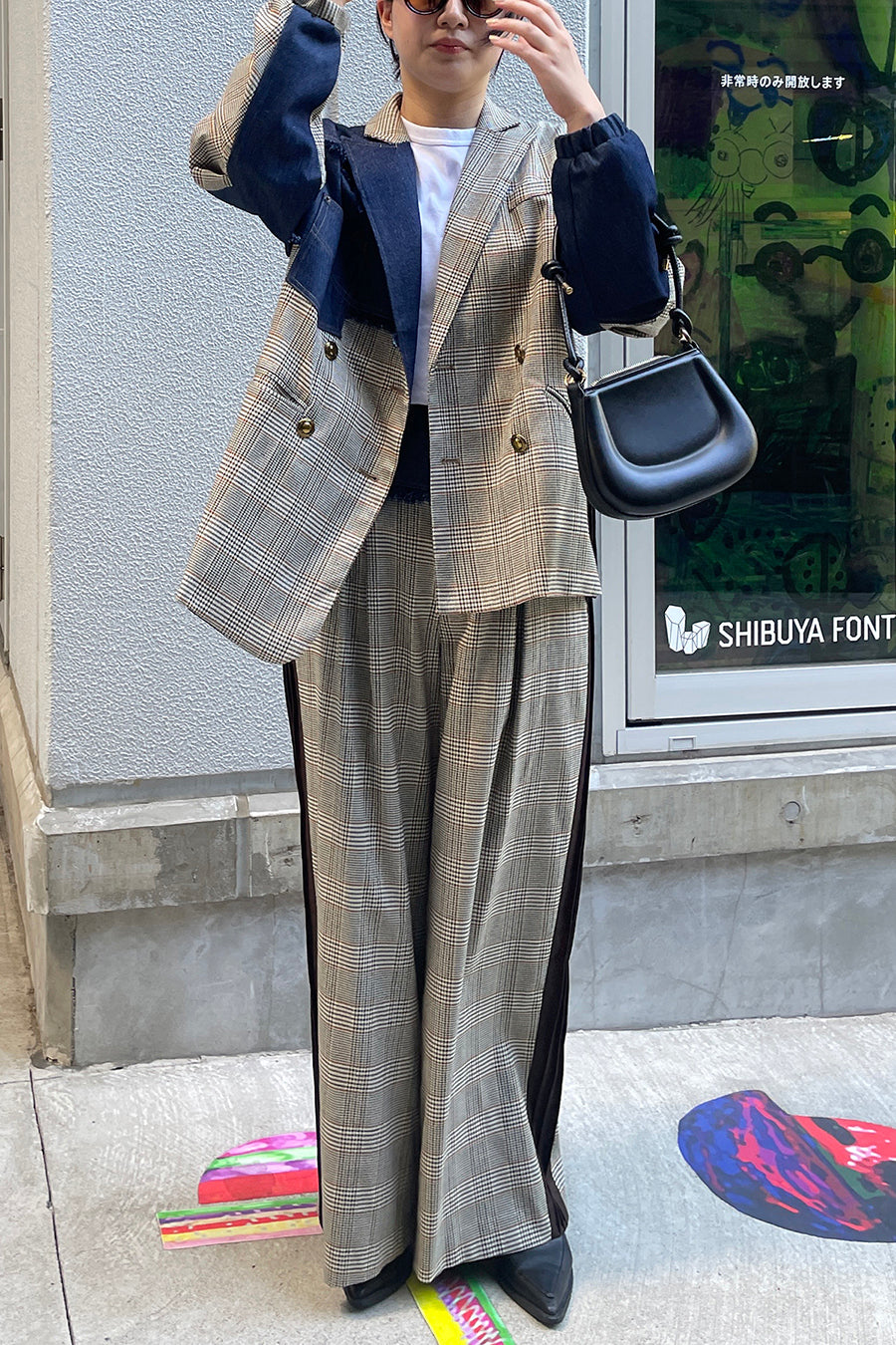 人気のデニムコンビワイドタックパンツ。5ポケットデニムパンツと、マニッシュなチェックやストライプのハンサムパンツをリメイクしたようなデザイン。今シーズンは両サイドに別布の3本ピンタックラインを太めに入れ、サイドラインを強調したデザインにアップデート。タックが広がるワイドラインが綺麗なラインを作る。裏付き。ポケット付き。