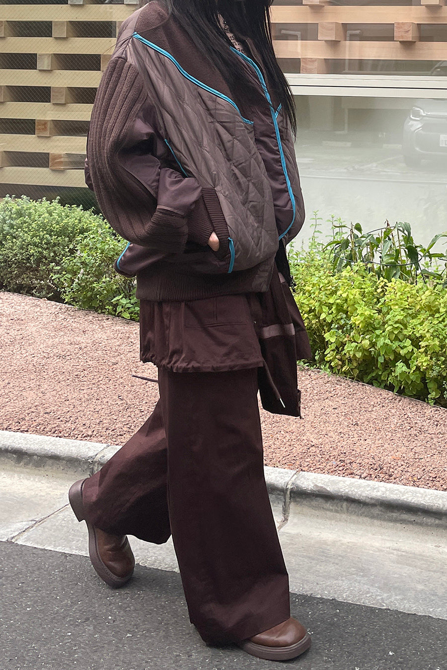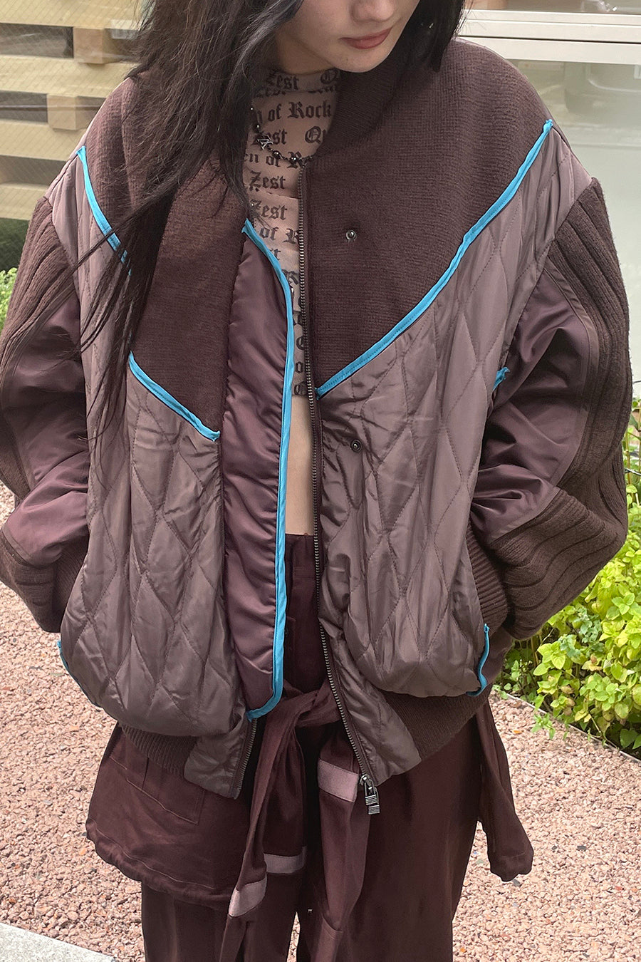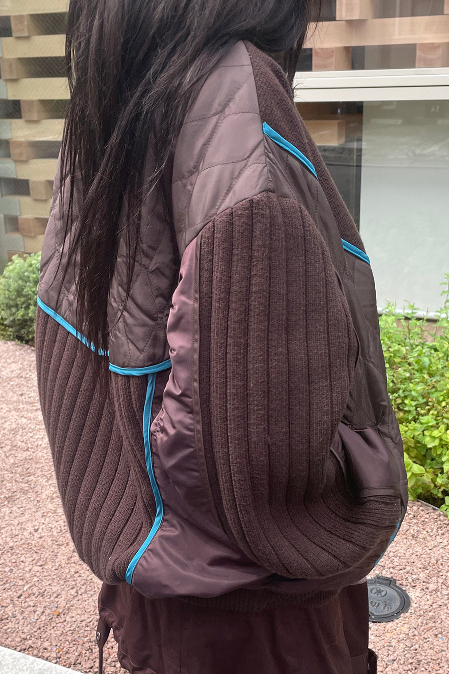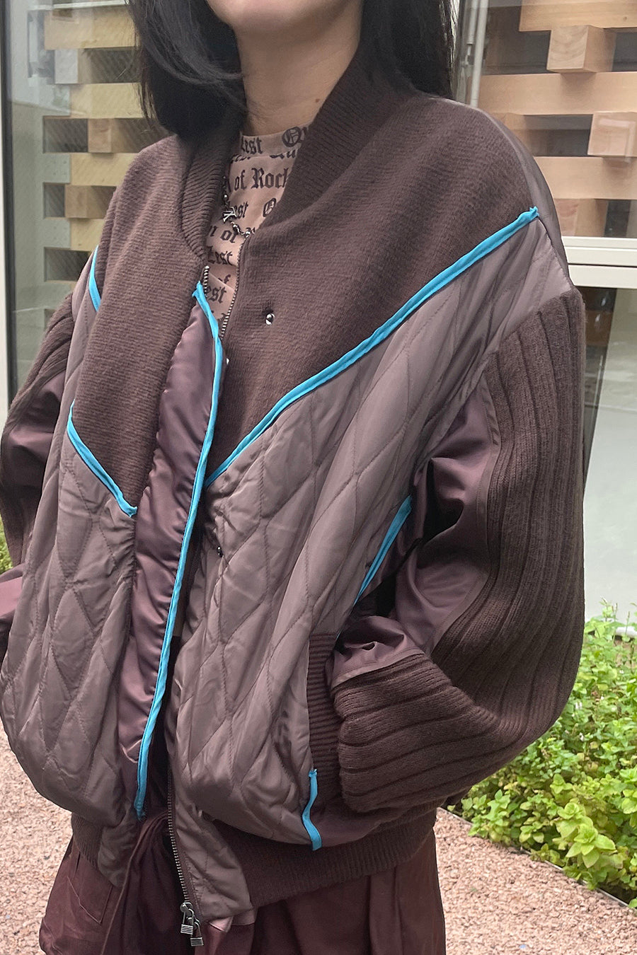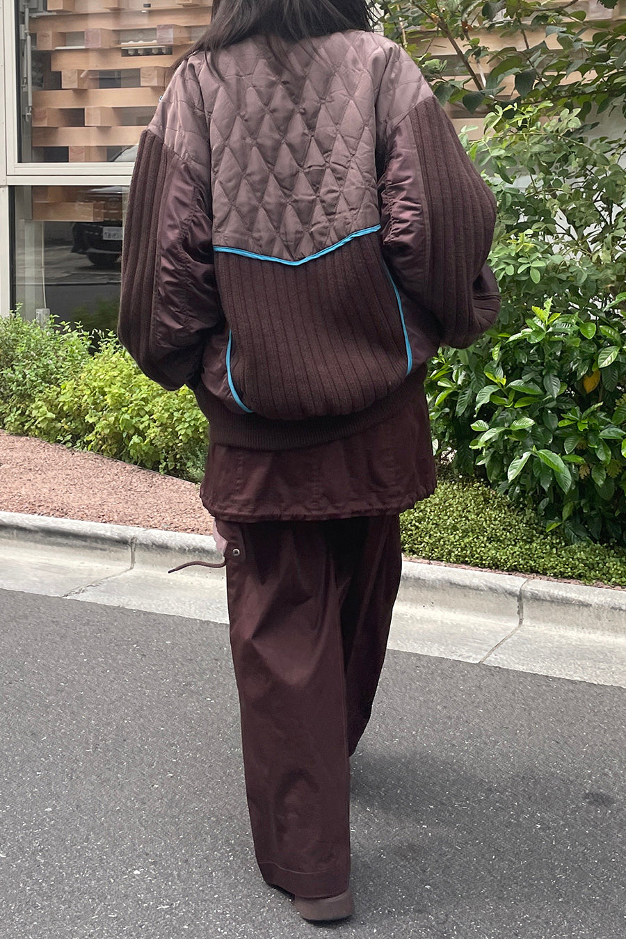 ワイドリブやミラノリブなどのニットパーツとキルティングパーツ、それにナイロンタフタを組み合わせた存在感のあるブルゾン。異素材感の対比と、何より配色パイピングが目を惹くアイテム。後ろ着丈が少し長く、ゆったりめのサイジングなので、ラフにさらりと着こなしやすい。季節が進んだ冬にも使える中綿入りで、厚手のニットなどの上にも着られる実用性も兼ね備えたアイテム。ポケットの内側は優しい肌触りのフリース素材で手元も温か。