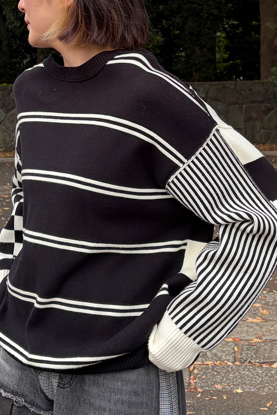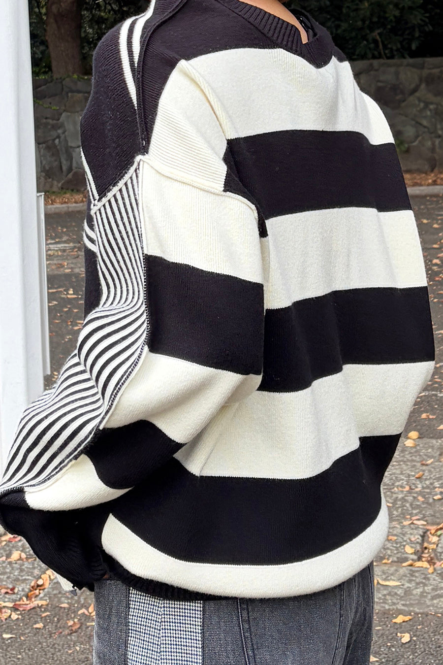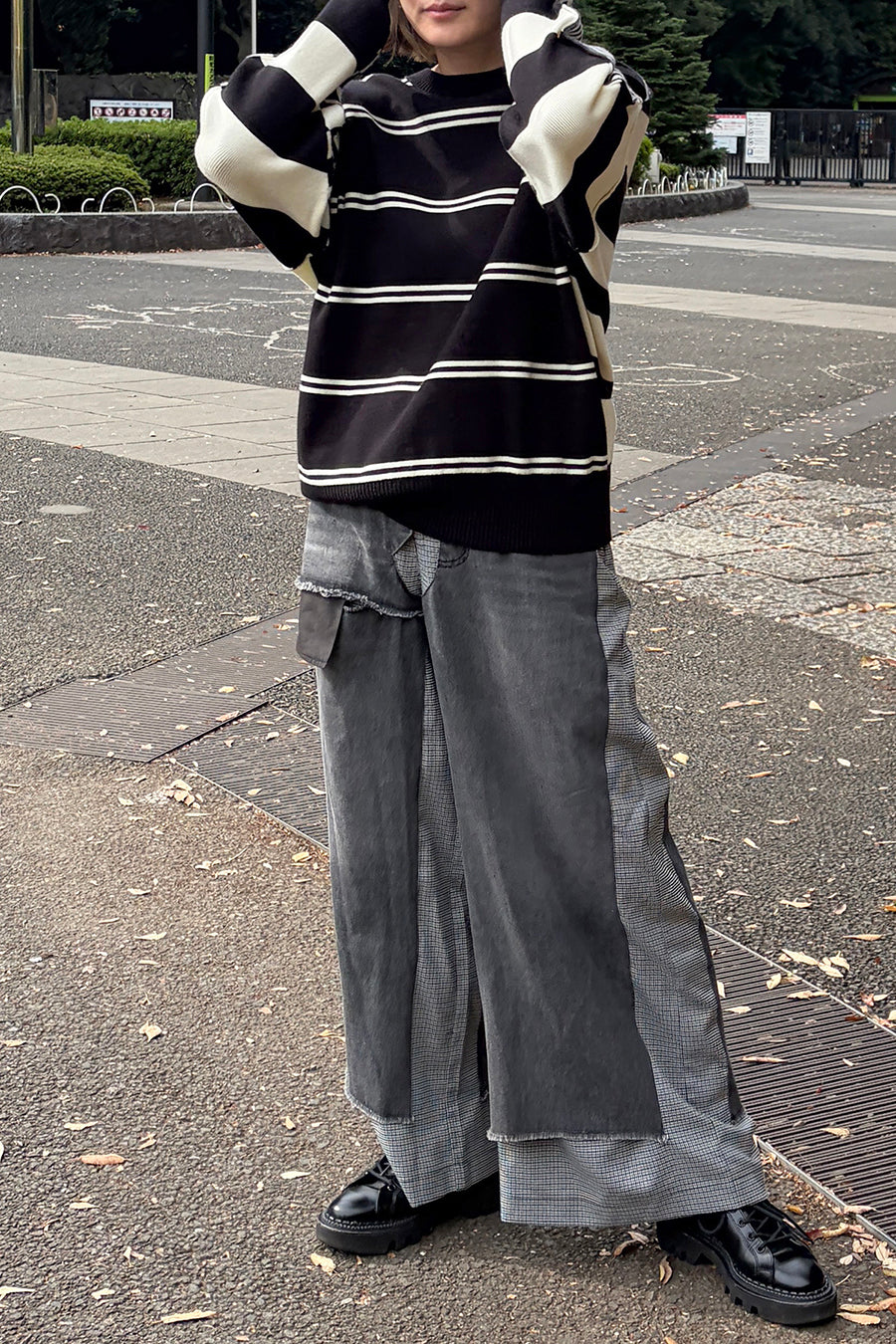身頃の前後が違う太ボーダーで、袖は右がブロックチェック、左はストライプの4種類の柄をコンビネーションし、更に配色も6色と多様したマルチボーダーカラーニット。ポップなマルチカラーが、遊びのあるアイテムで、他にはないデザインが目を惹く。リンキングの糸端は敢えて表に出して抜け感のある雰囲気に仕上げている。レーヨン、ポリエステル、ナイロンの混紡糸の12Gゴム編みで、もちもちした肌触りは、心地良く人気な実績のある糸を使用。キックバックも良く、型崩れしにくい。