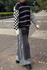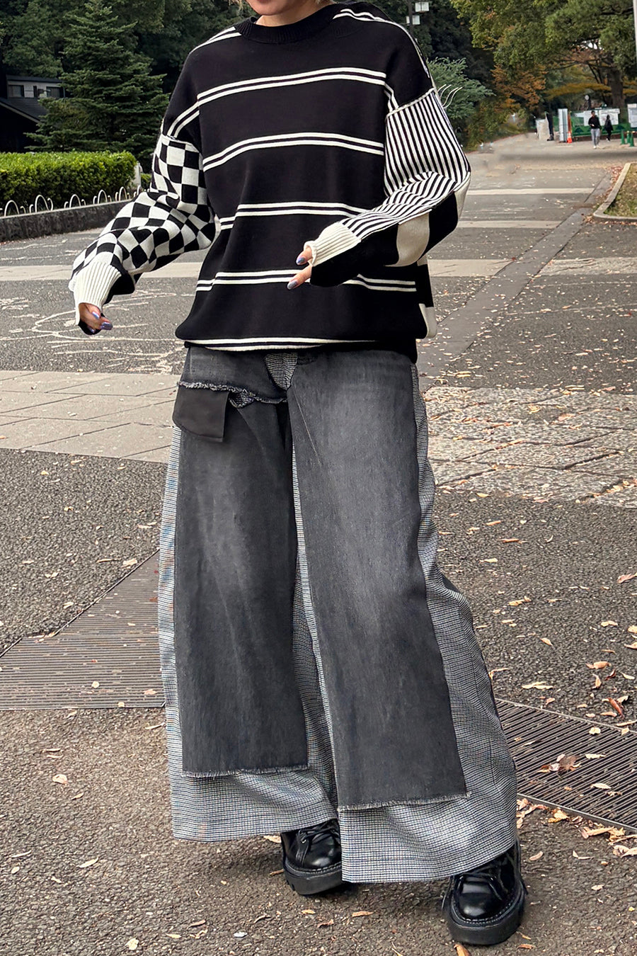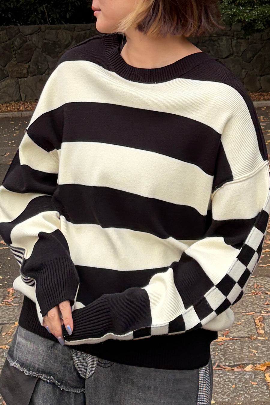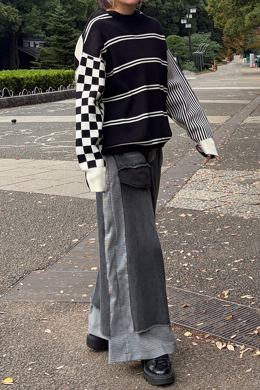 身頃の前後が違う太ボーダーで、袖は右がブロックチェック、左はストライプの4種類の柄をコンビネーションし、更に配色も6色と多様したマルチボーダーカラーニット。ポップなマルチカラーが、遊びのあるアイテムで、他にはないデザインが目を惹く。リンキングの糸端は敢えて表に出して抜け感のある雰囲気に仕上げている。レーヨン、ポリエステル、ナイロンの混紡糸の12Gゴム編みで、もちもちした肌触りは、心地良く人気な実績のある糸を使用。キックバックも良く、型崩れしにくい。
