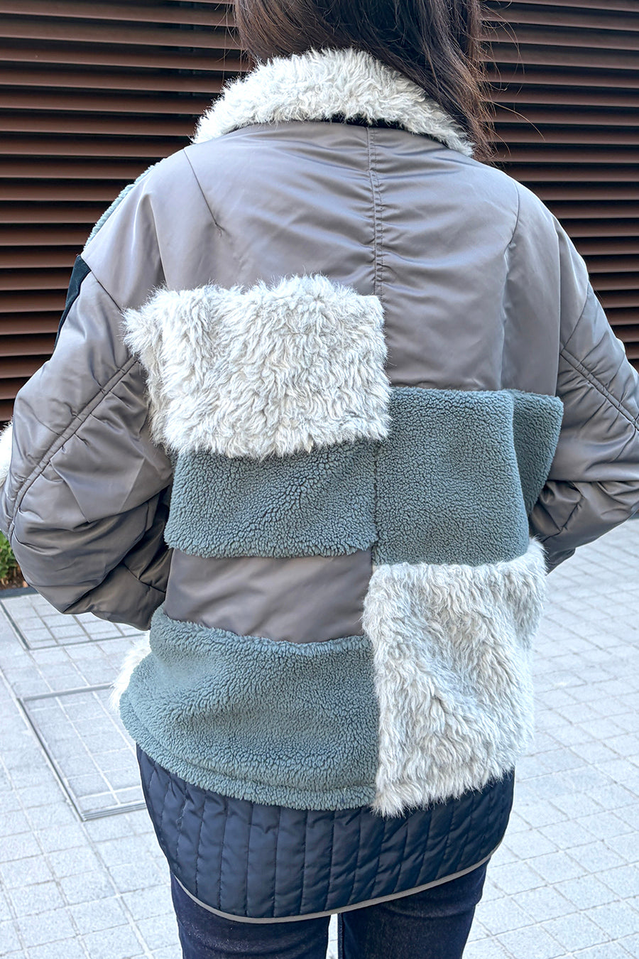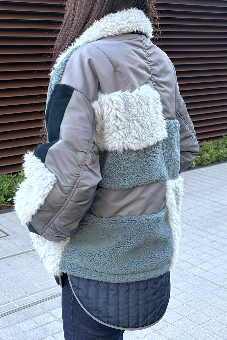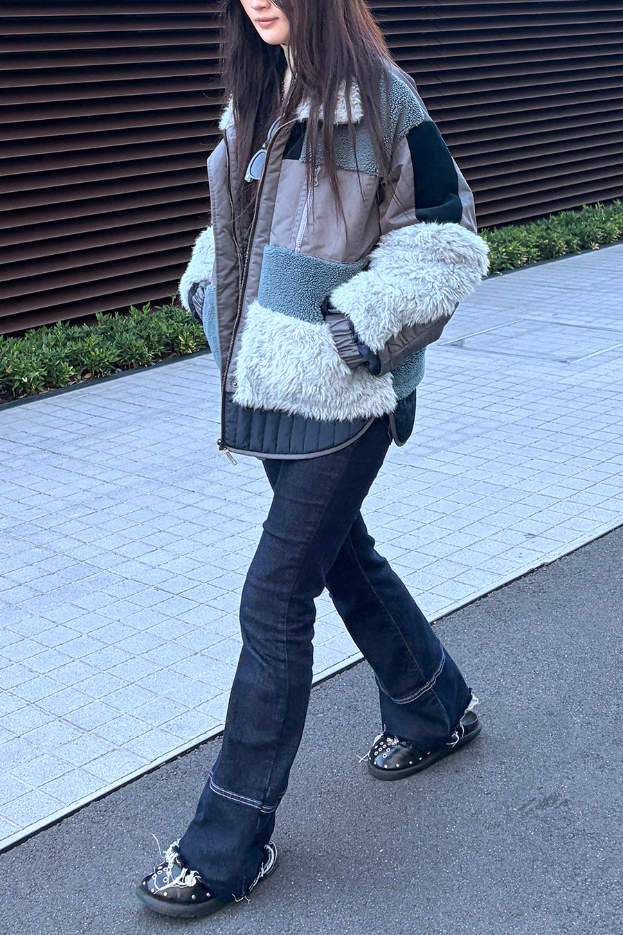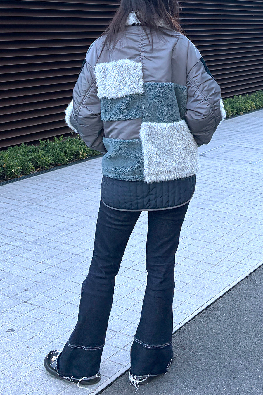 ナイロンタフタをベースに、エコファー、ボア、キルティング、コーデュロイなど、様々な素材を組み合わせたブルゾン。パッチワーク風にランダムに切り替え、リメイクのような要素もある、インパクトのある1着。シルエット的には適度なサイズ感で、ラフにさらりと着こなしやすい。季節が進んだ冬にも使える中綿入りで、厚手のニットなどの上にも着られる実用性も兼ね備えたアイテム。衿の内側は暖かいエコファー、ポケットの内側は肌触りの良いフリース素材など、細部にもこだわったアイテム。