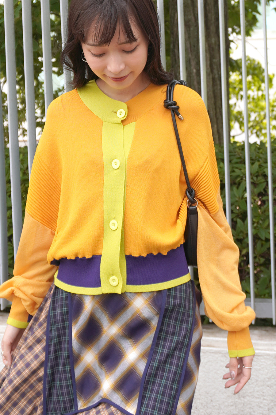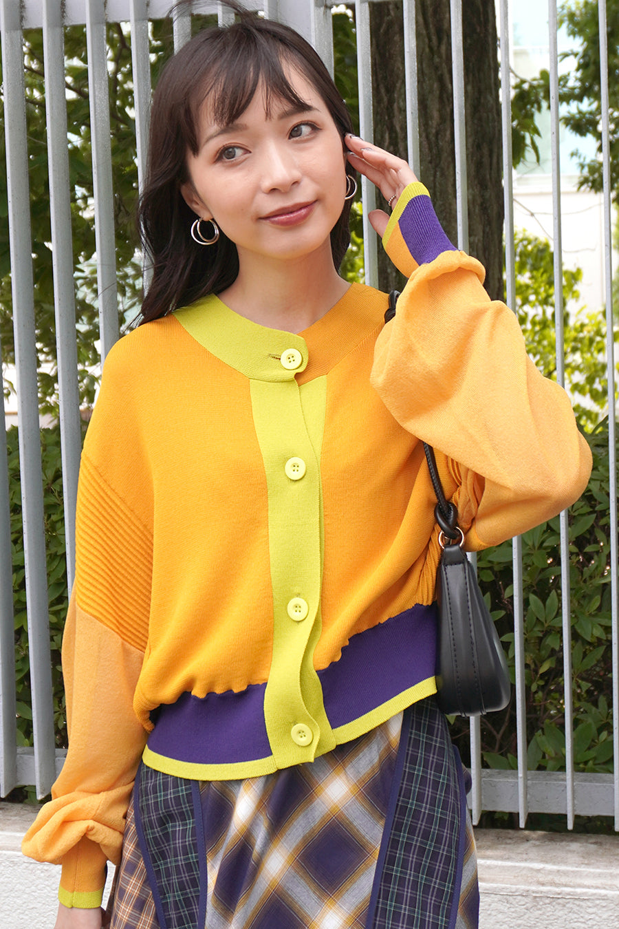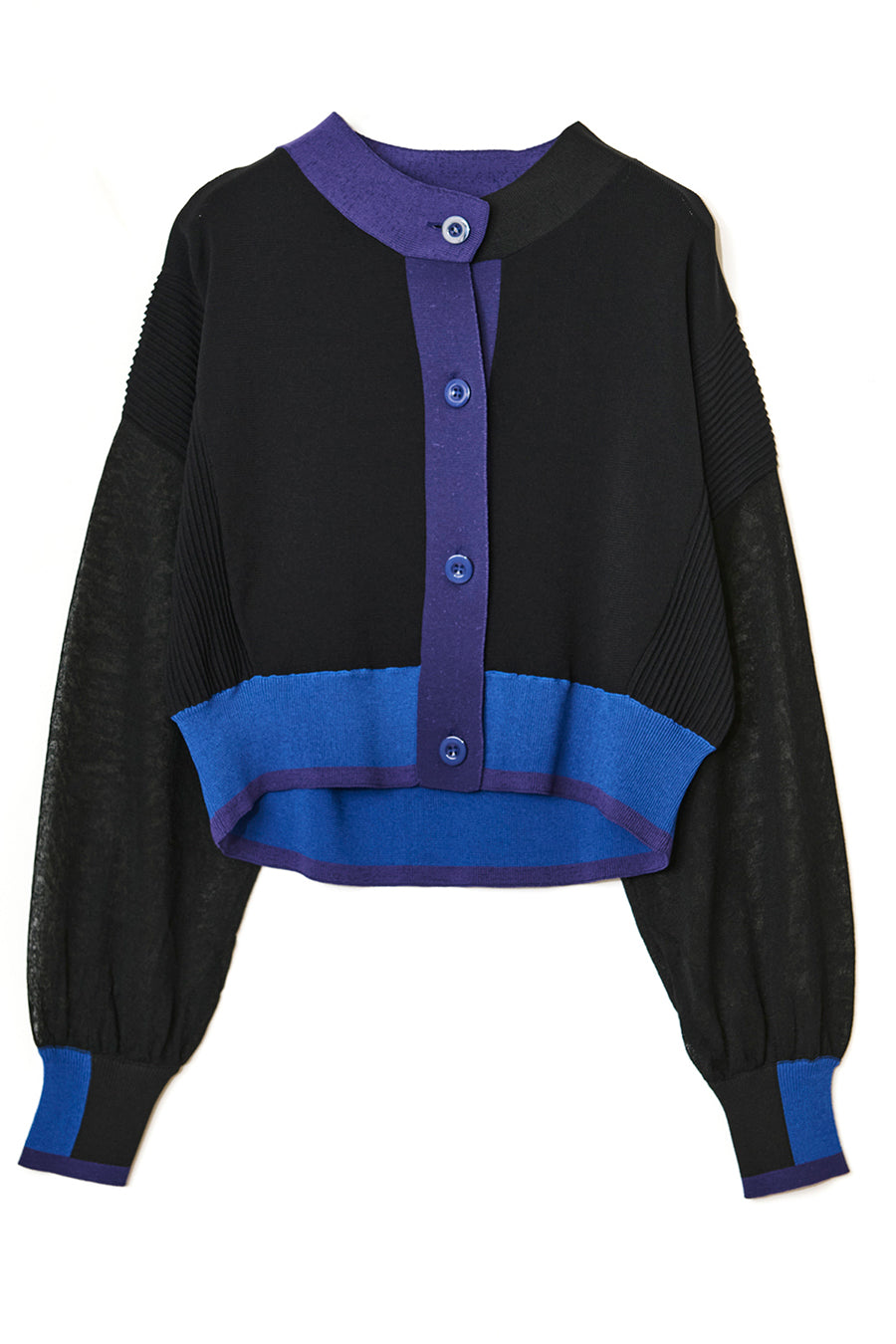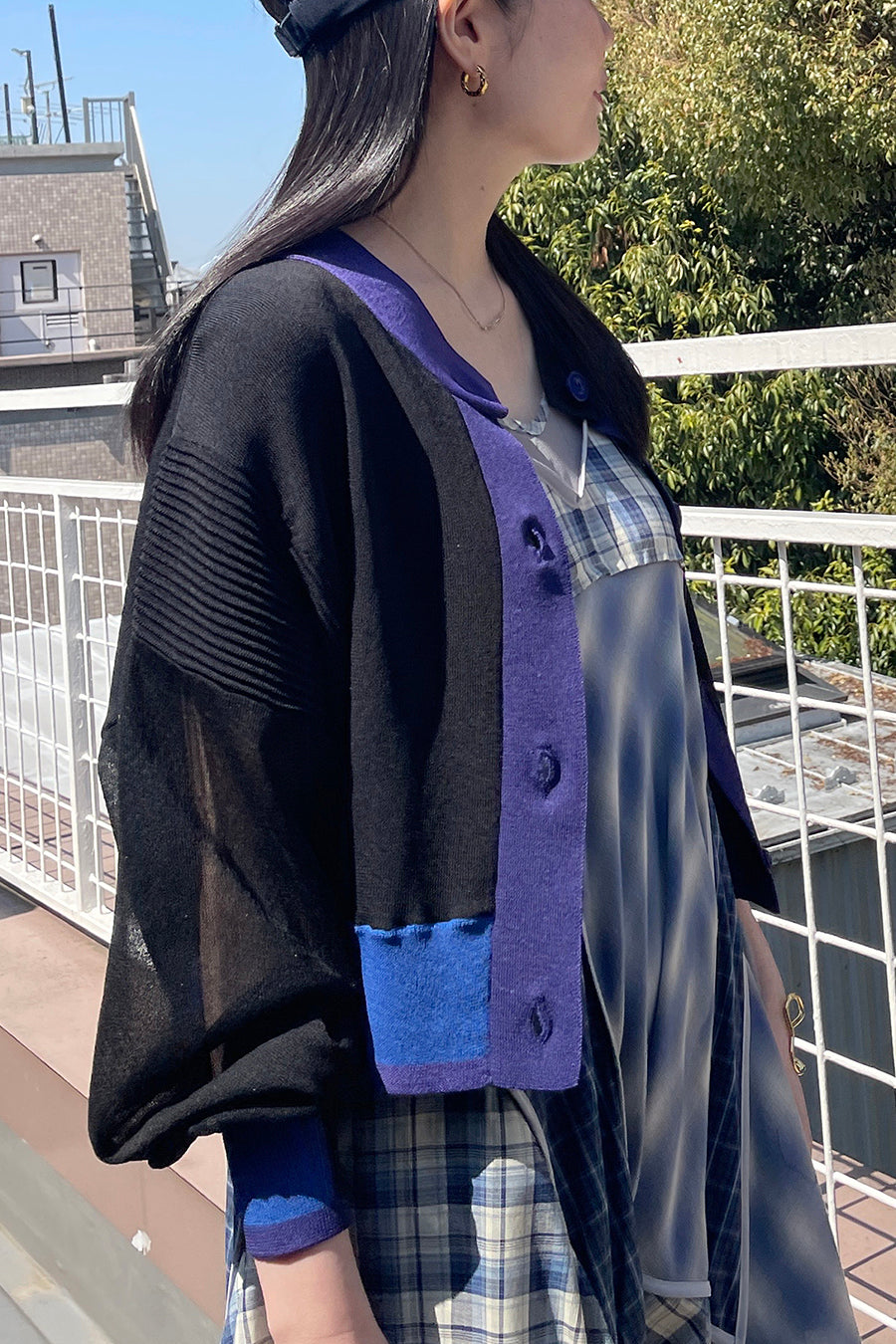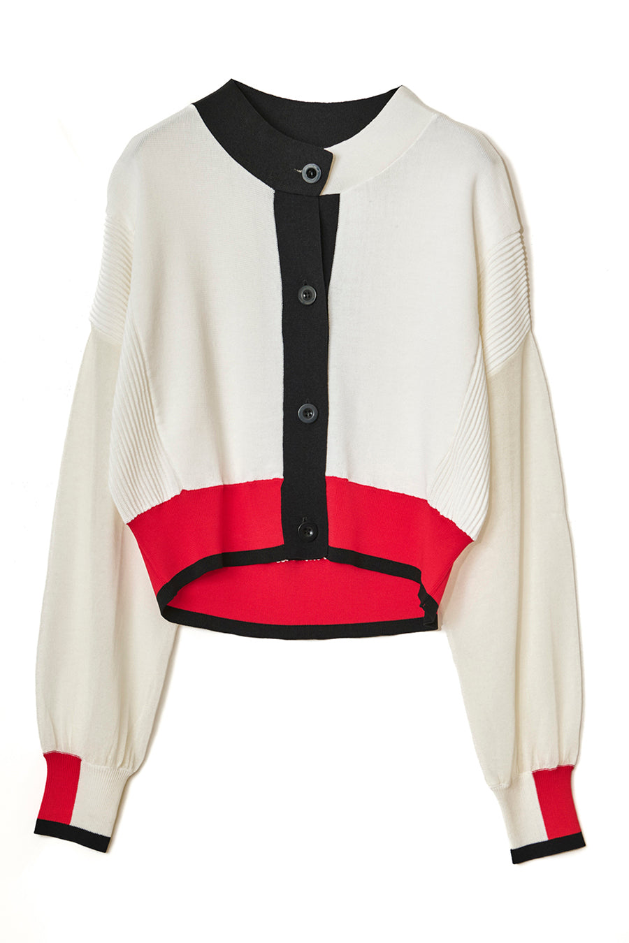 4色糸を使用したカラーブロックのクルー襟のショートカーディガン。太い前立てのみアシンメトリー配色なのがポイント。