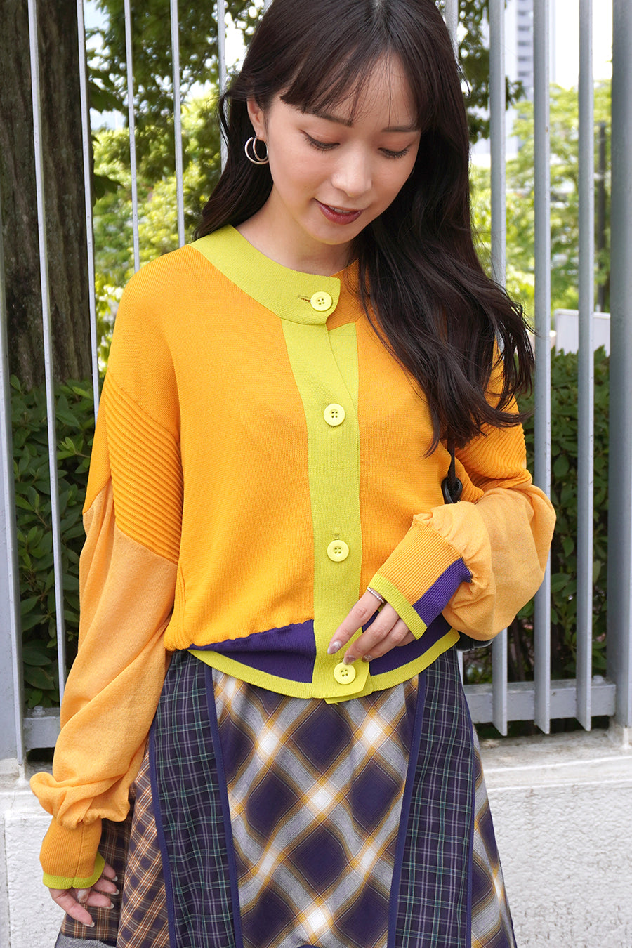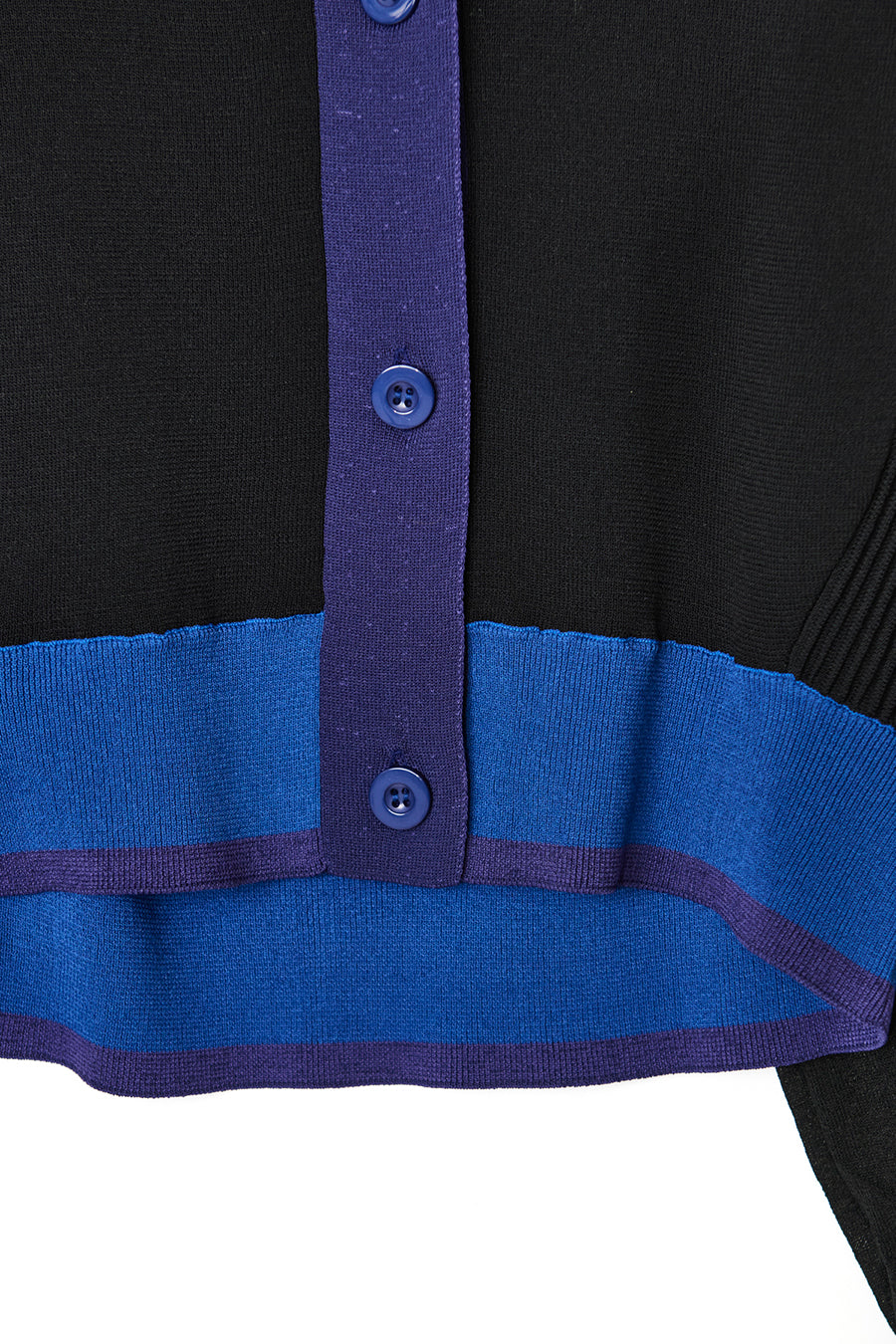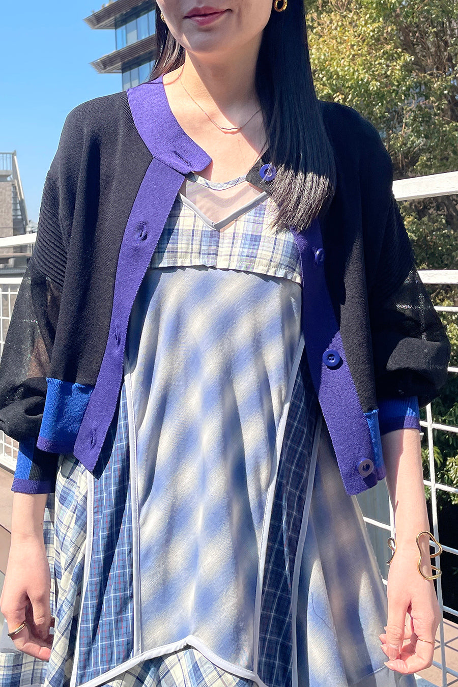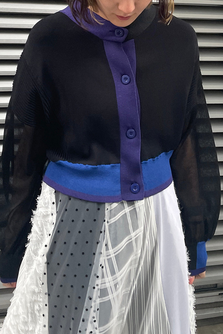 4色糸を使用したカラーブロックのクルー襟のショートカーディガン。太い前立てのみアシンメトリー配色なのがポイント。