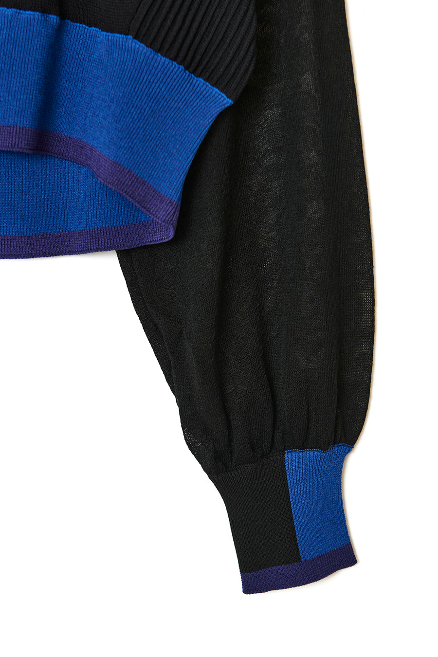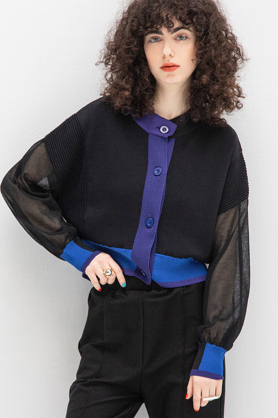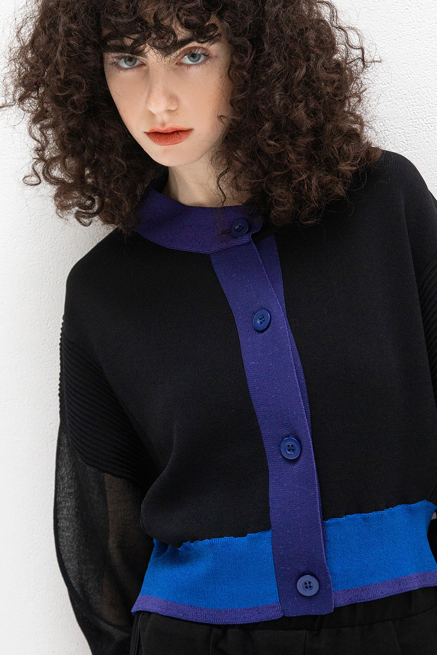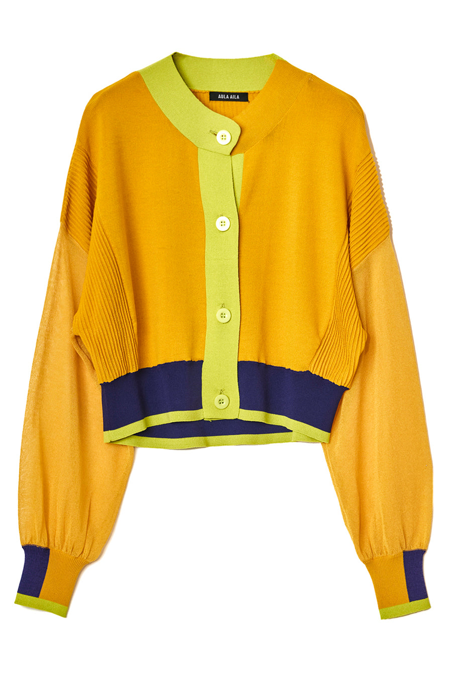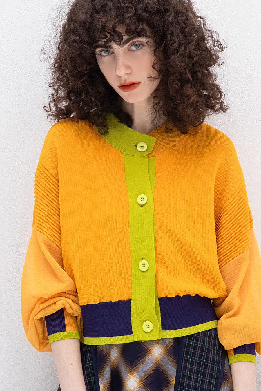 4色糸を使用したカラーブロックのクルー襟のショートカーディガン。太い前立てのみアシンメトリー配色なのがポイント。