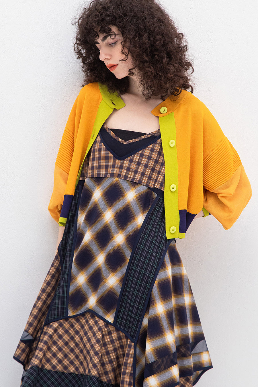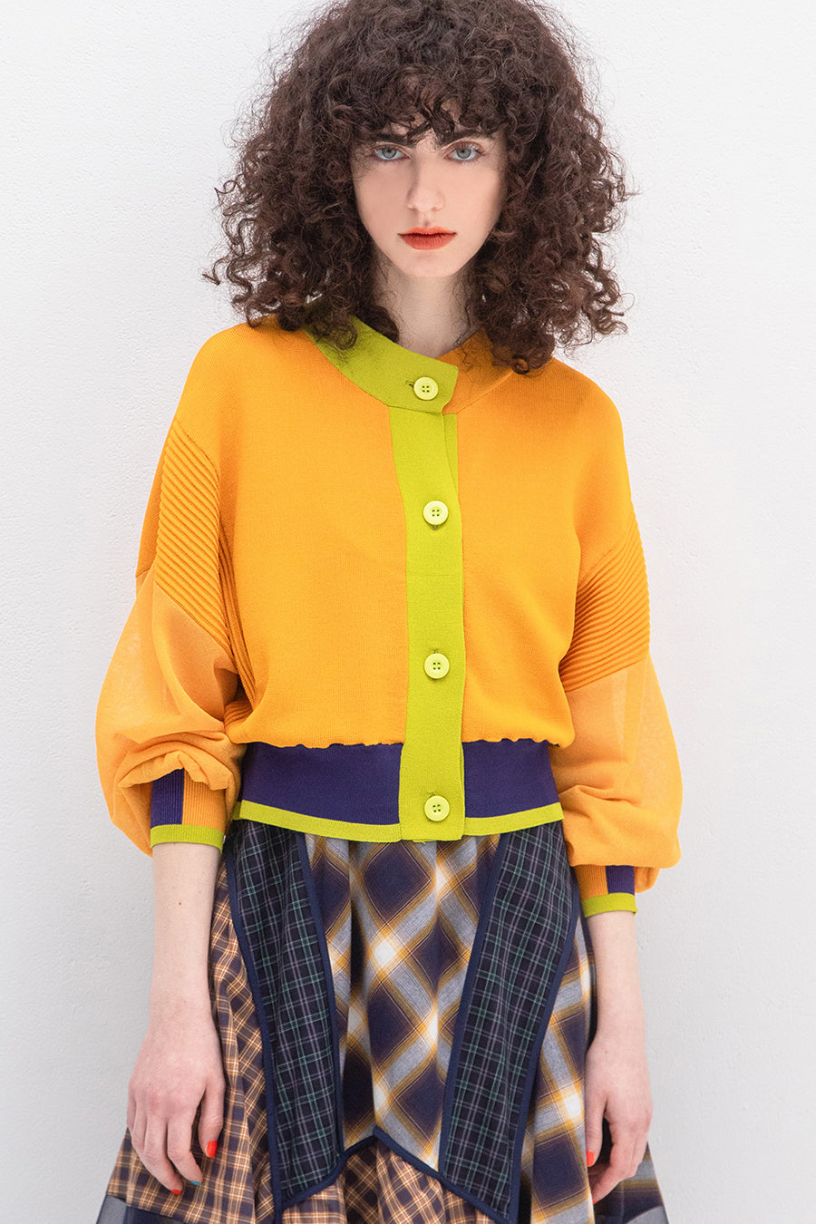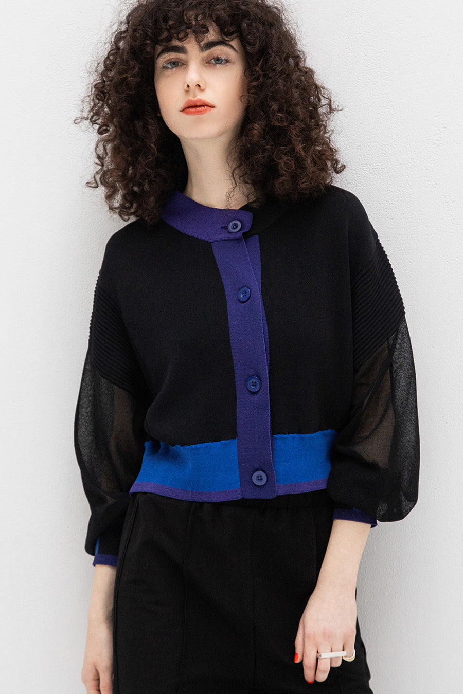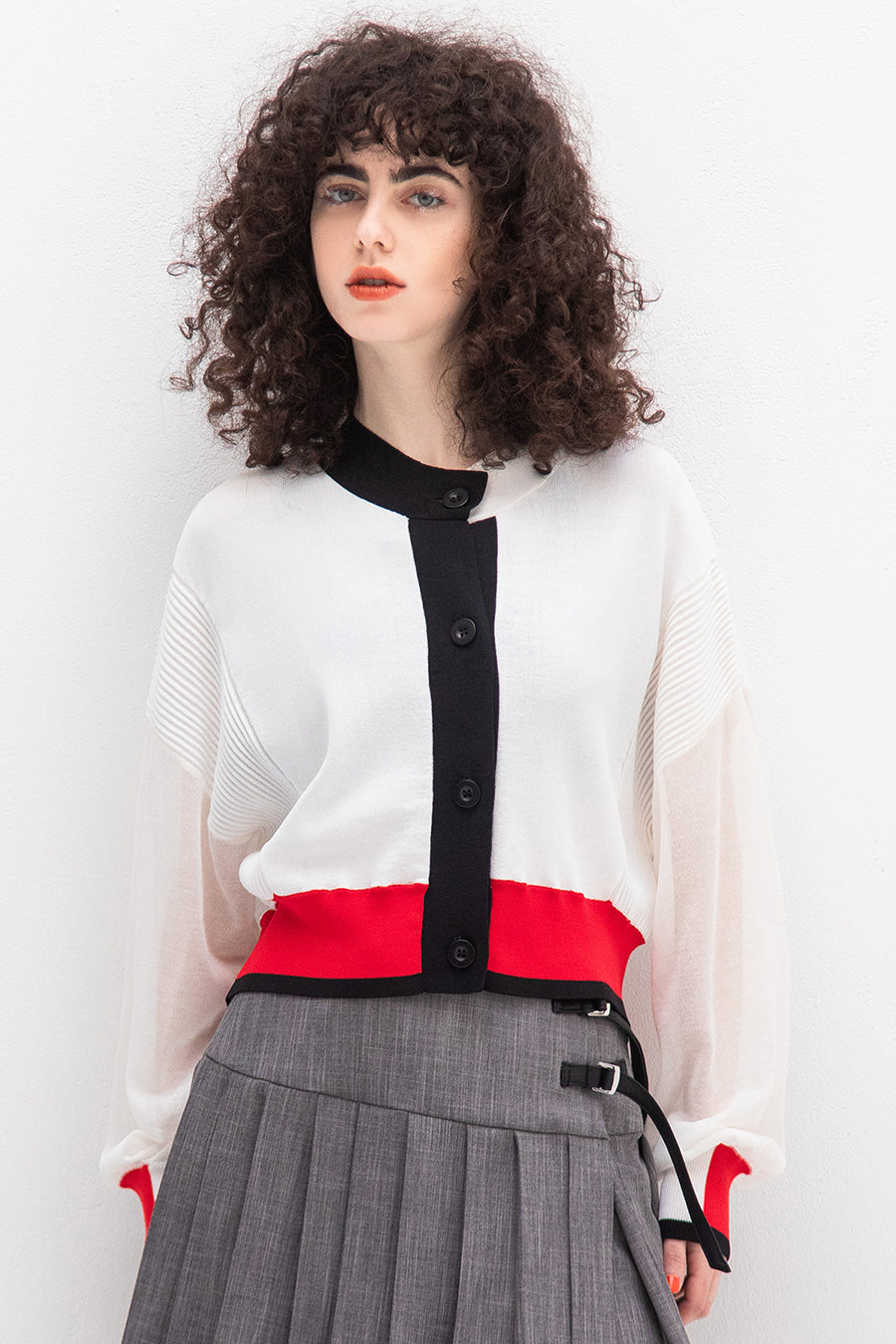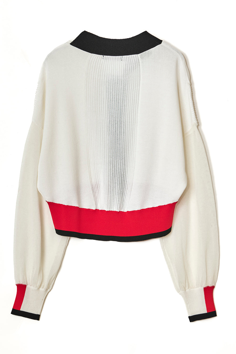 4色糸を使用したカラーブロックのクルー襟のショートカーディガン。太い前立てのみアシンメトリー配色なのがポイント。
