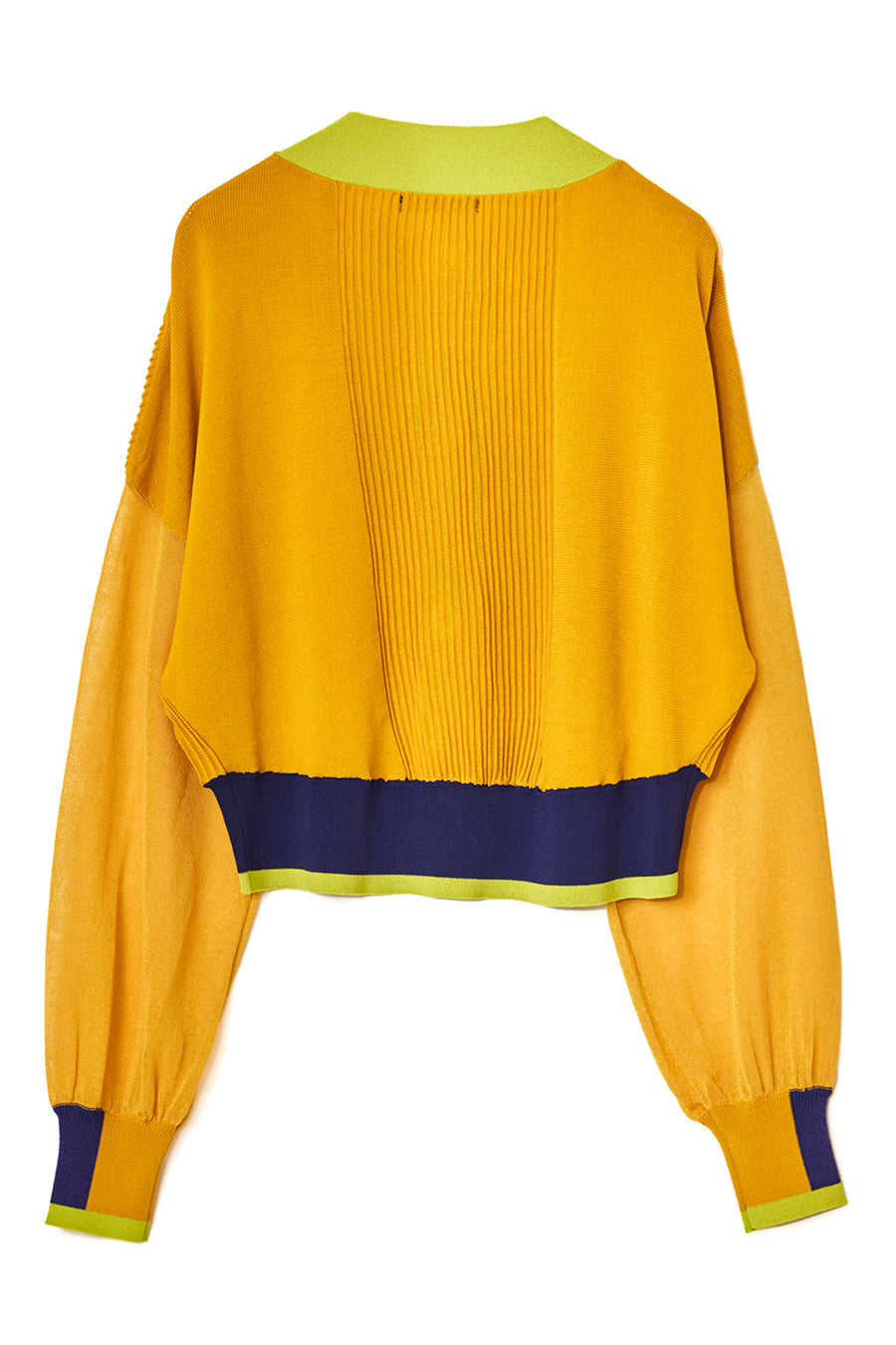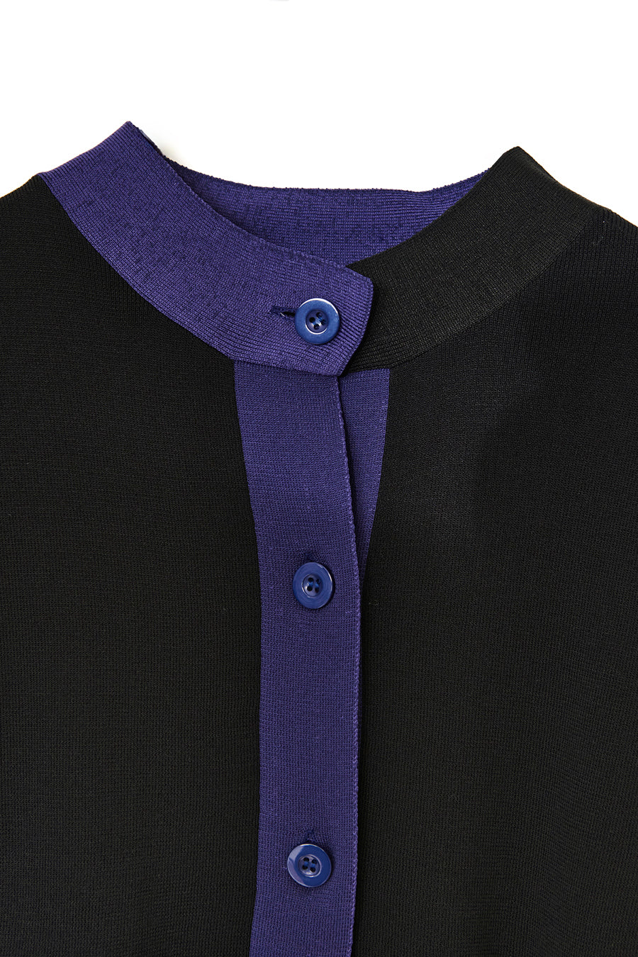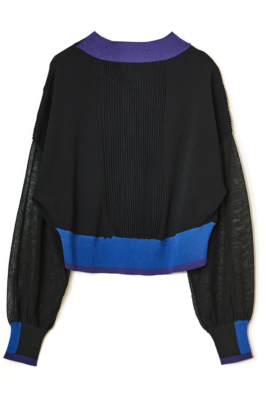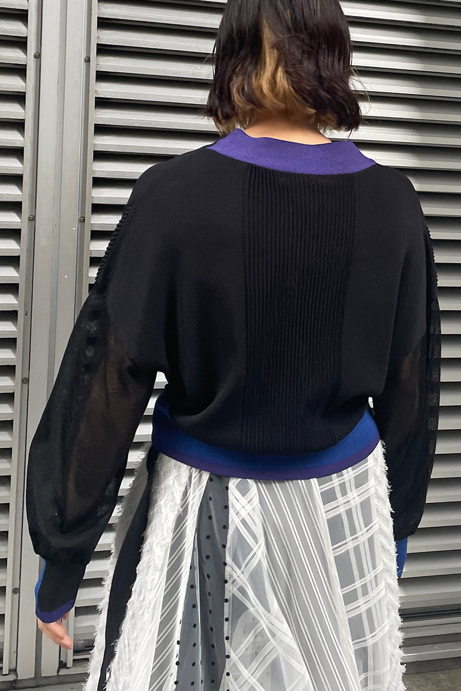 4色糸を使用したカラーブロックのクルー襟のショートカーディガン。太い前立てのみアシンメトリー配色なのがポイント。