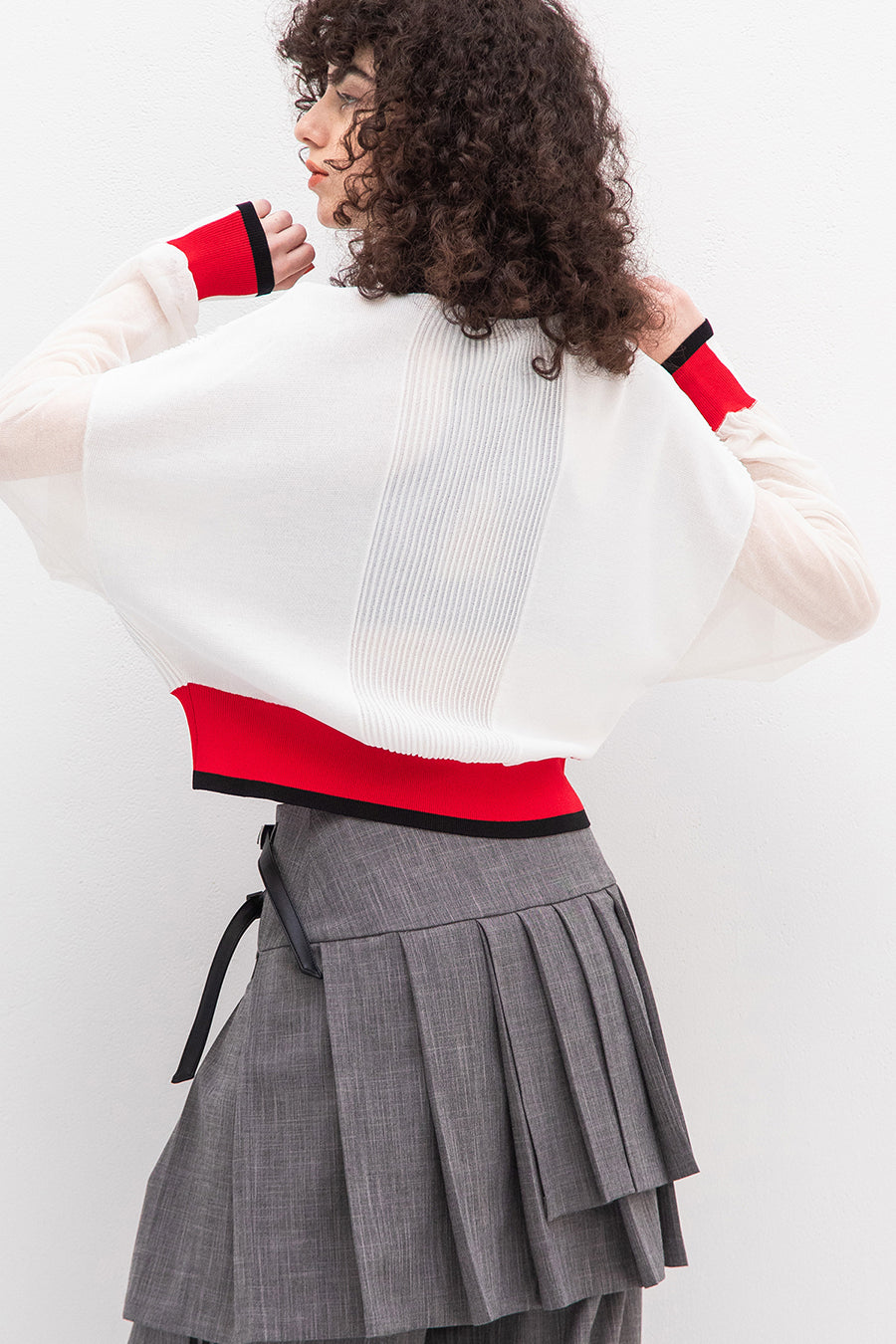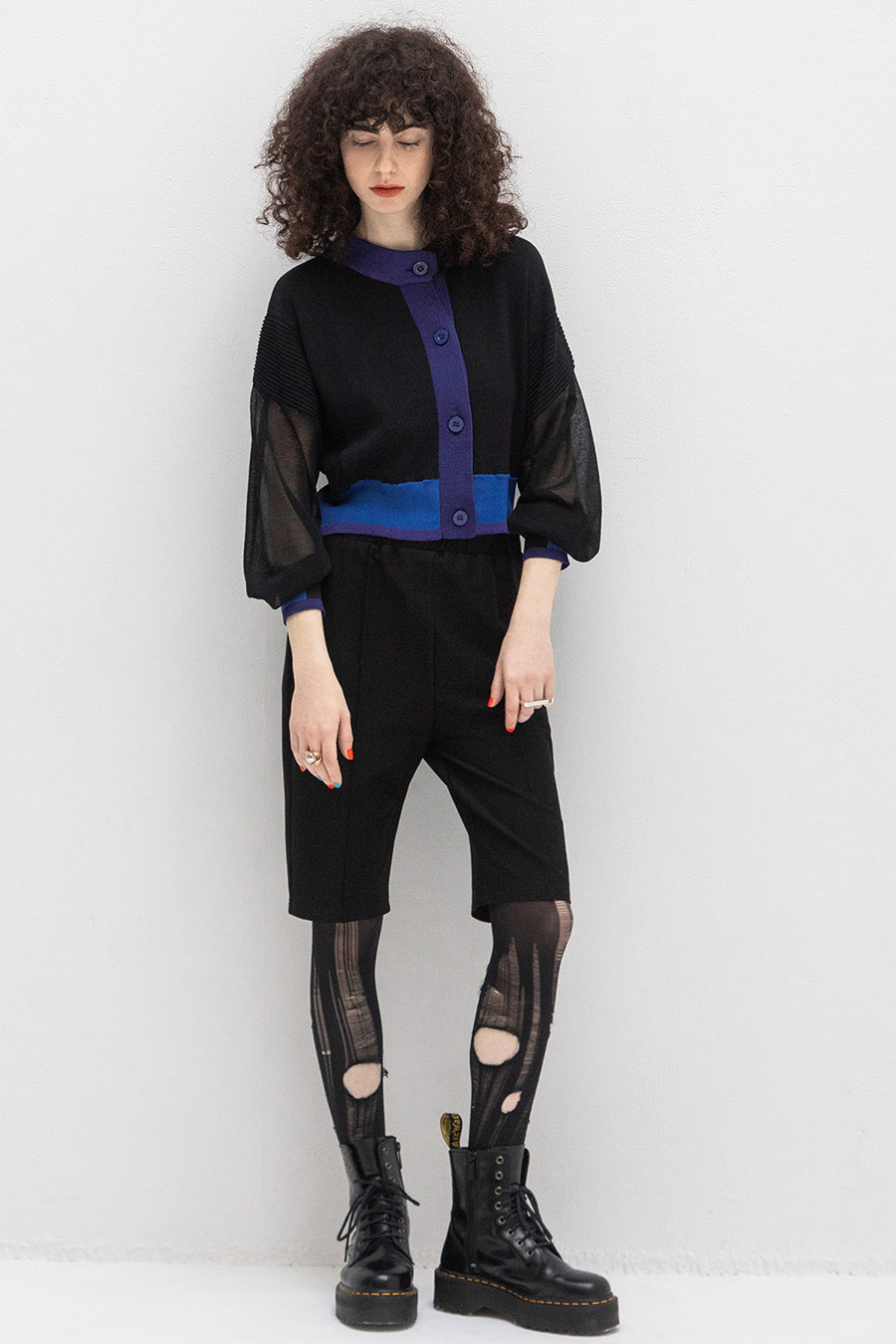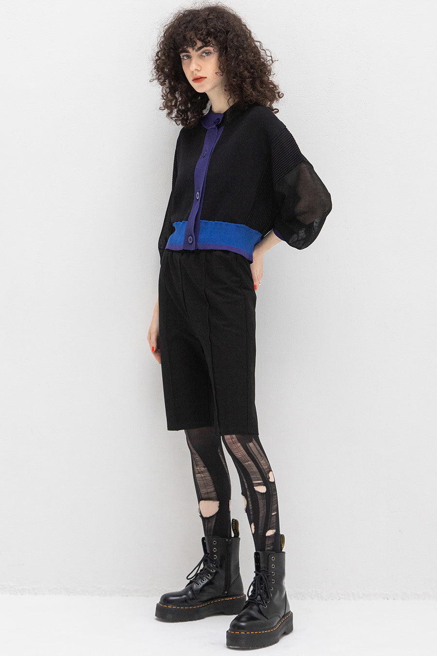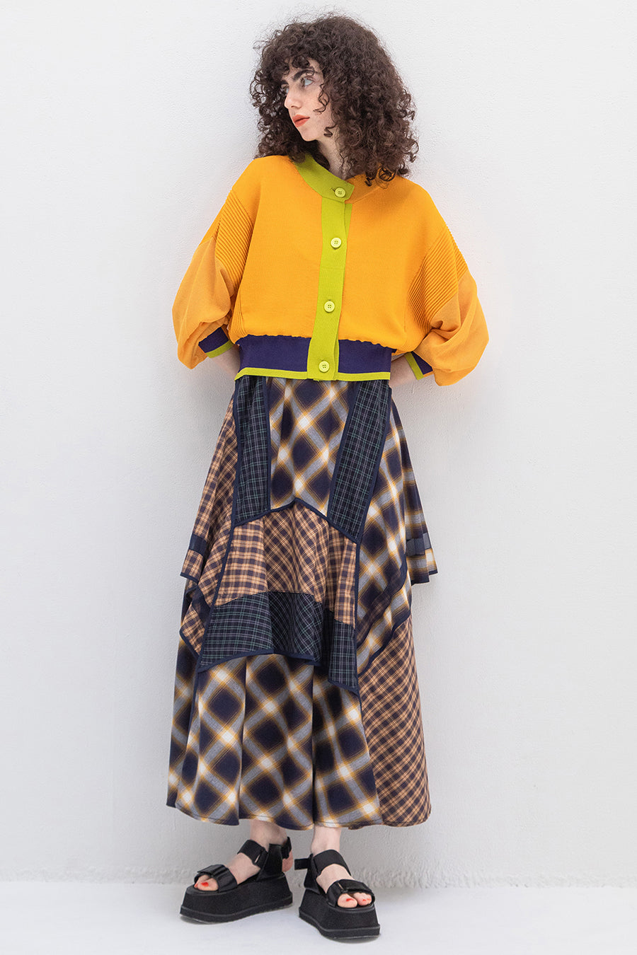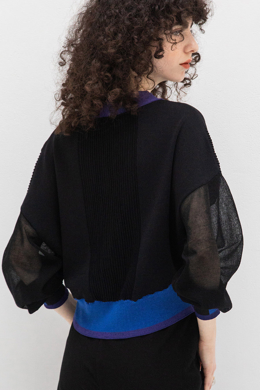 4色糸を使用したカラーブロックのクルー襟のショートカーディガン。太い前立てのみアシンメトリー配色なのがポイント。
