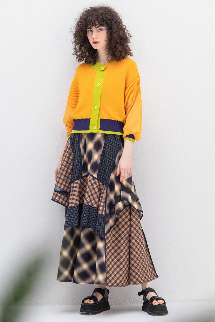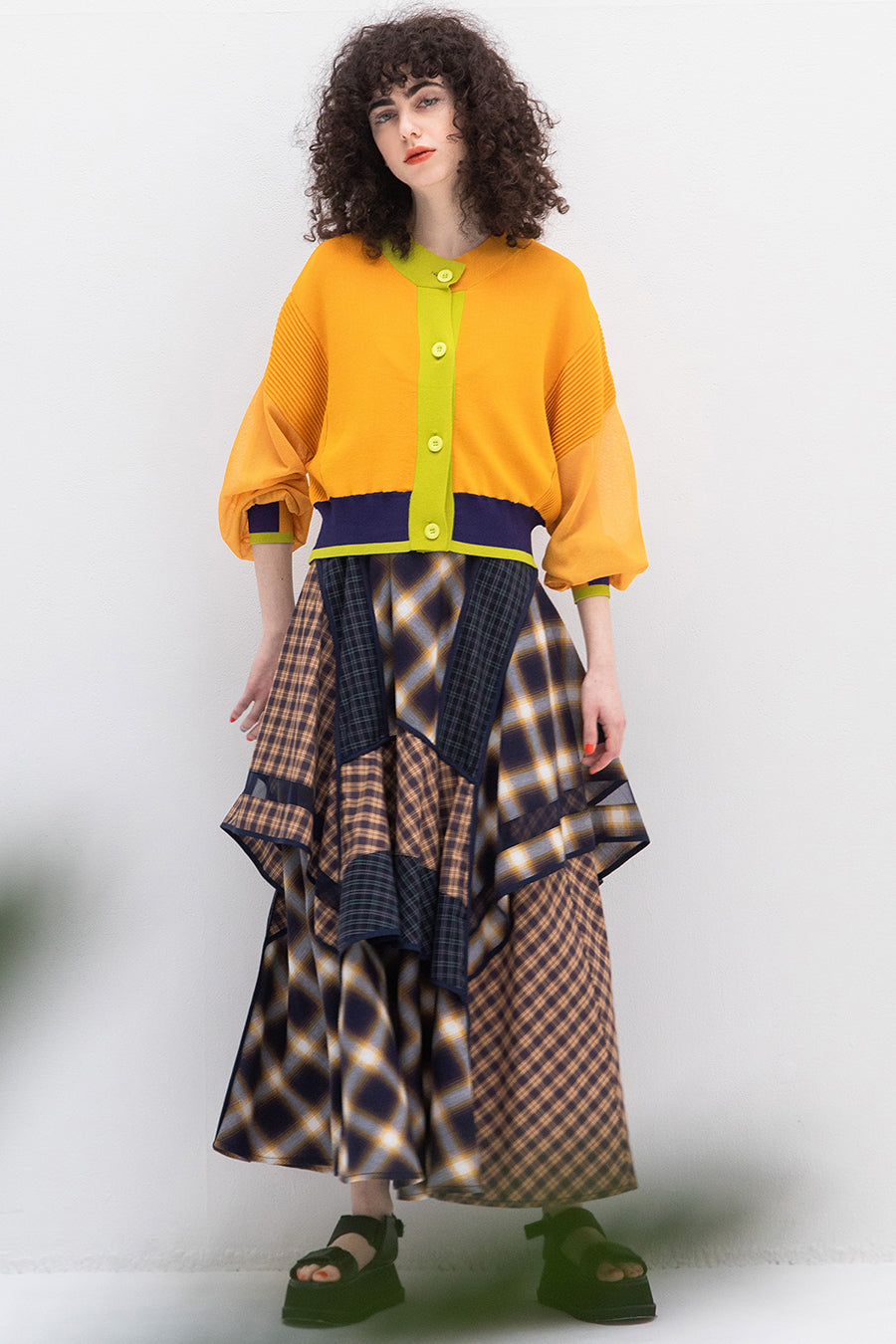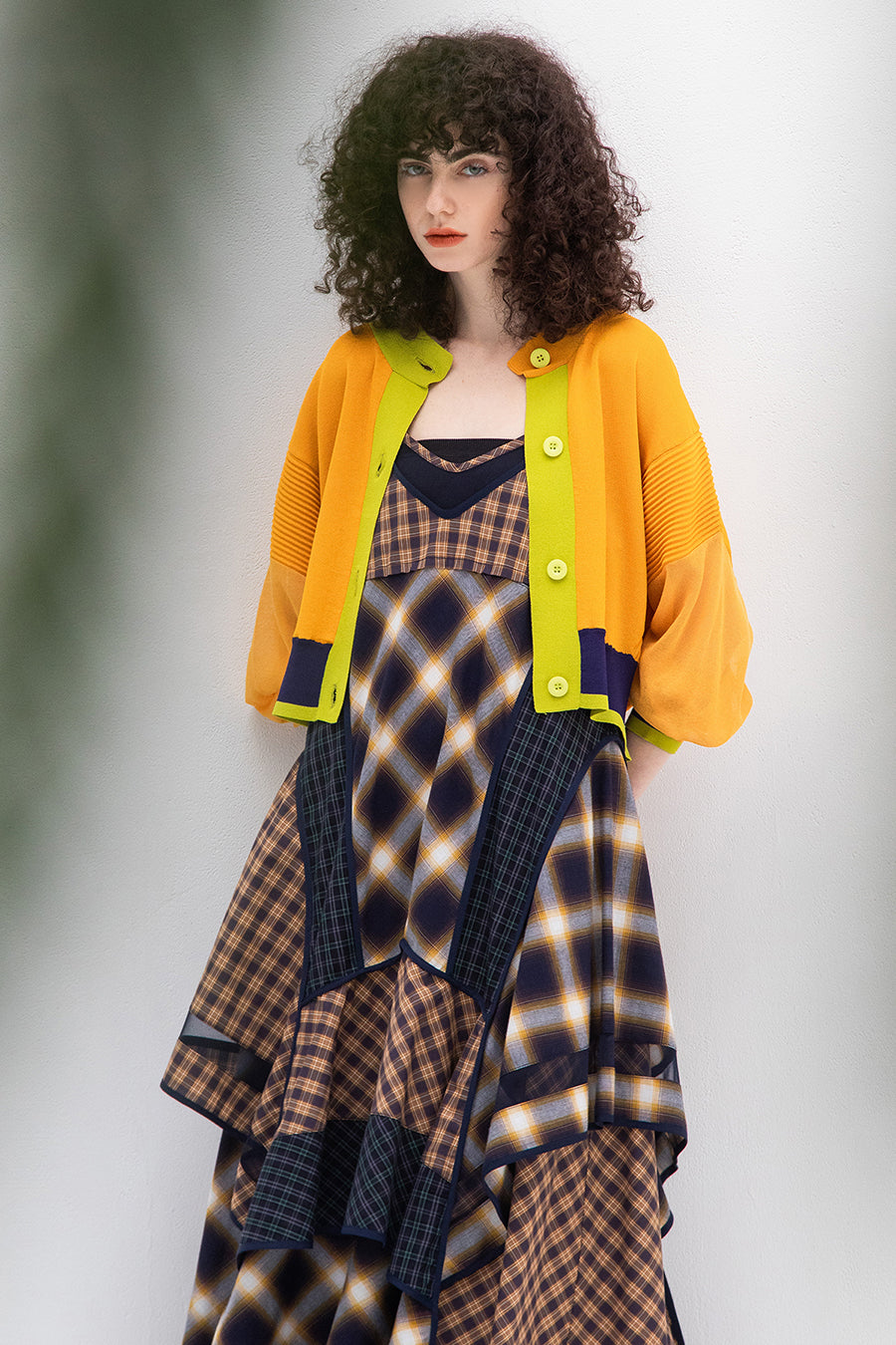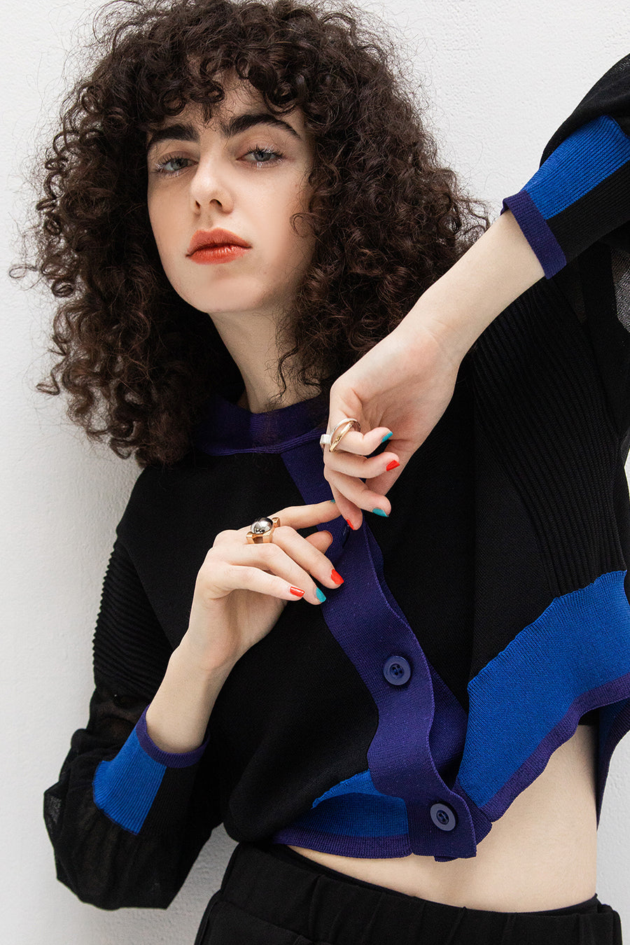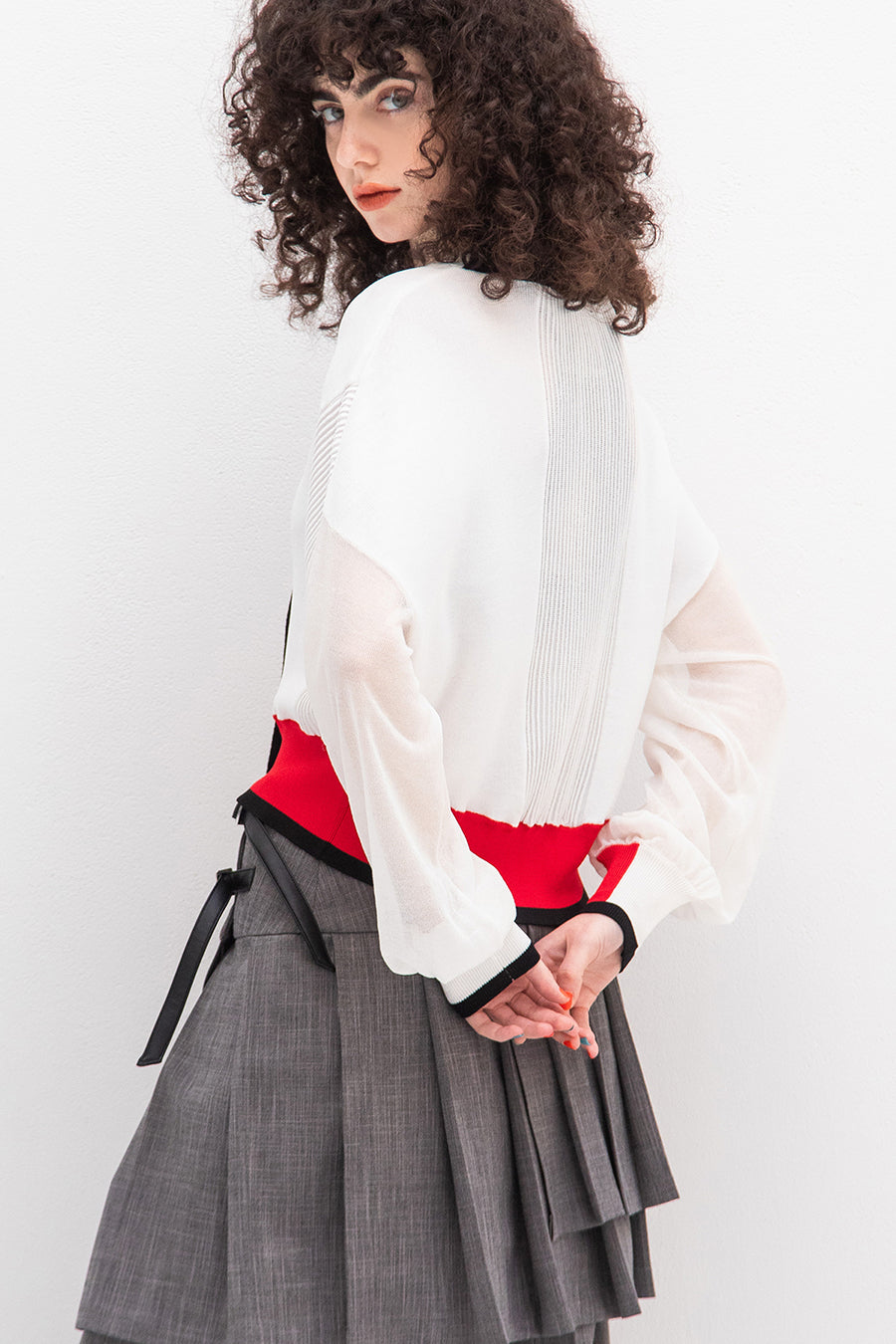 4色糸を使用したカラーブロックのクルー襟のショートカーディガン。太い前立てのみアシンメトリー配色なのがポイント。