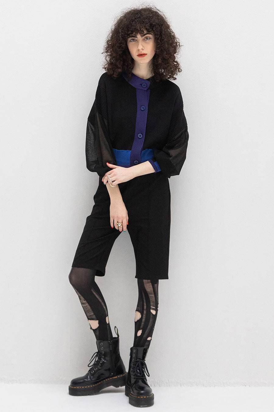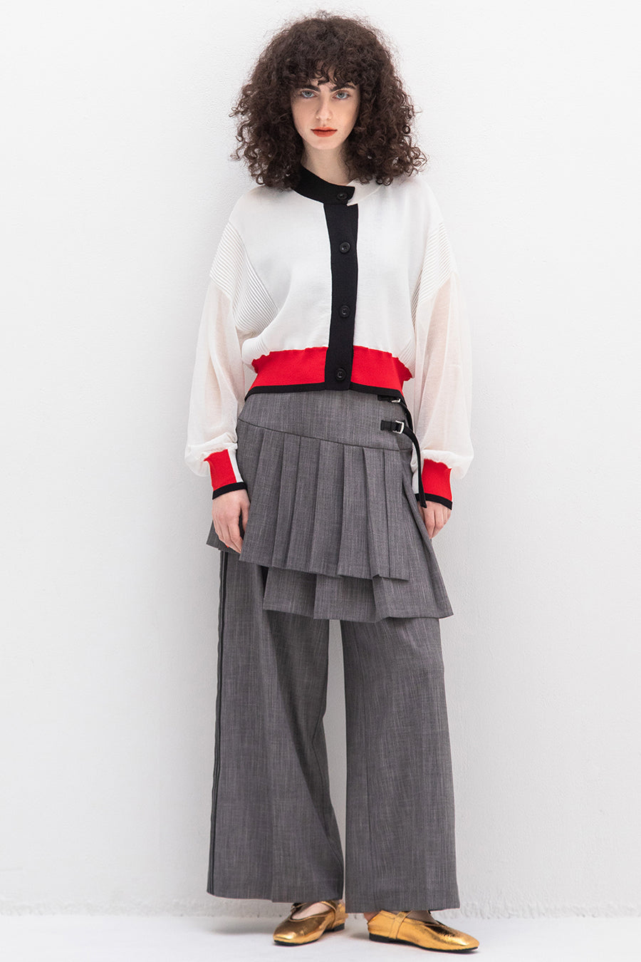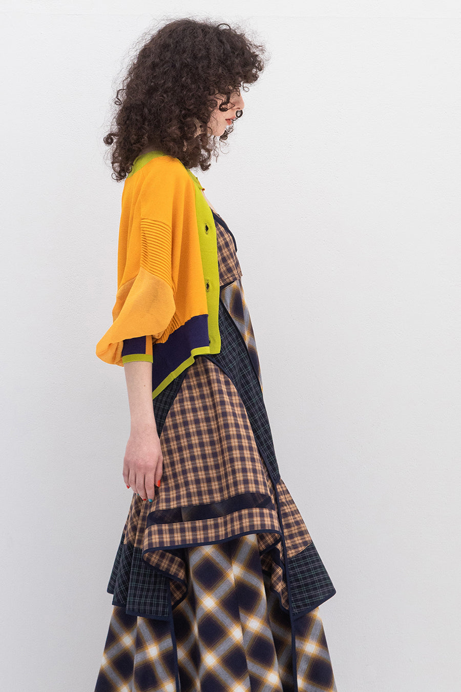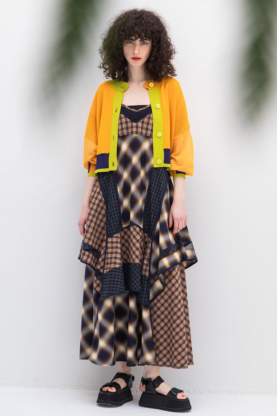 4色糸を使用したカラーブロックのクルー襟のショートカーディガン。太い前立てのみアシンメトリー配色なのがポイント。