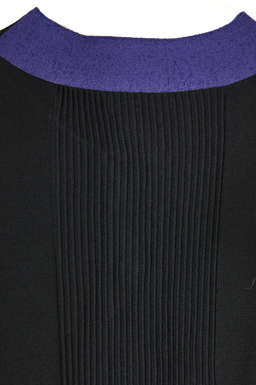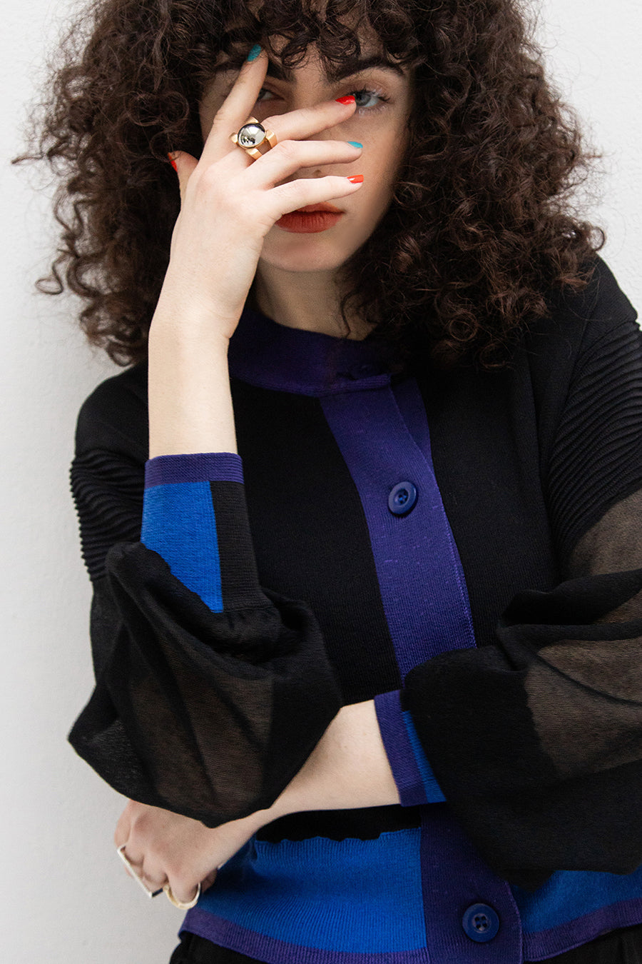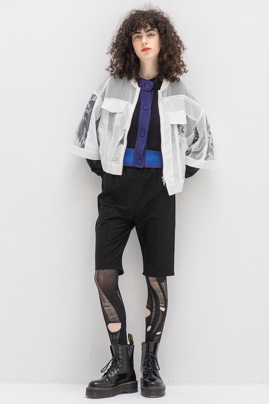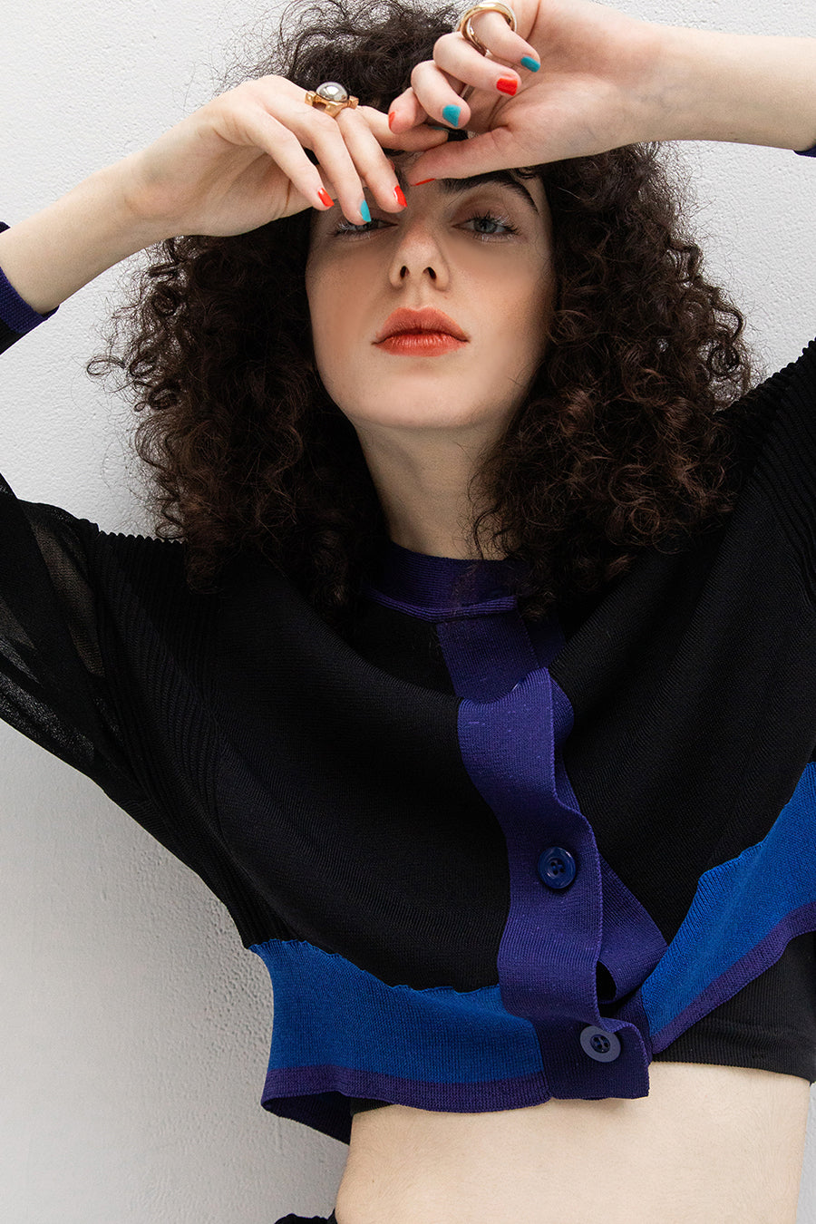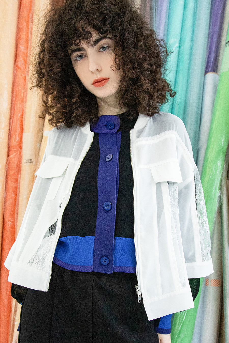 4色糸を使用したカラーブロックのクルー襟のショートカーディガン。太い前立てのみアシンメトリー配色なのがポイント。