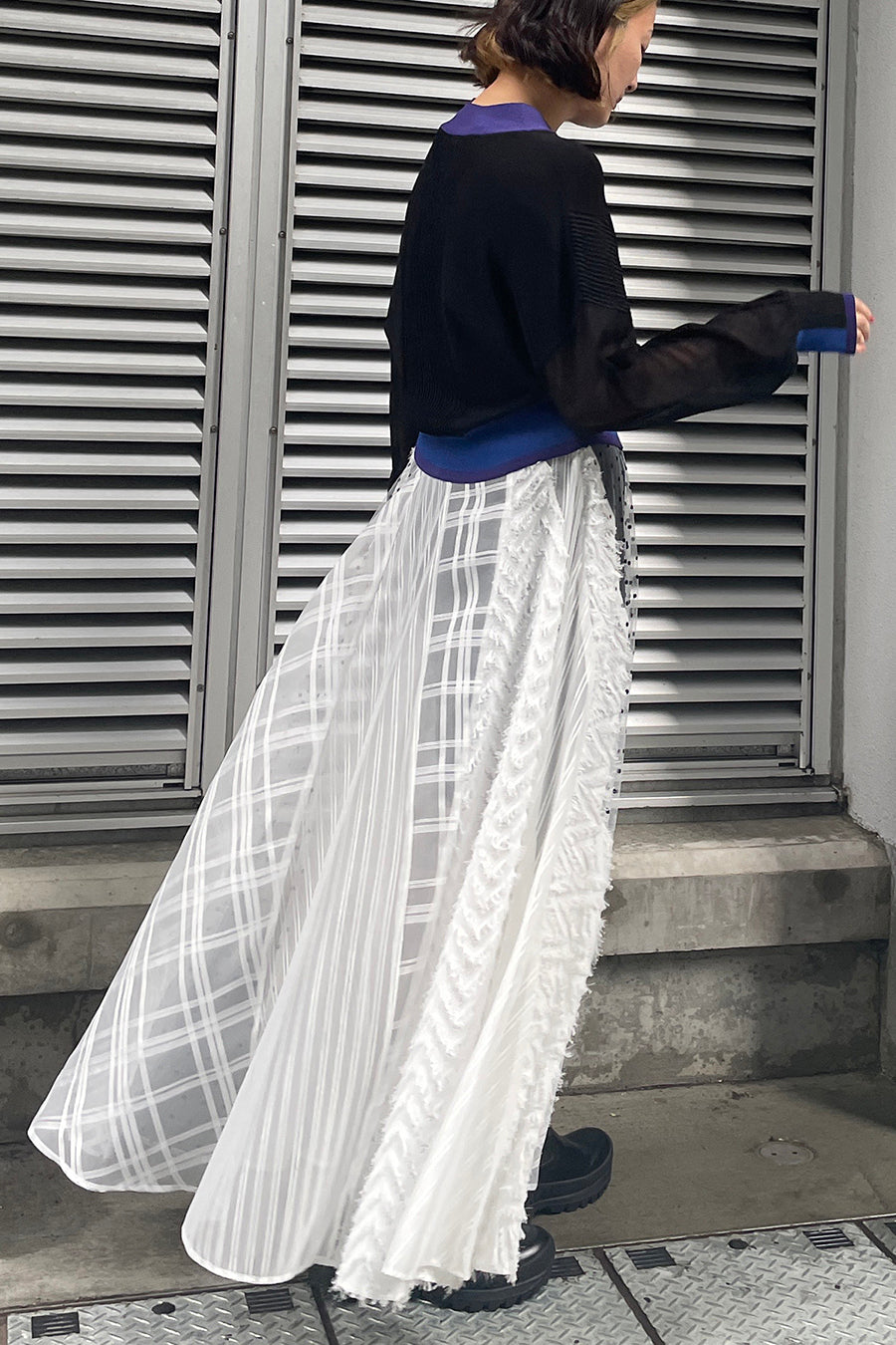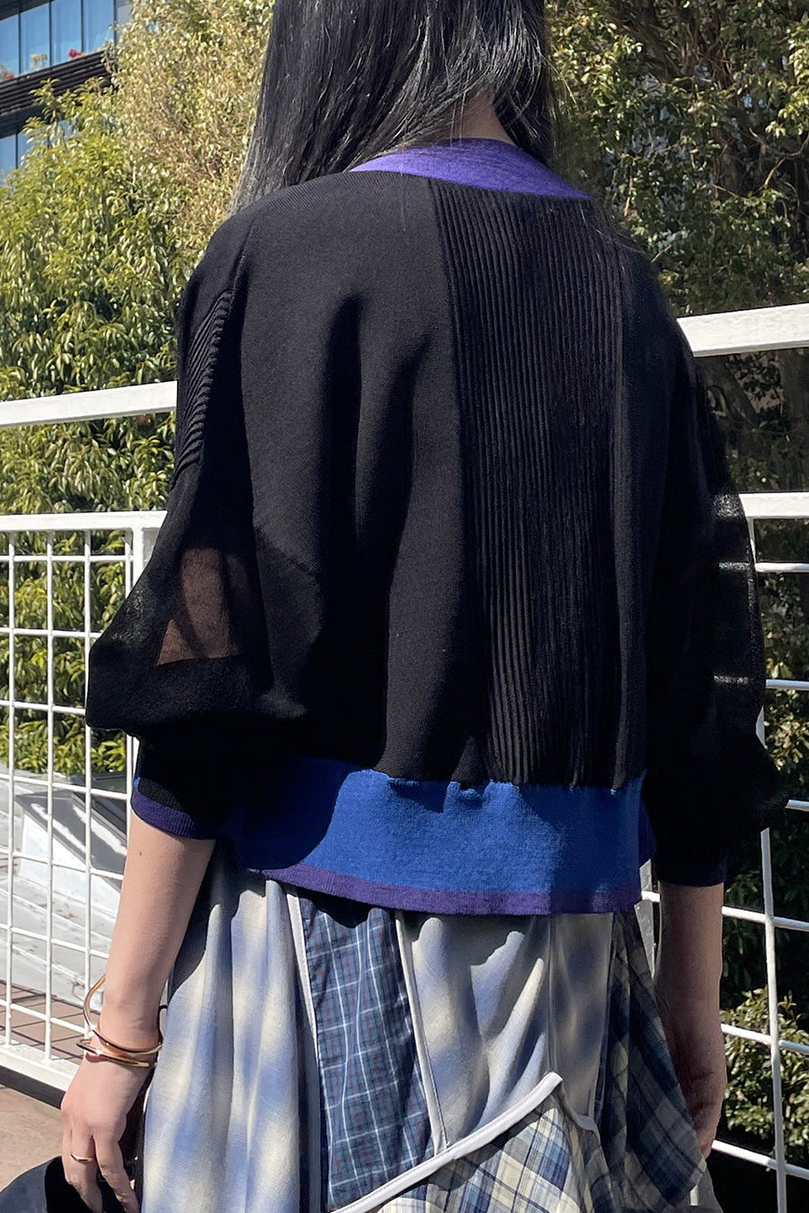 身頃はゴム編みとタック編み柄で透けず、袖は甘く編んだ天竺編みが透ける涼し気な編地変化のコンビネーション。
