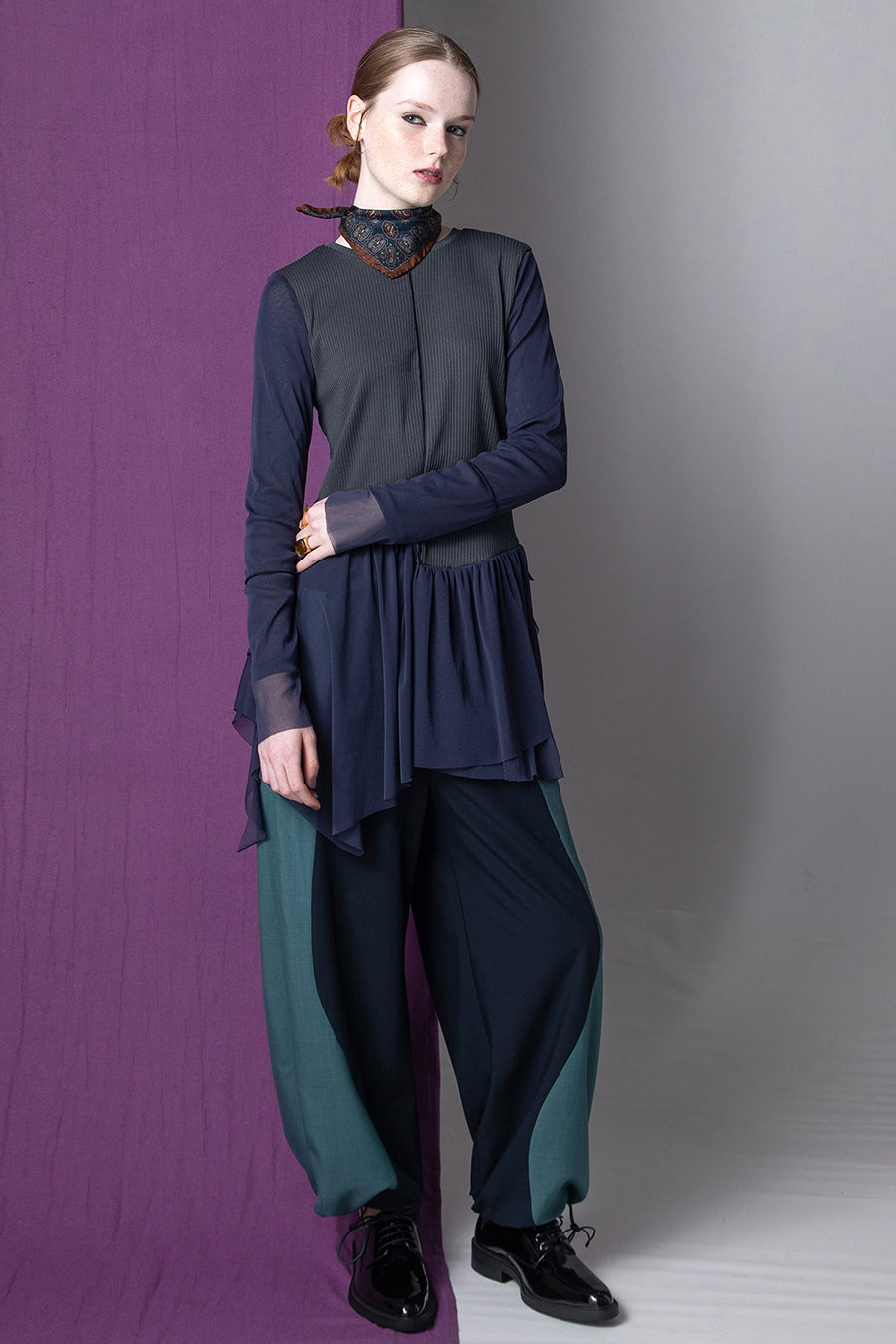 アシンメトリーなヘム上がりに仕上げたのがポイント。