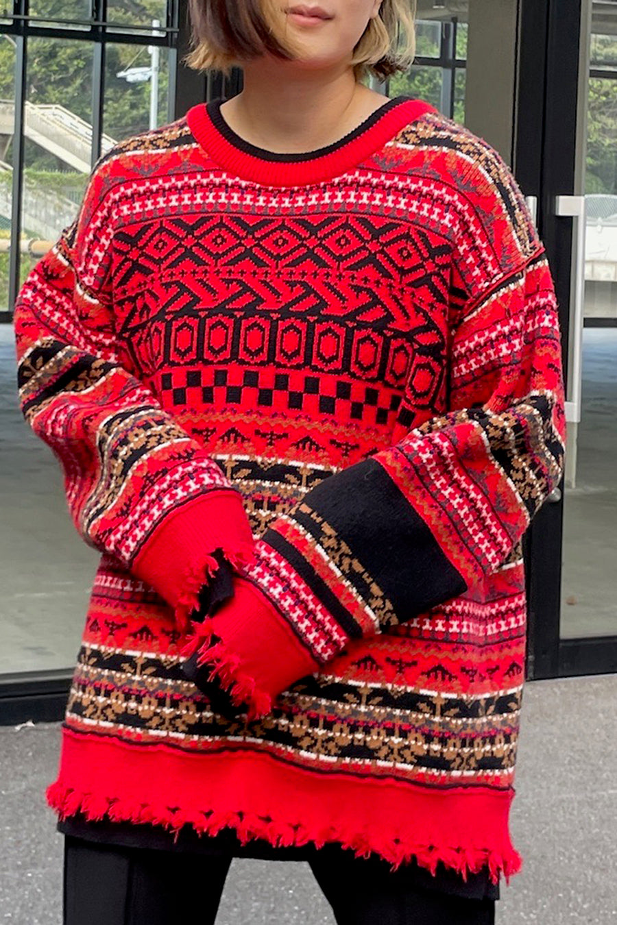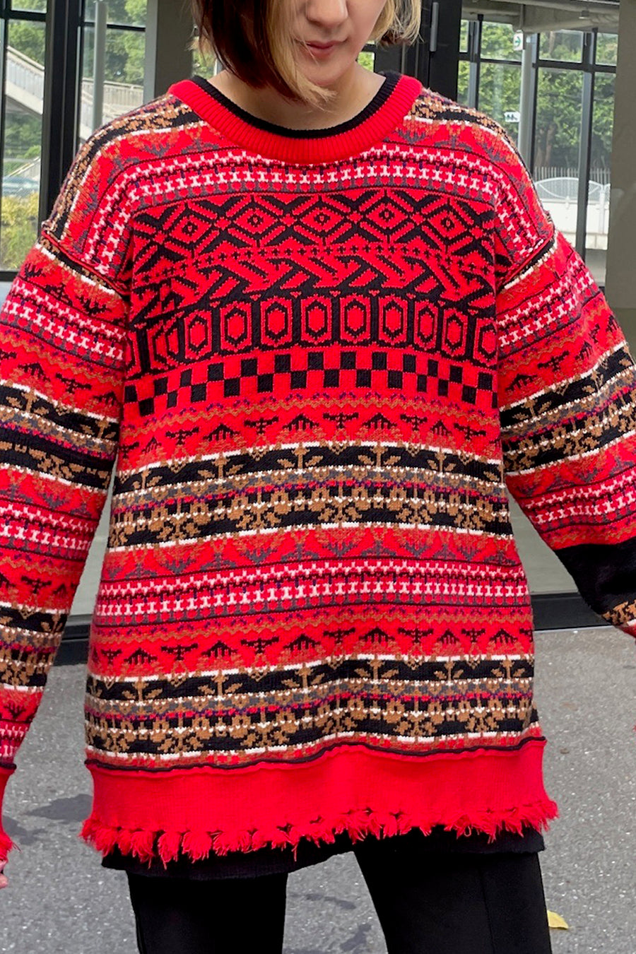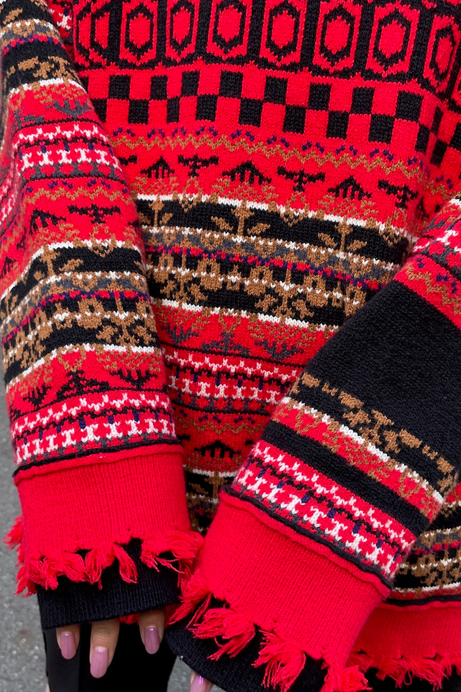 7配色の糸を使用した幾何学柄のジャガードプルオーバーで、