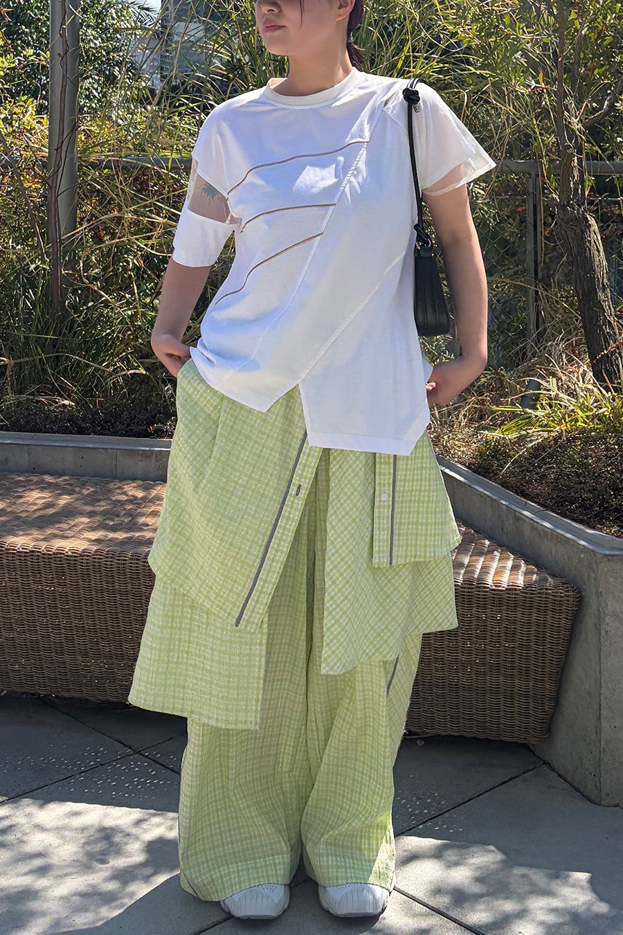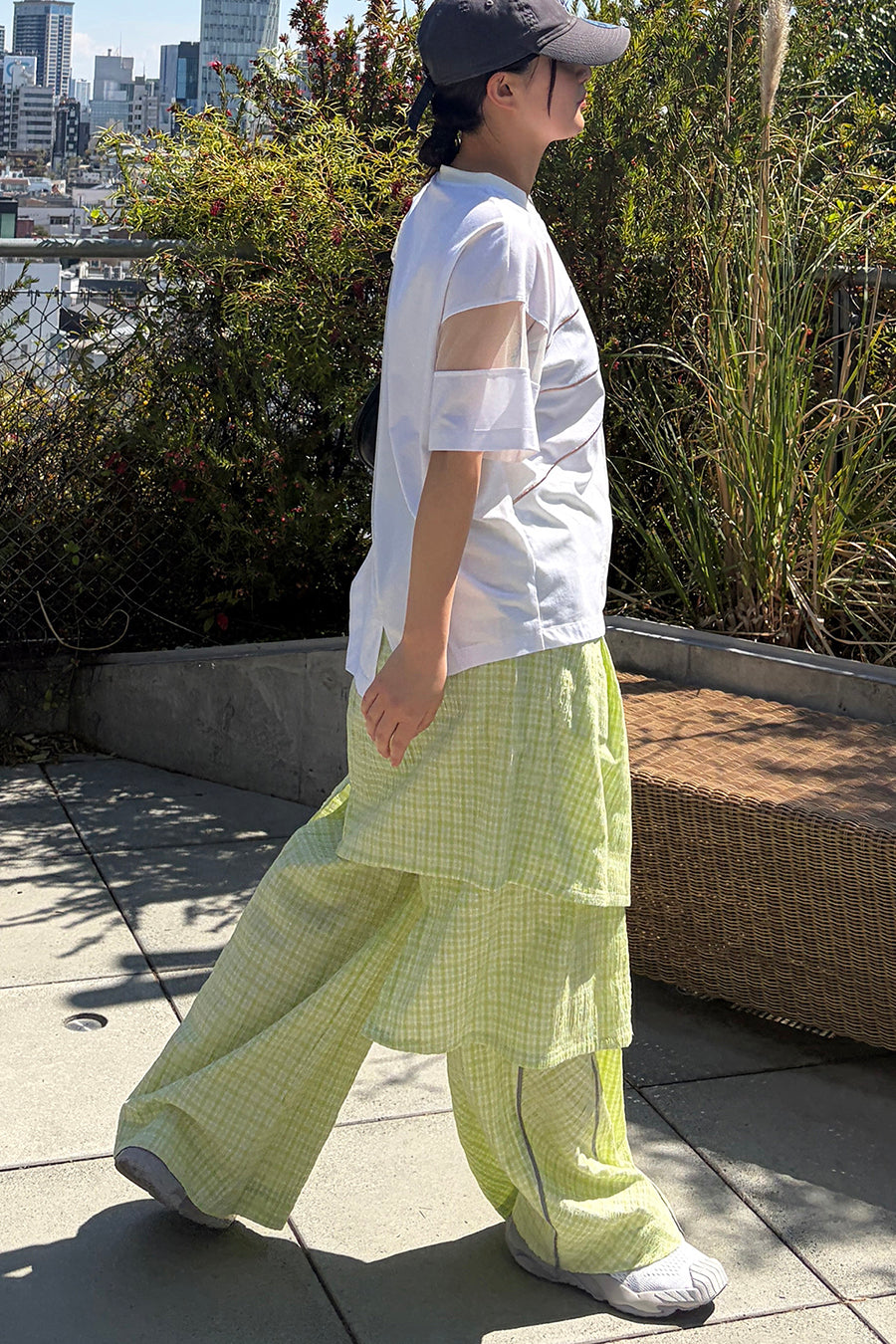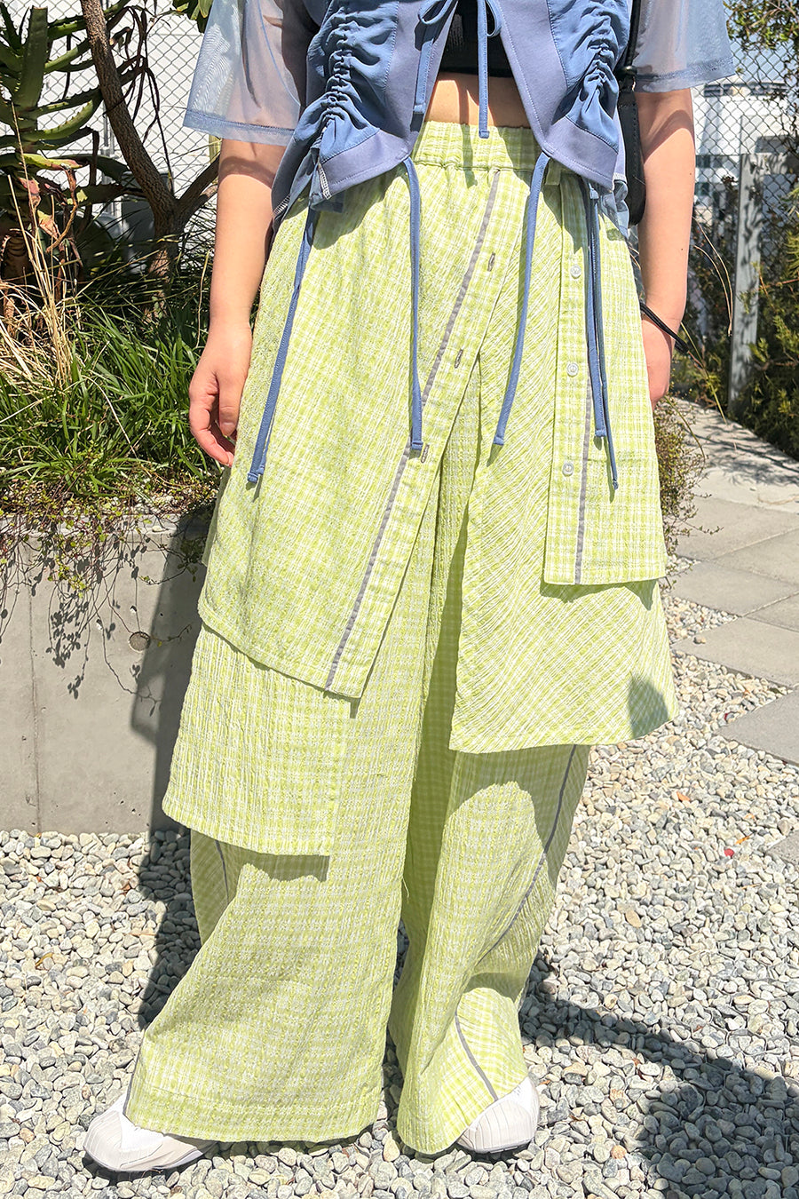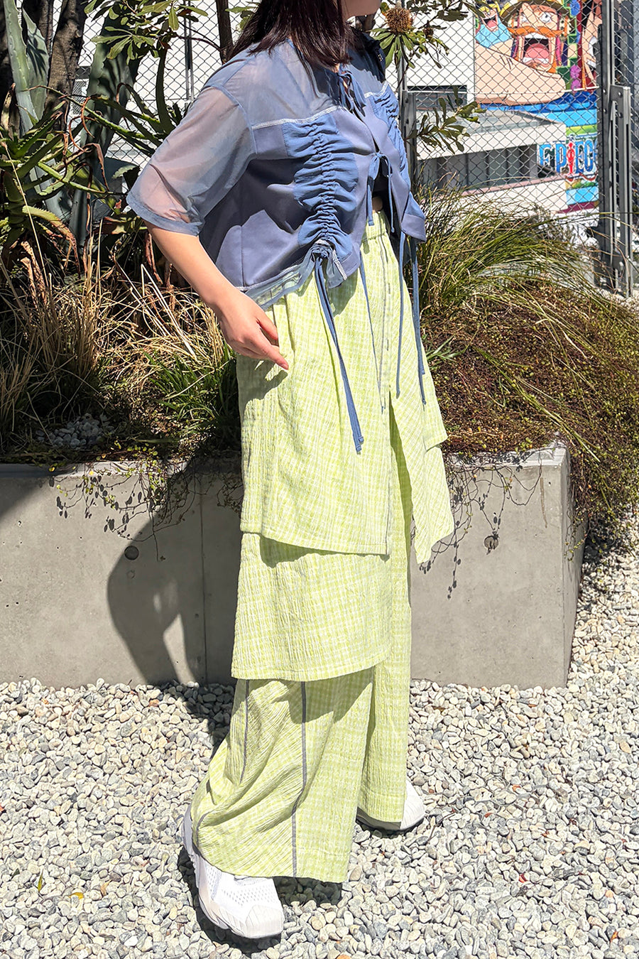 涼しげなサッカーチェックの素材を使用したルーズパンツ。