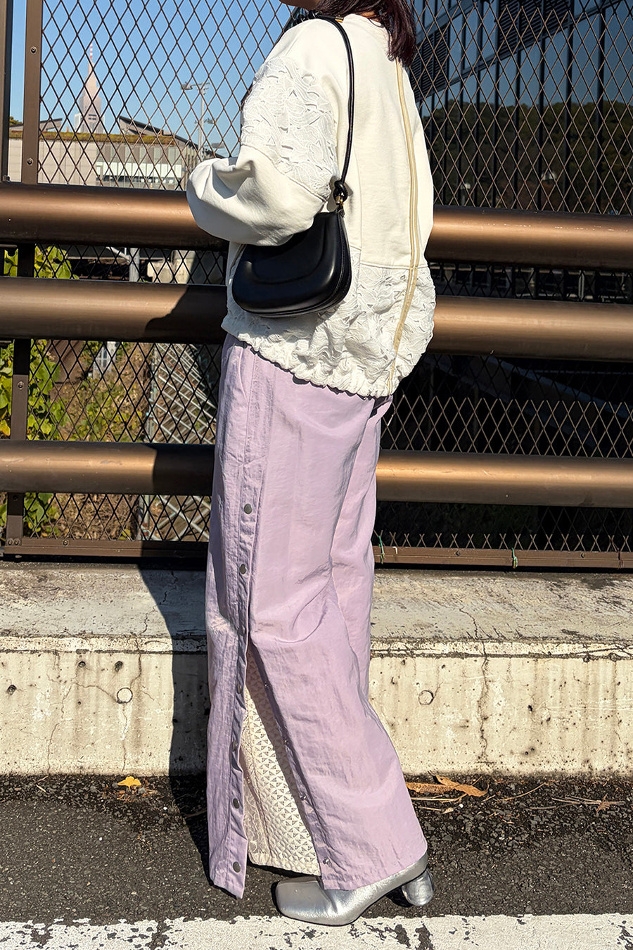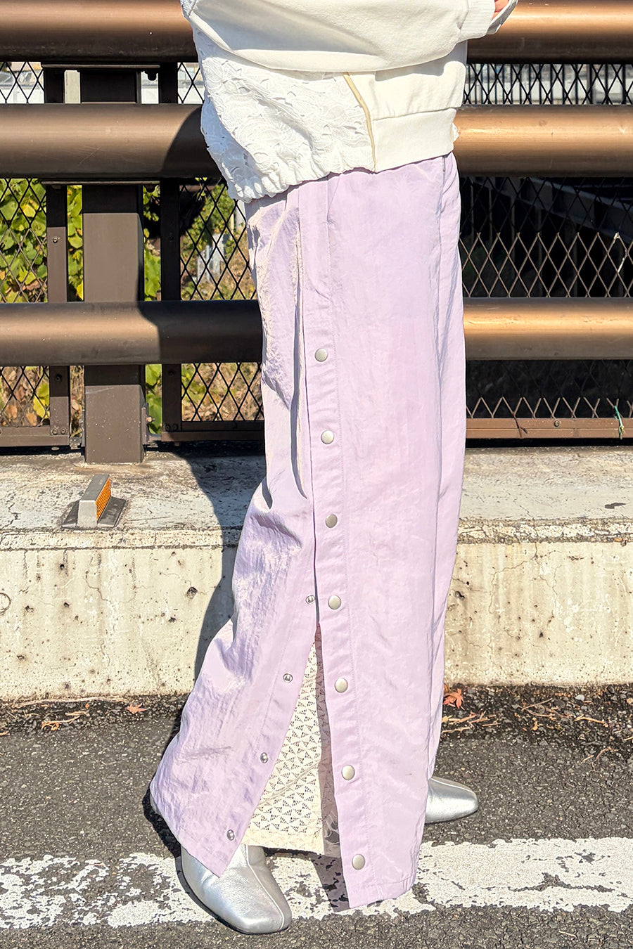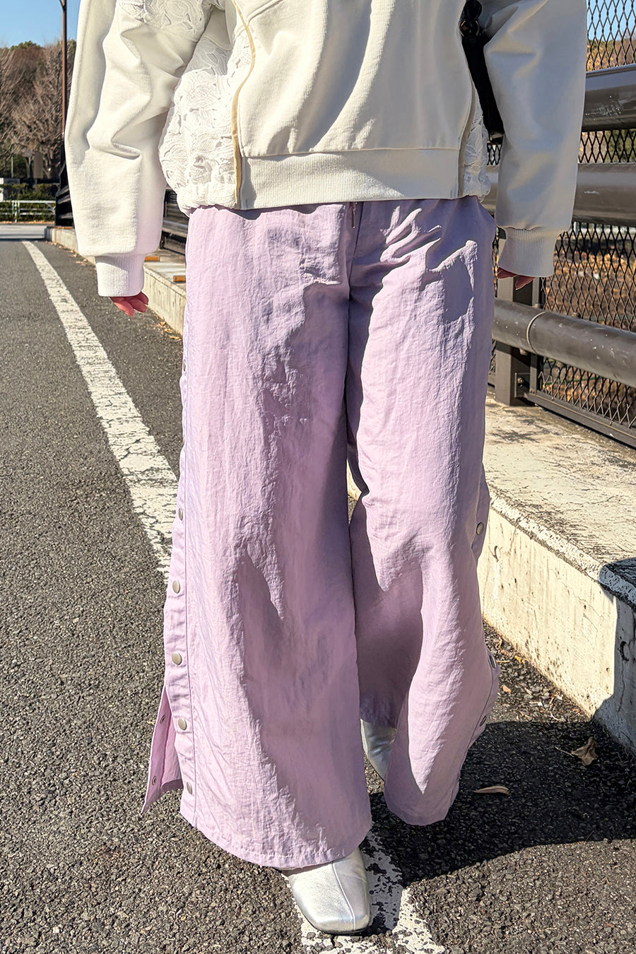 ダブルウエスト仕様のナイロンパンツ。両サイドにはドットボタンのスリット仕様、