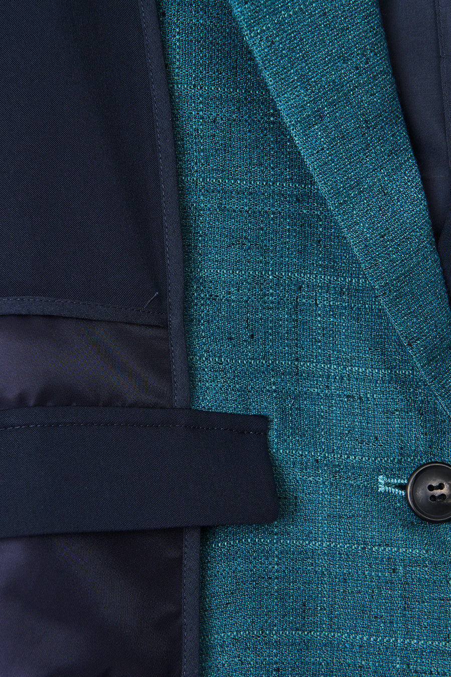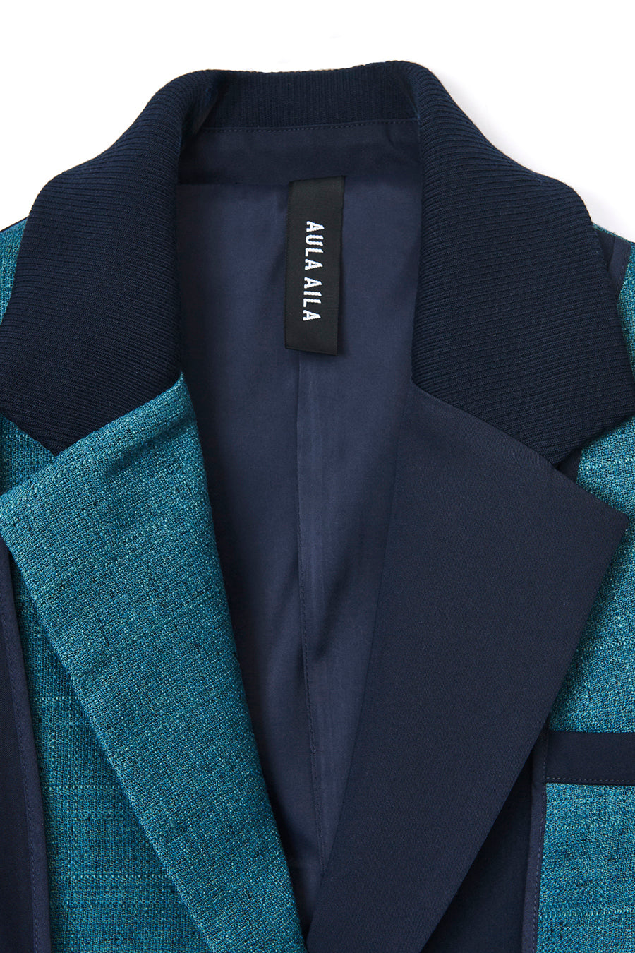 袖口や裾、上衿には編立リブをあしらい、ジャケットの品格に