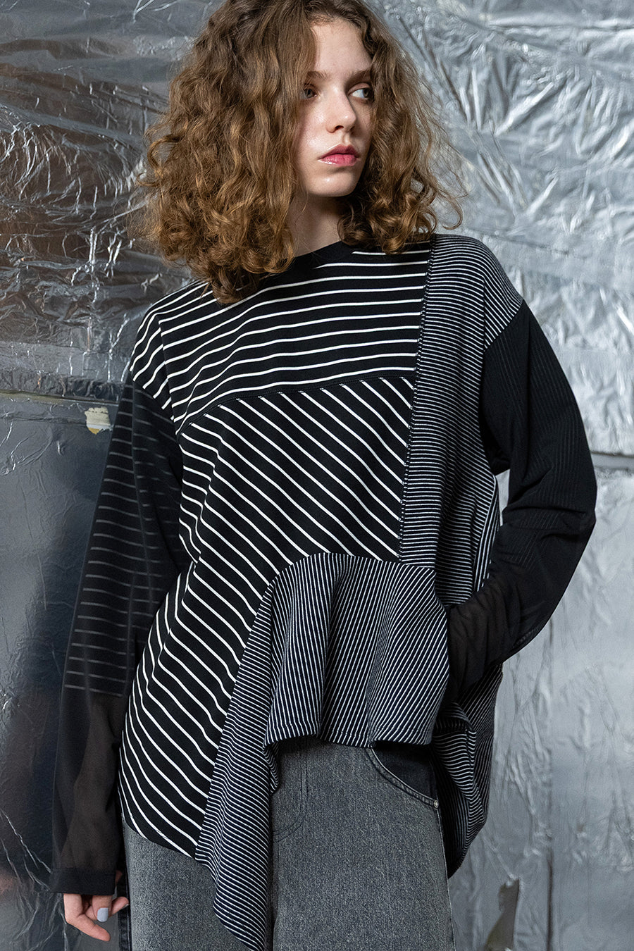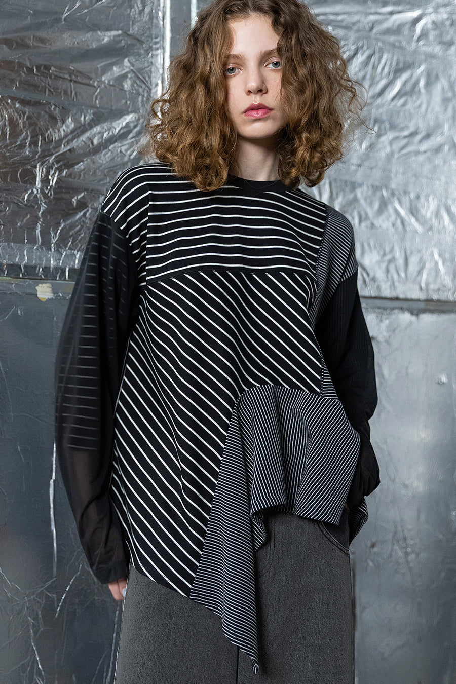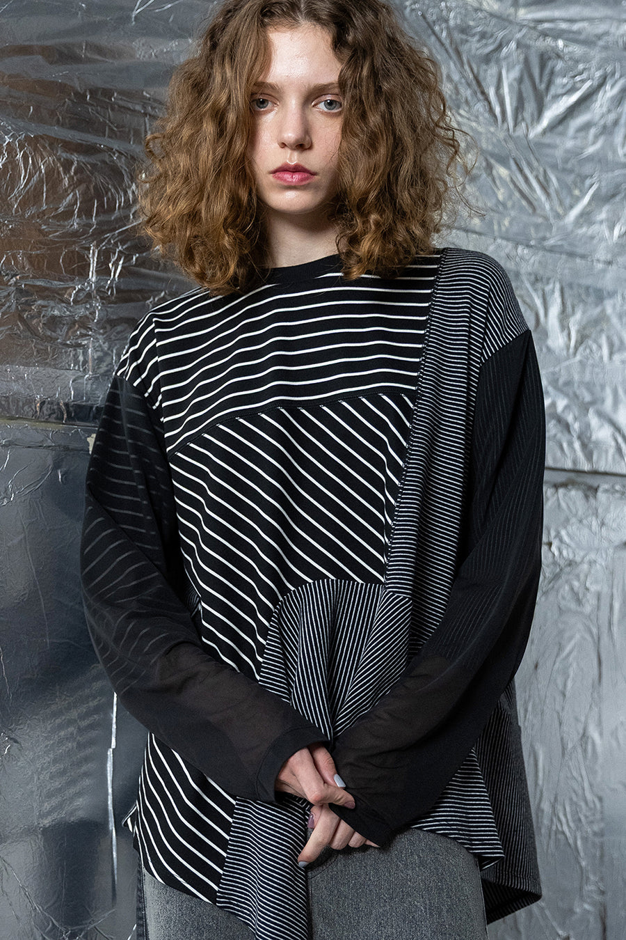 袖にシアー感のあるトリコットをレイヤードしたロングティーシャツ。