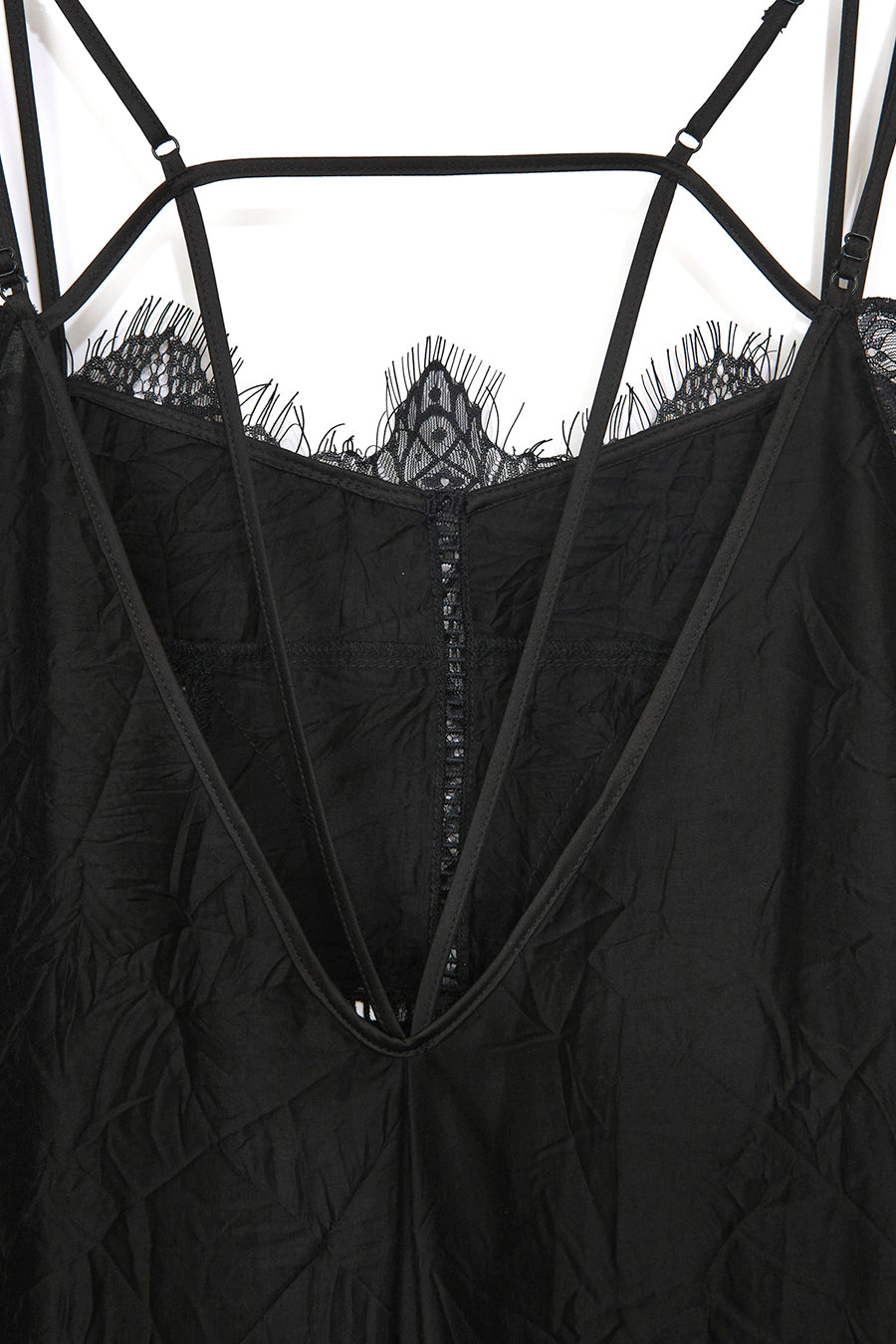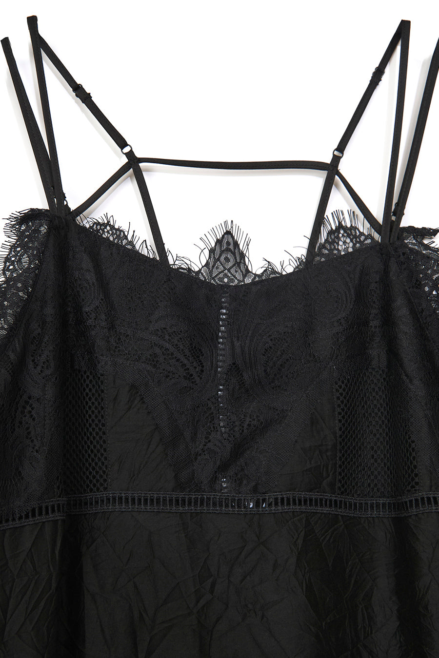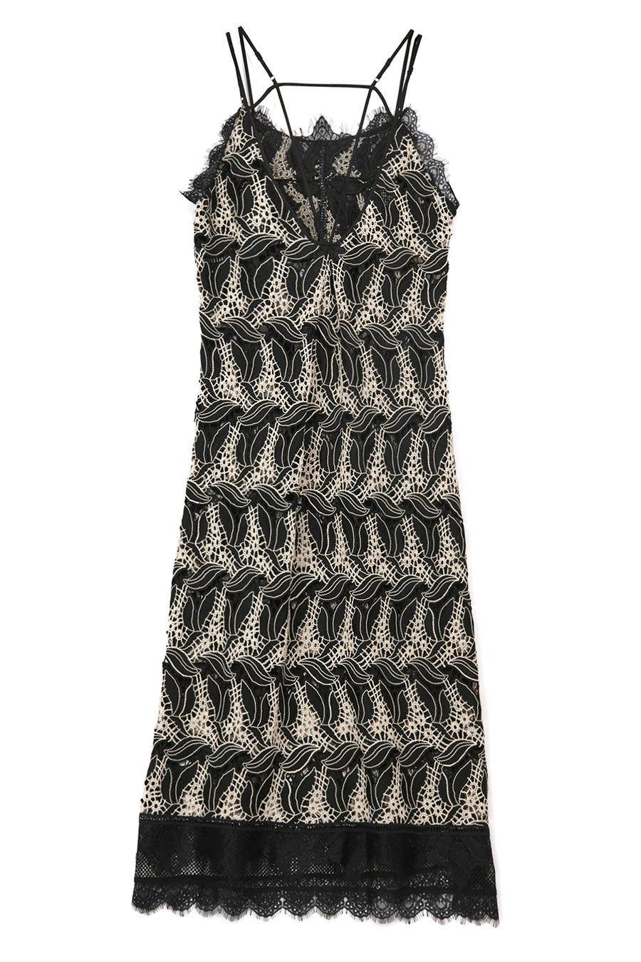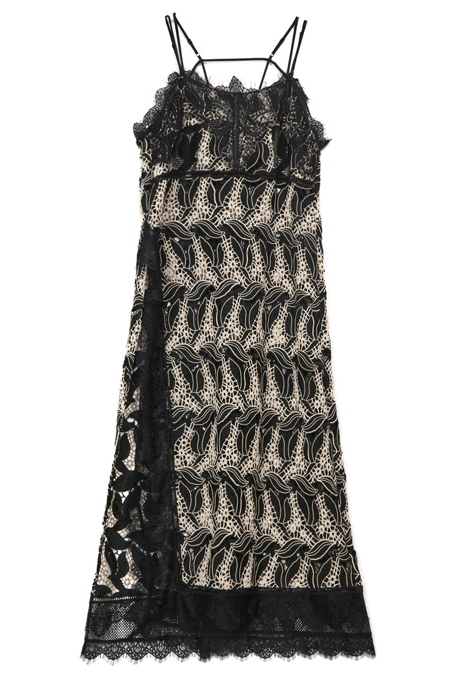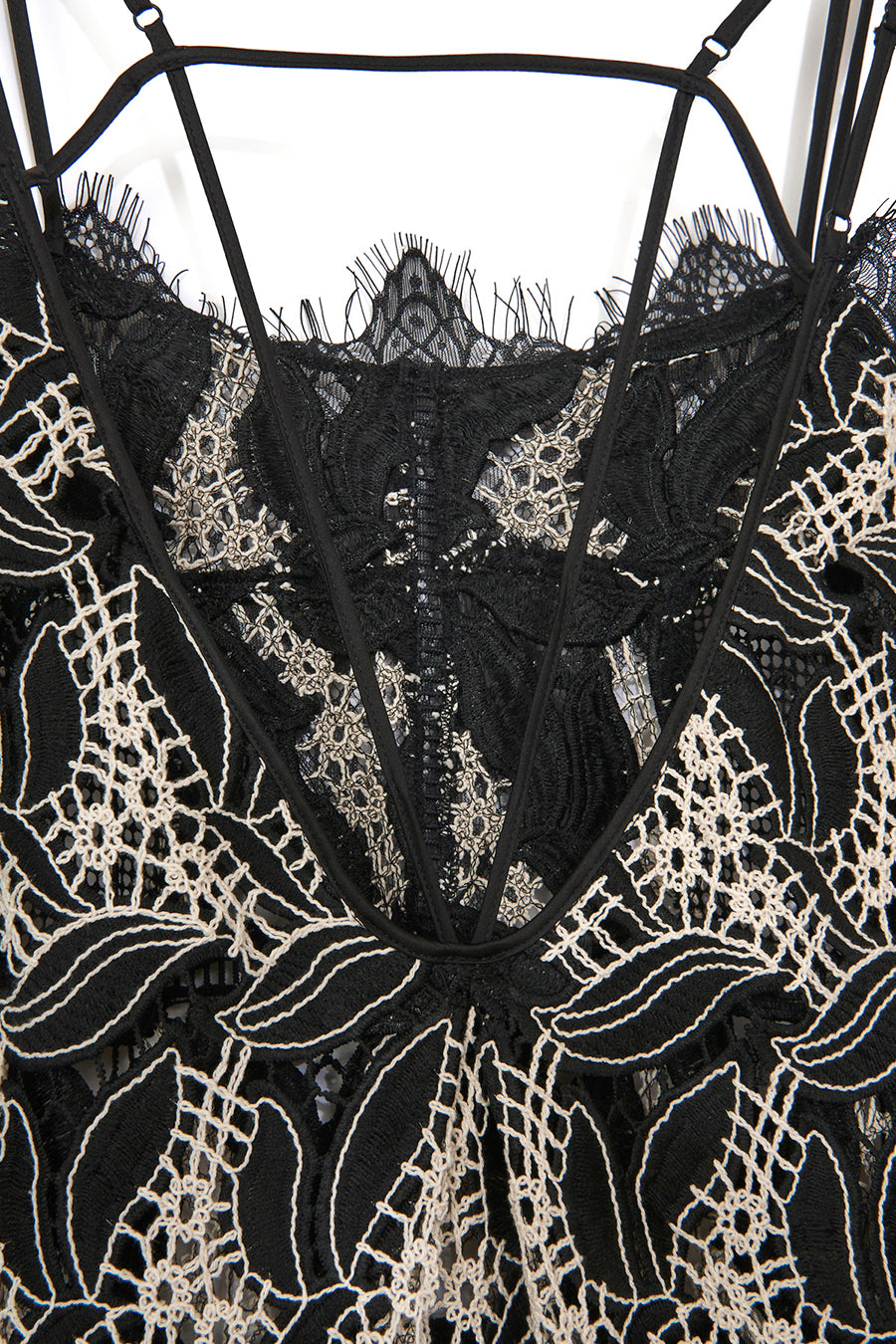 胸元に沿ってV型のモチーフリバーレースとメッシュを剥ぎ、
