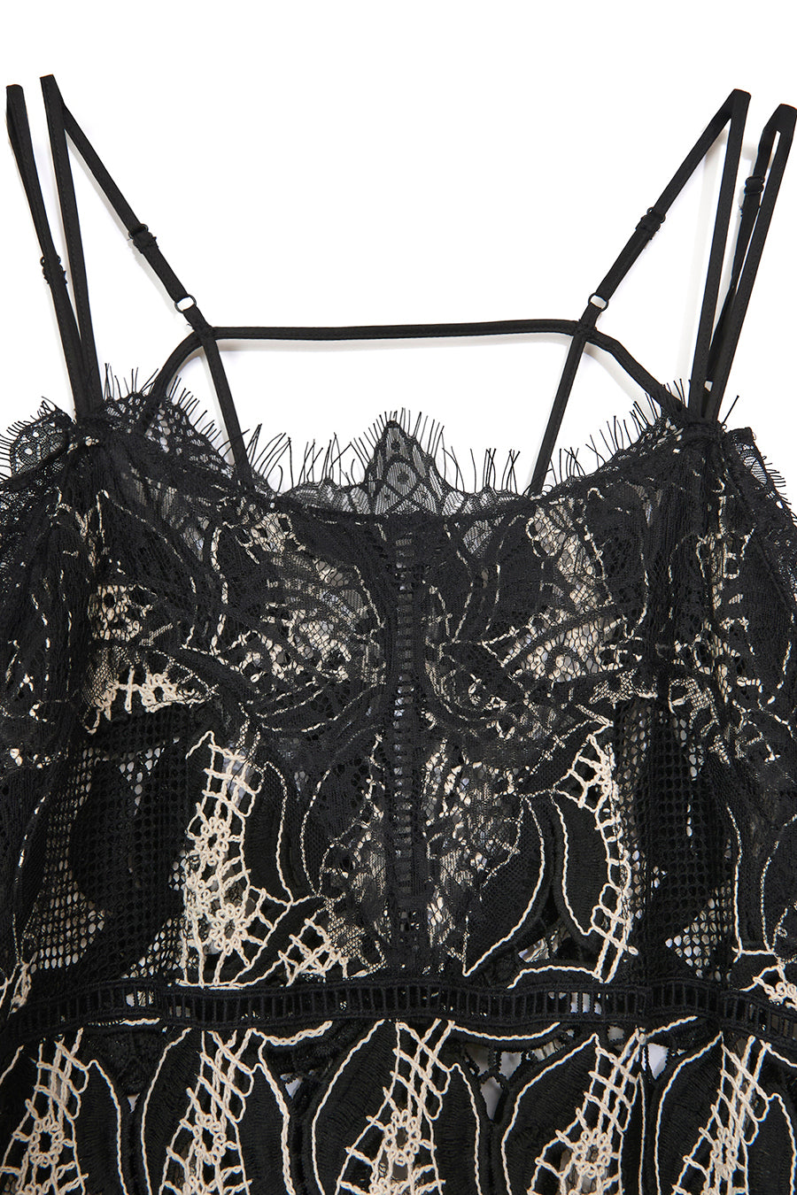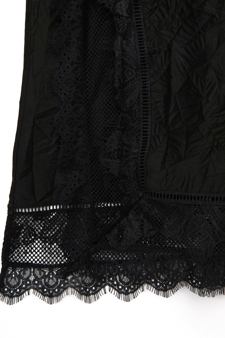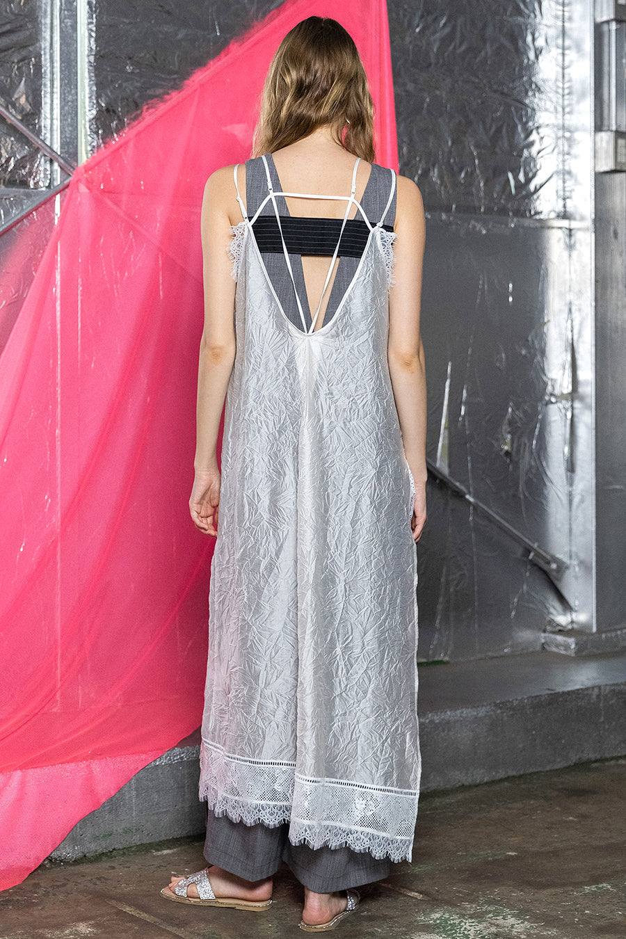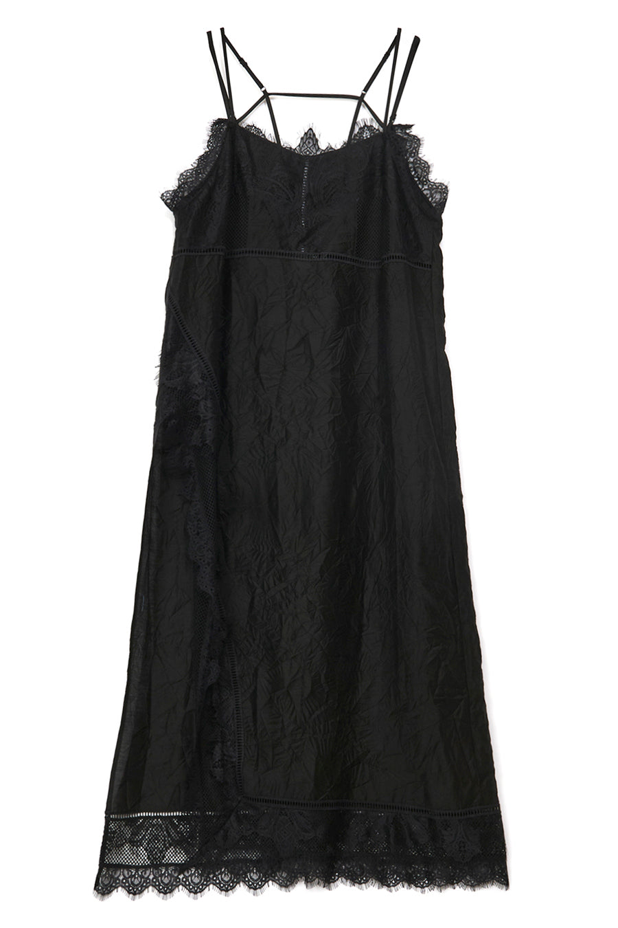 胸元に沿ってV型のモチーフリバーレースとメッシュを剥ぎ、