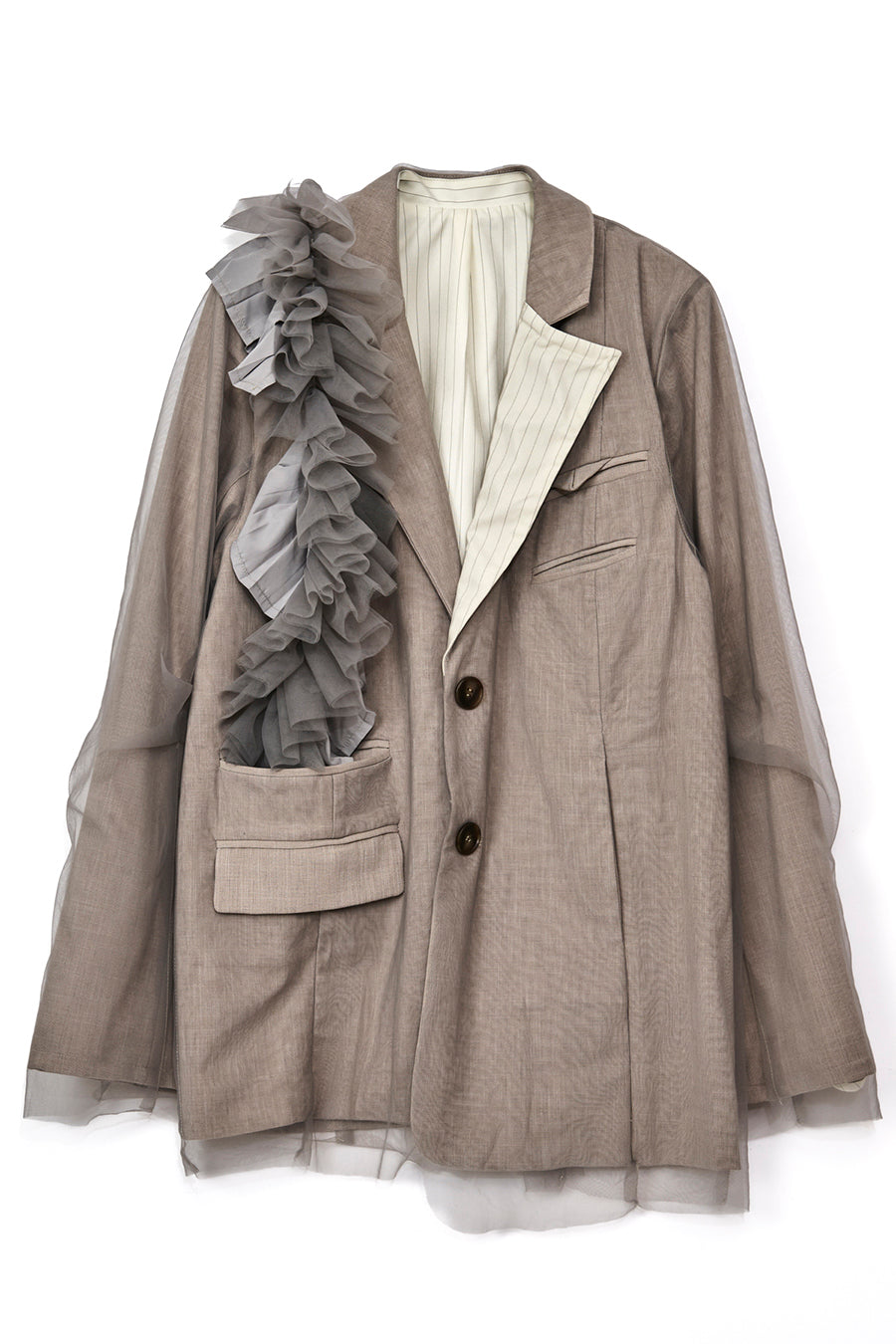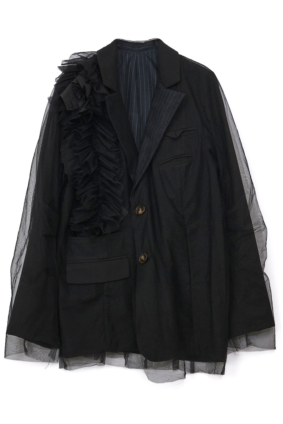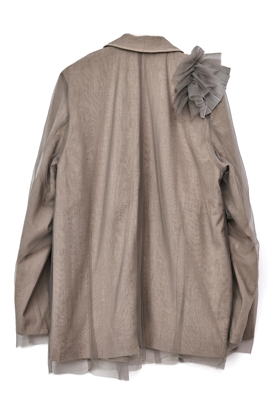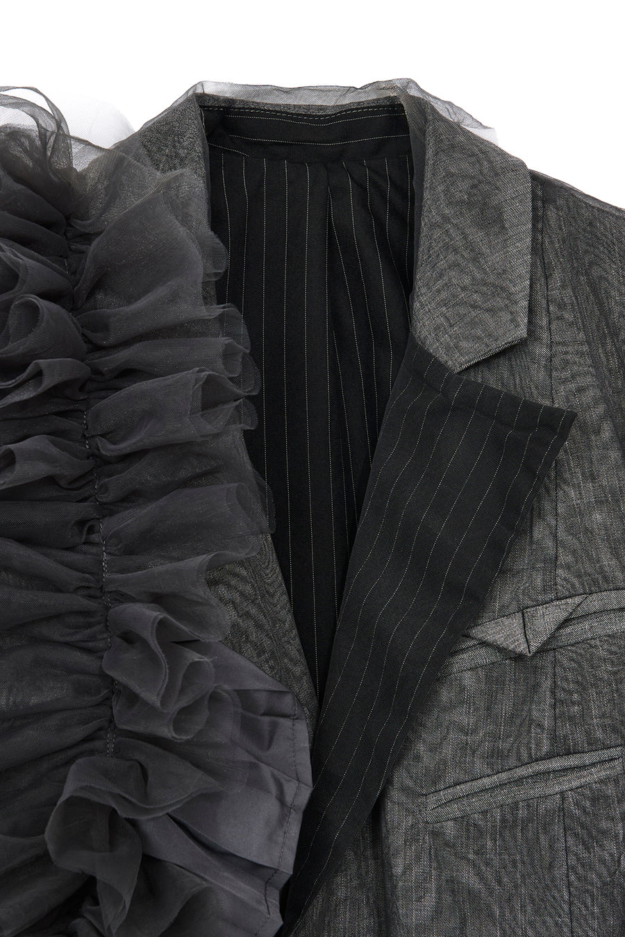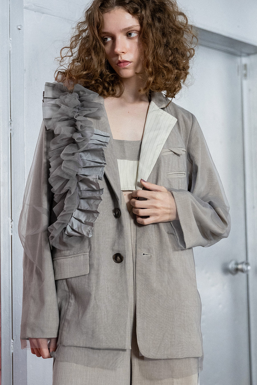 リバーシブルテーラージャケット。肩から垂らす、プリーツフリルがトレンド感をプラス。