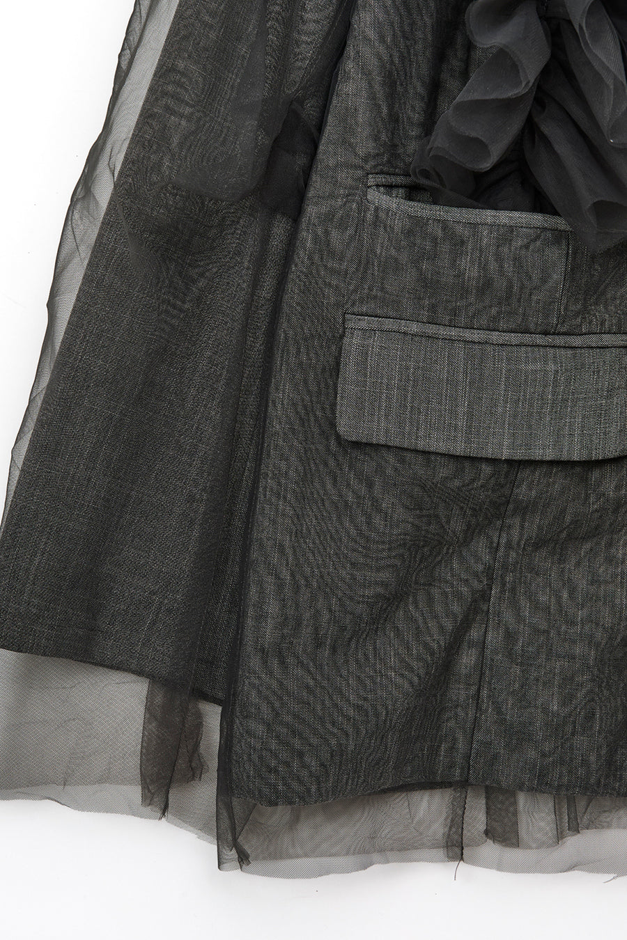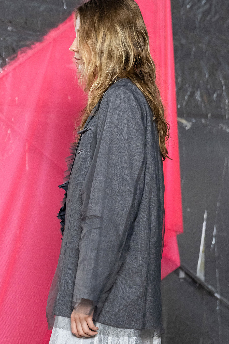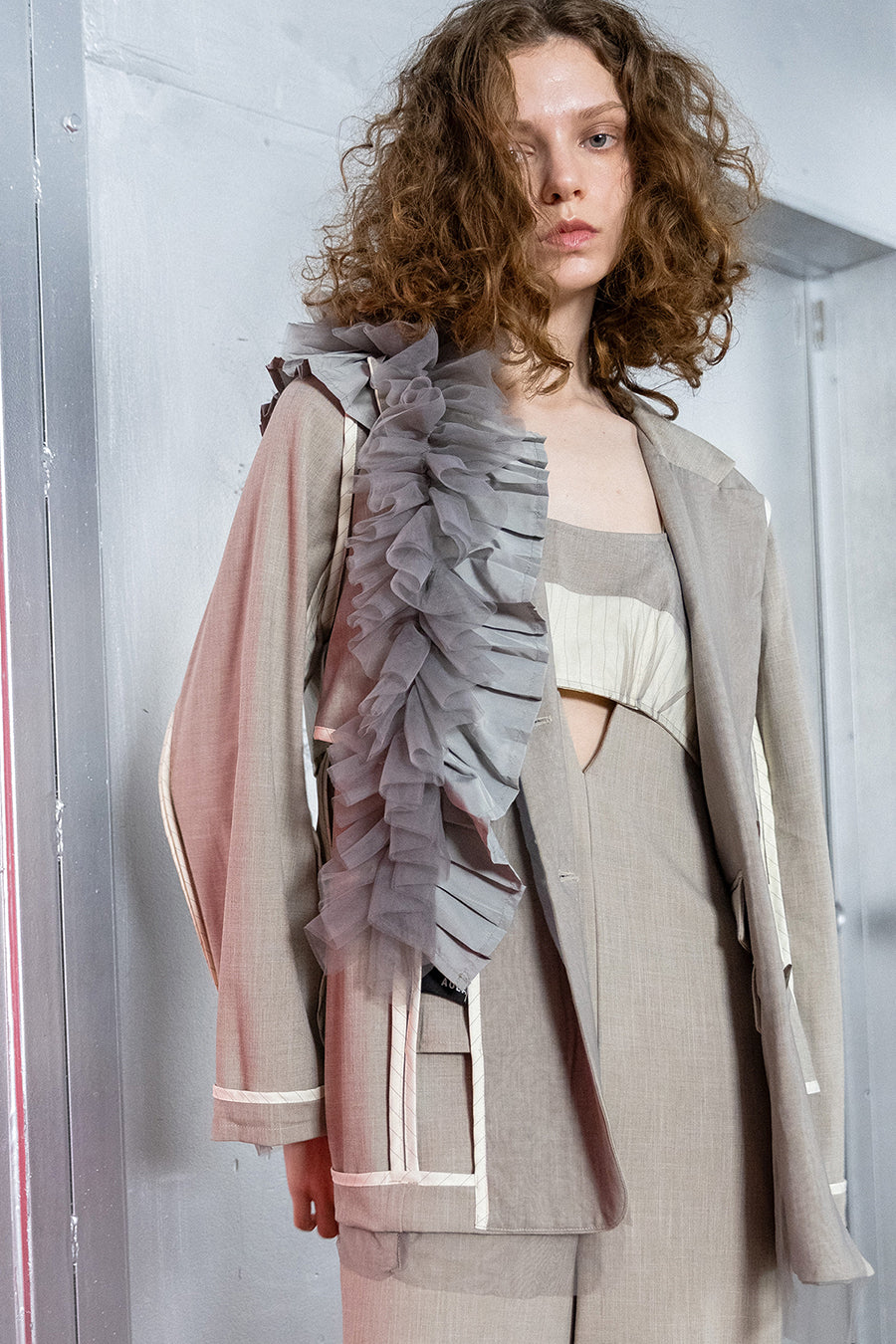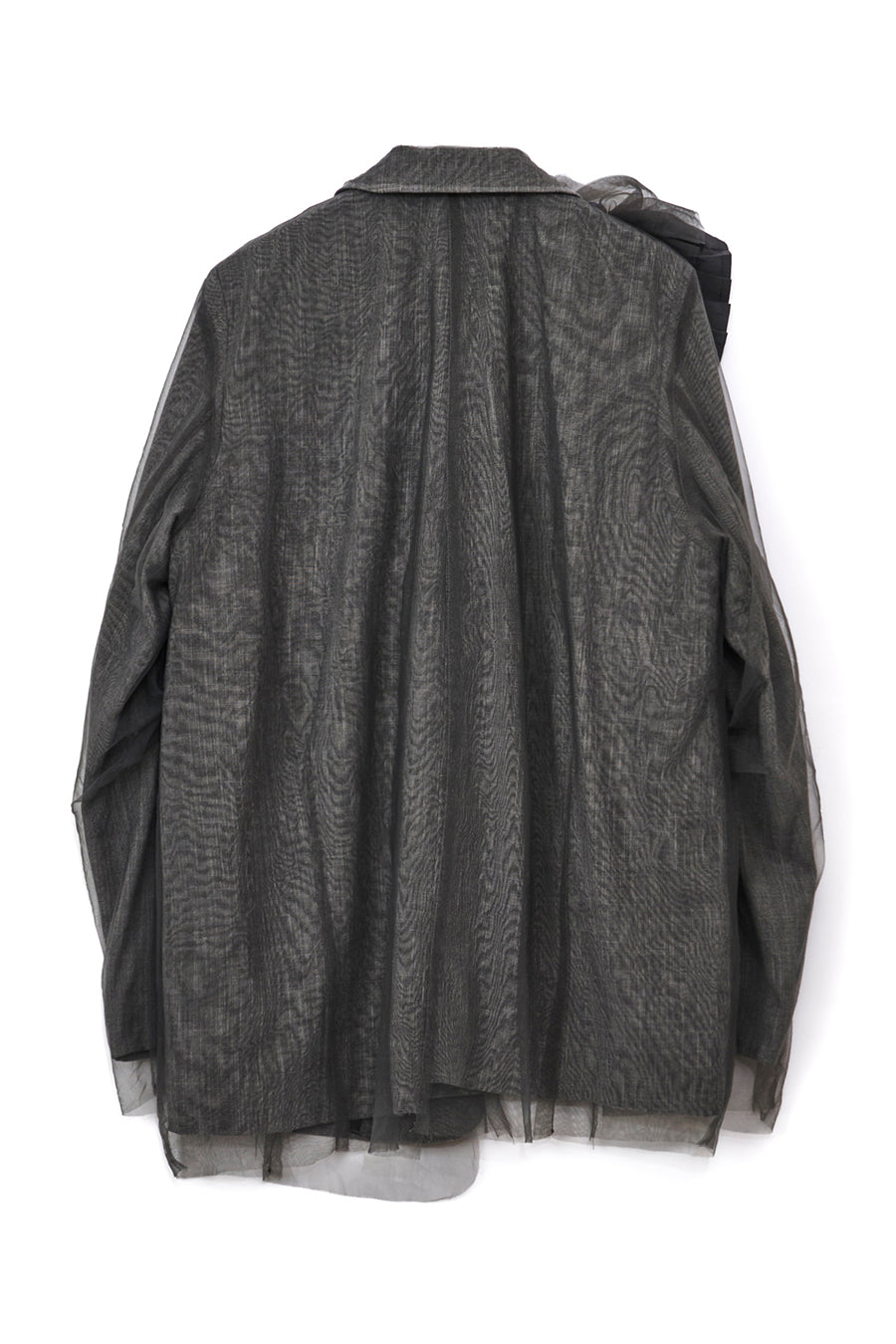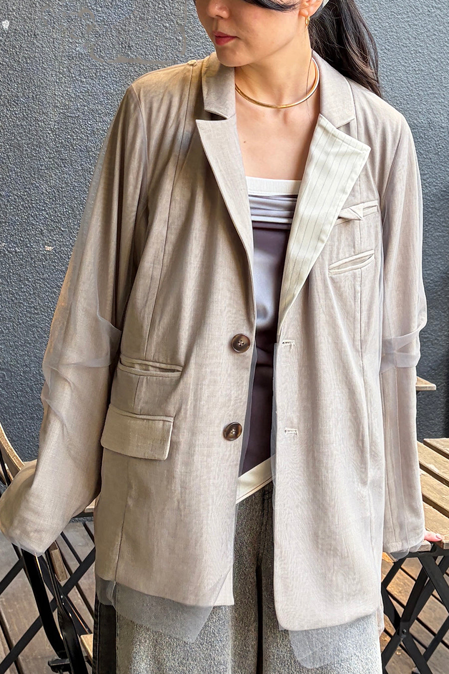 リバーシブルテーラージャケット。肩から垂らす、プリーツフリルがトレンド感をプラス。