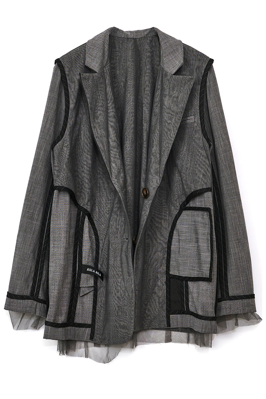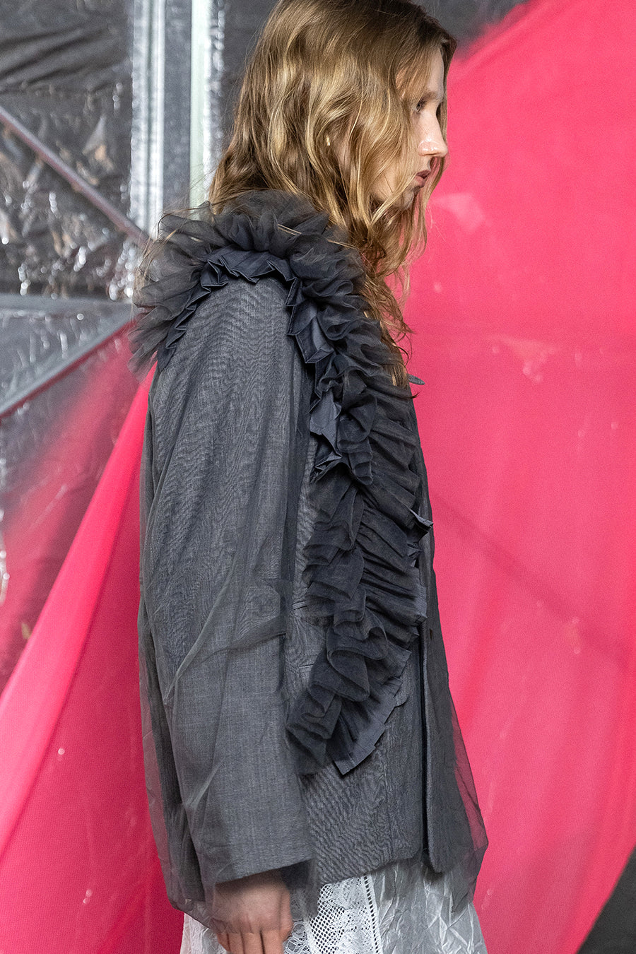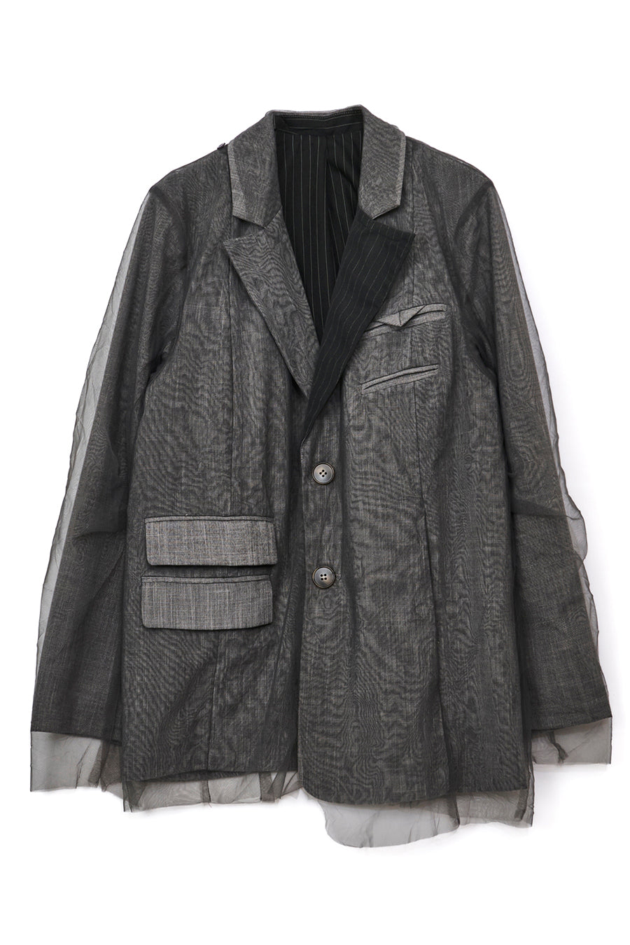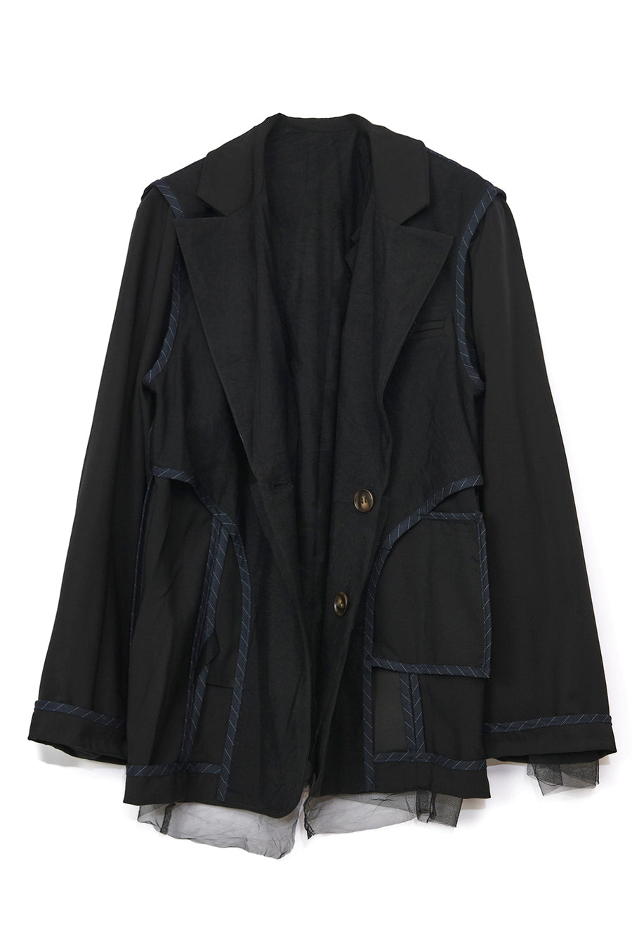 リバーシブルテーラージャケット。肩から垂らす、プリーツフリルがトレンド感をプラス。