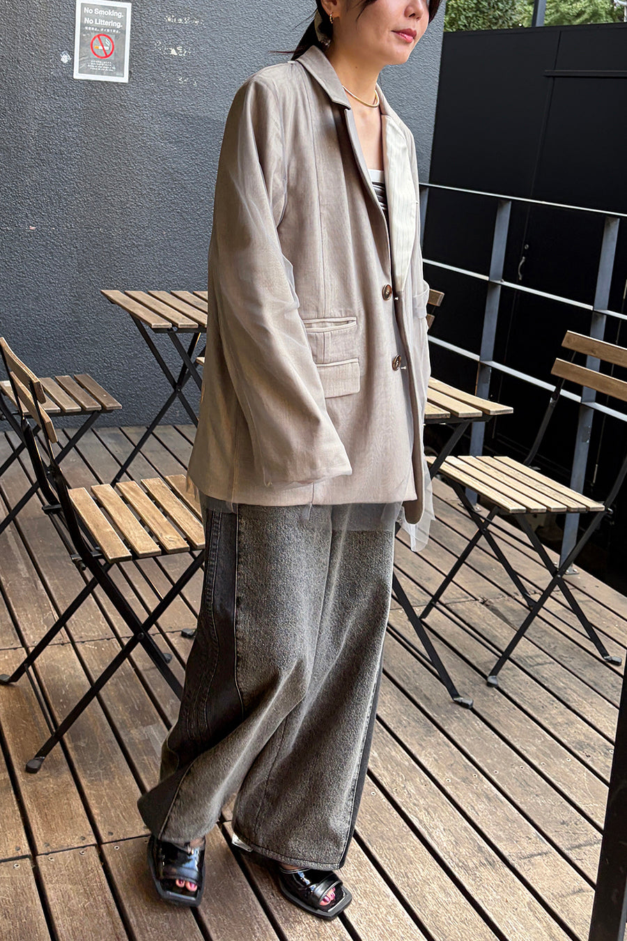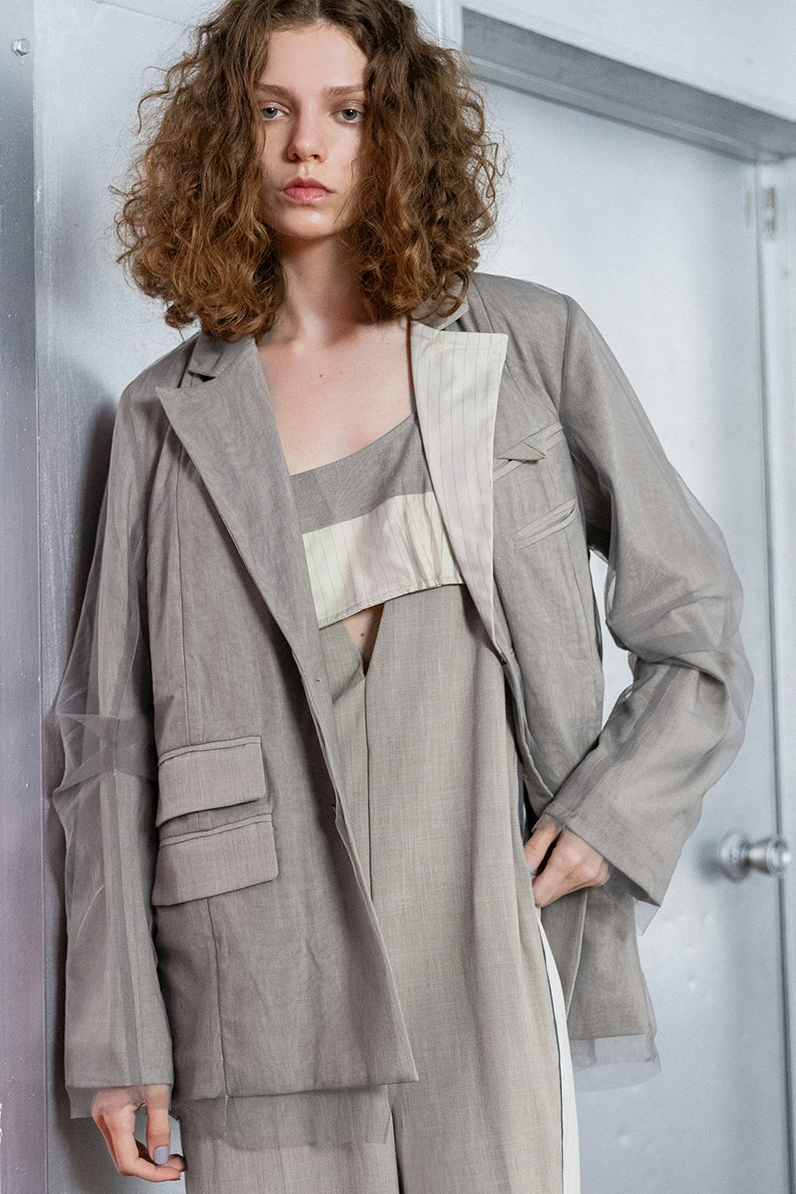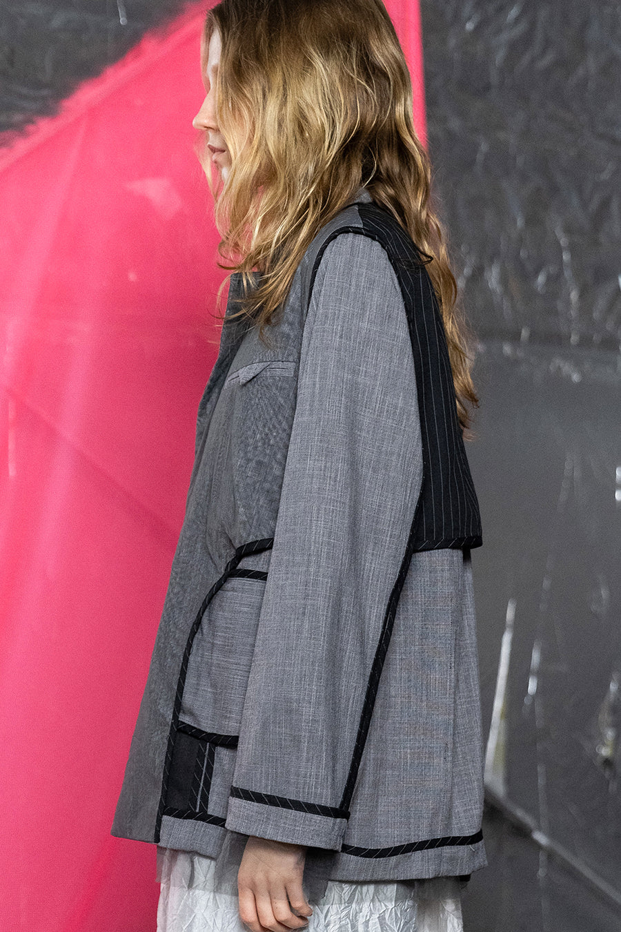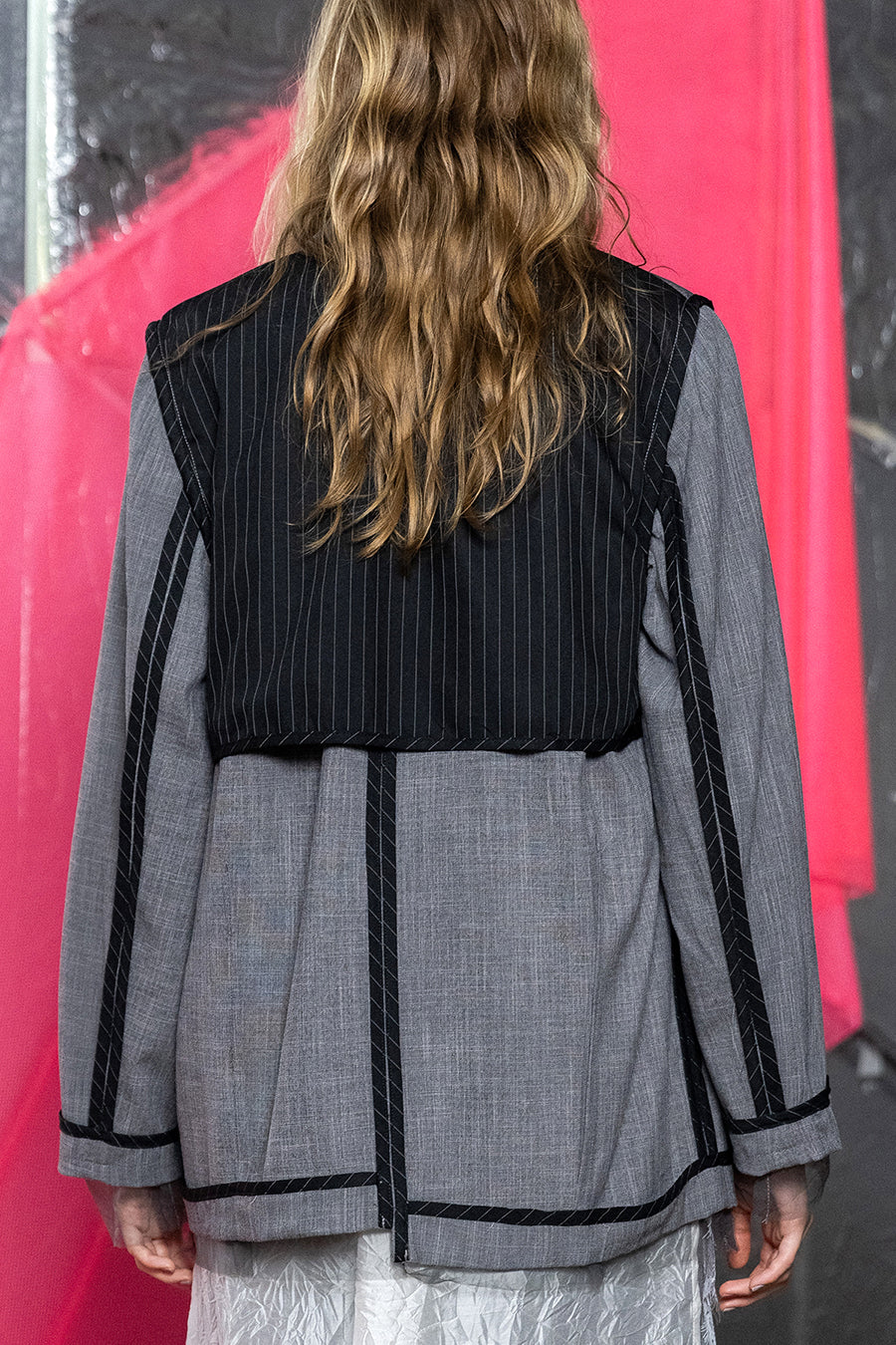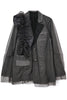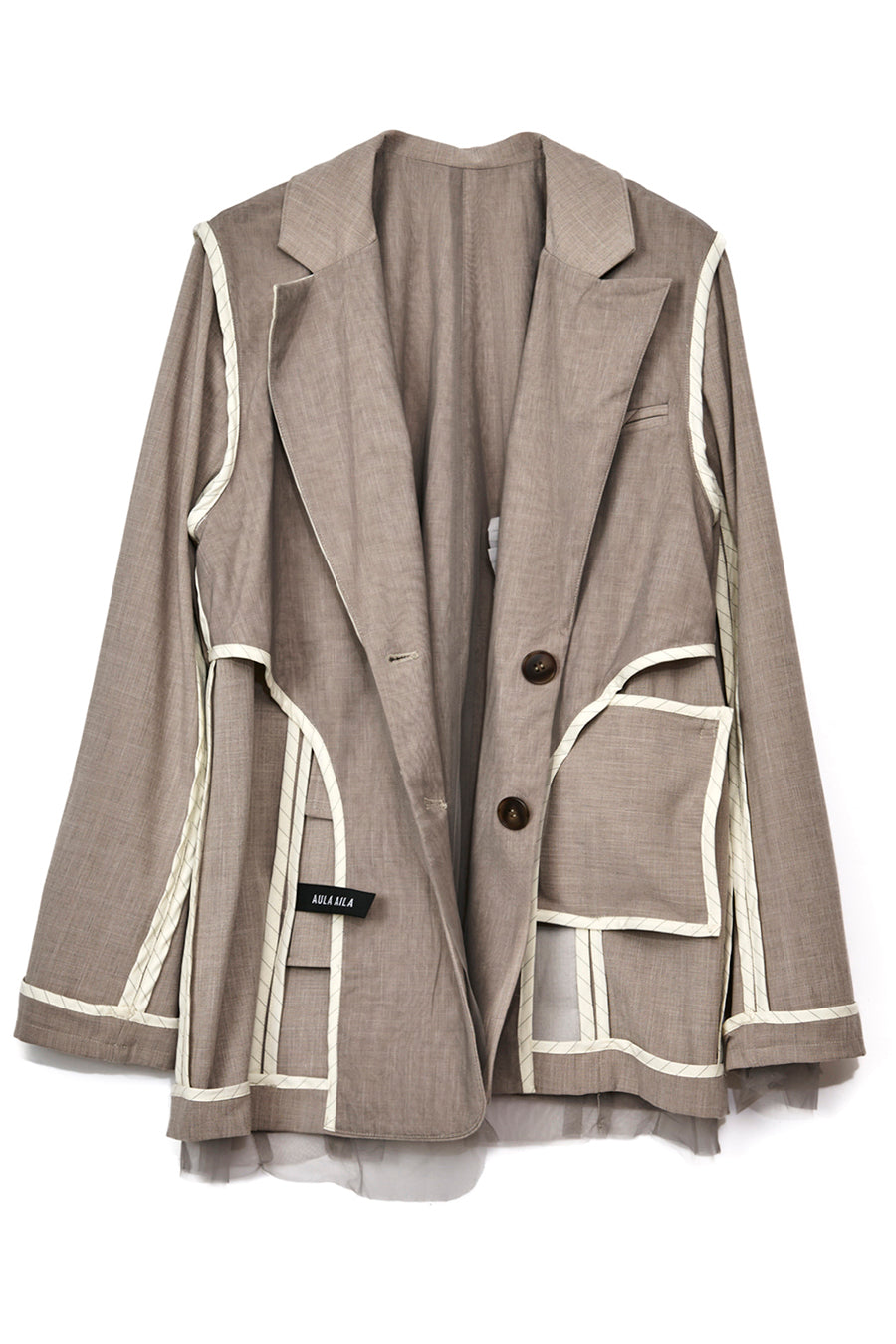 リバーシブルテーラージャケット。肩から垂らす、プリーツフリルがトレンド感をプラス。