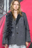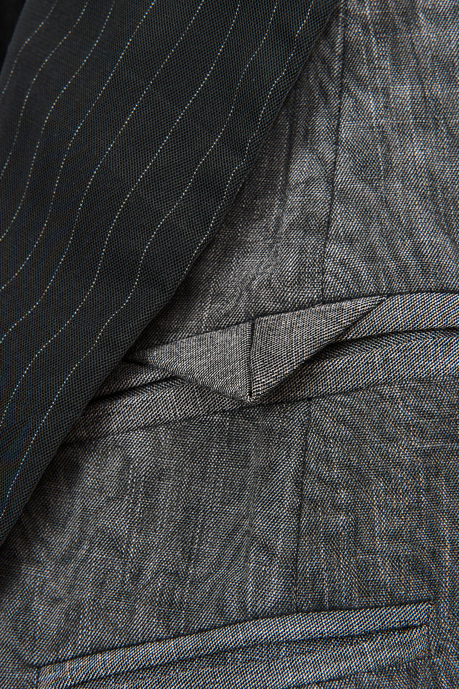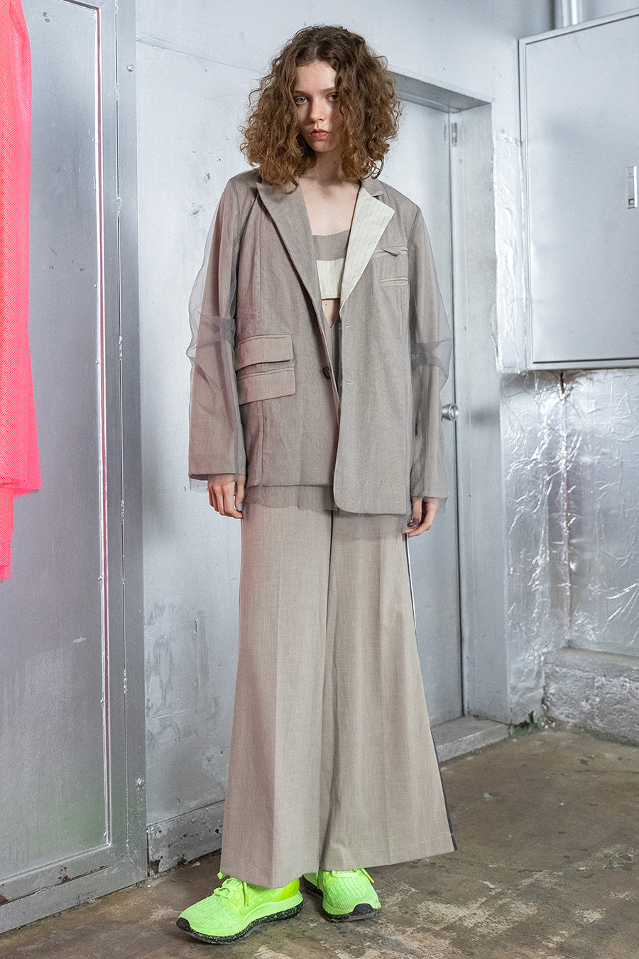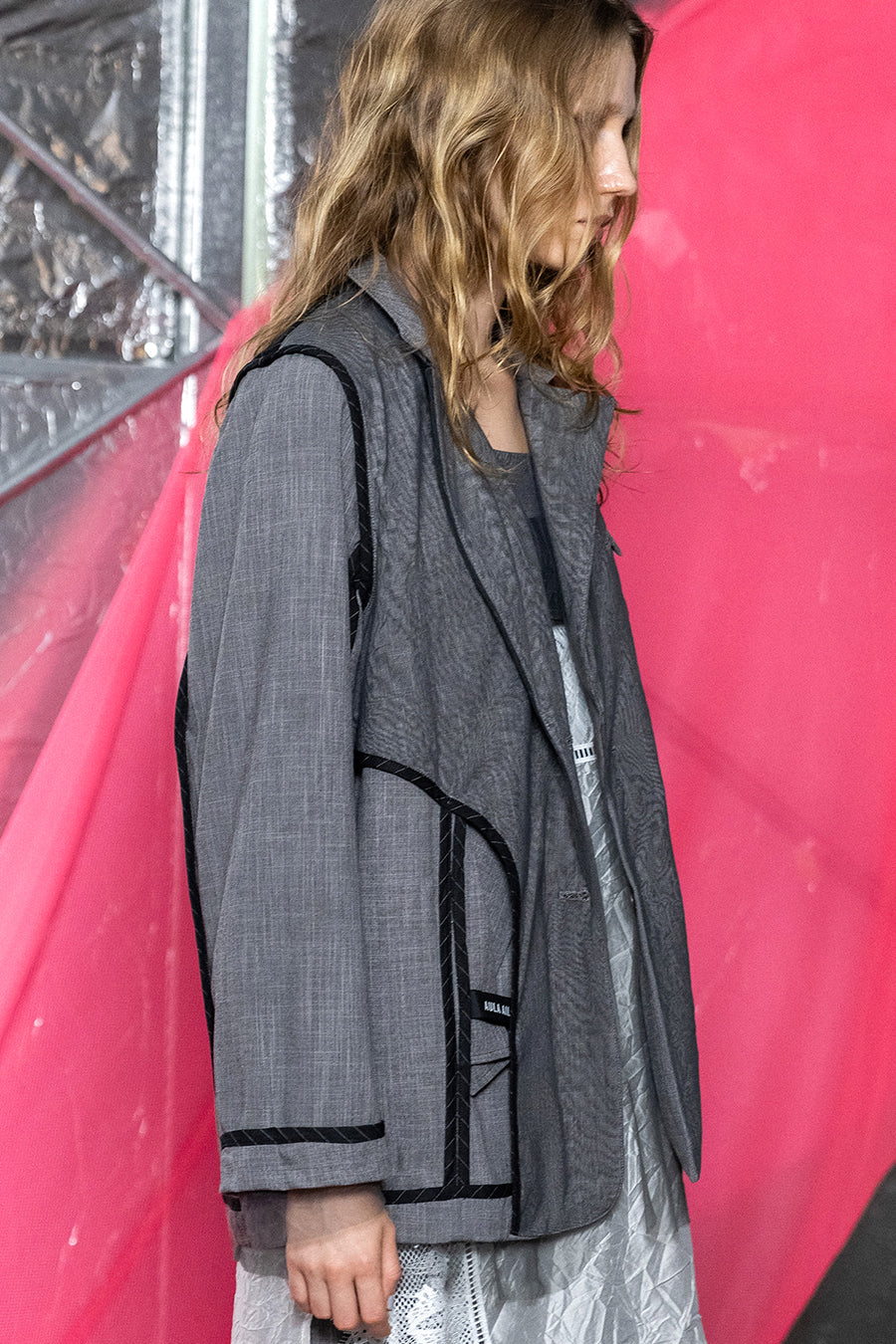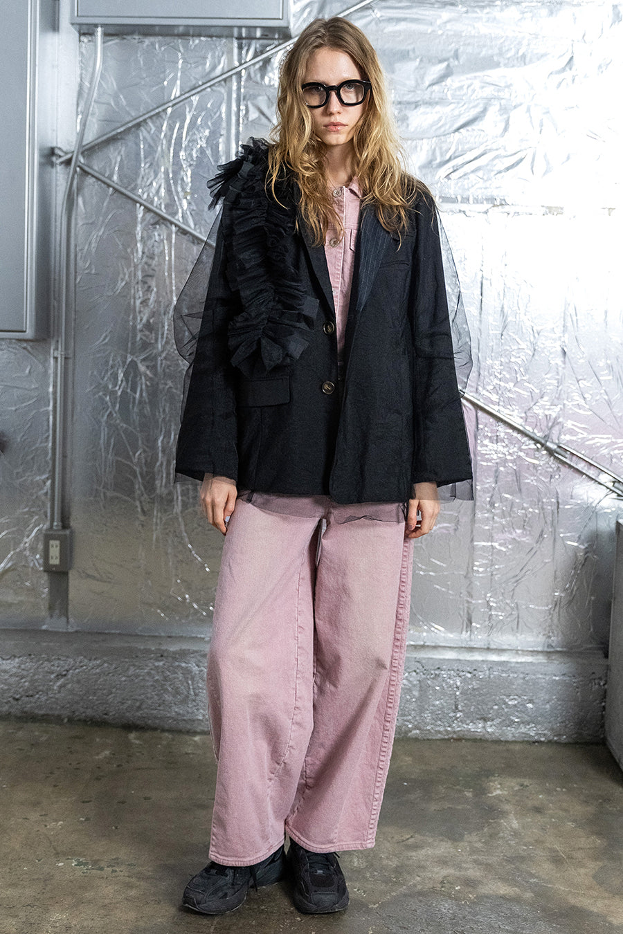 リバーシブルテーラージャケット。肩から垂らす、プリーツフリルがトレンド感をプラス。