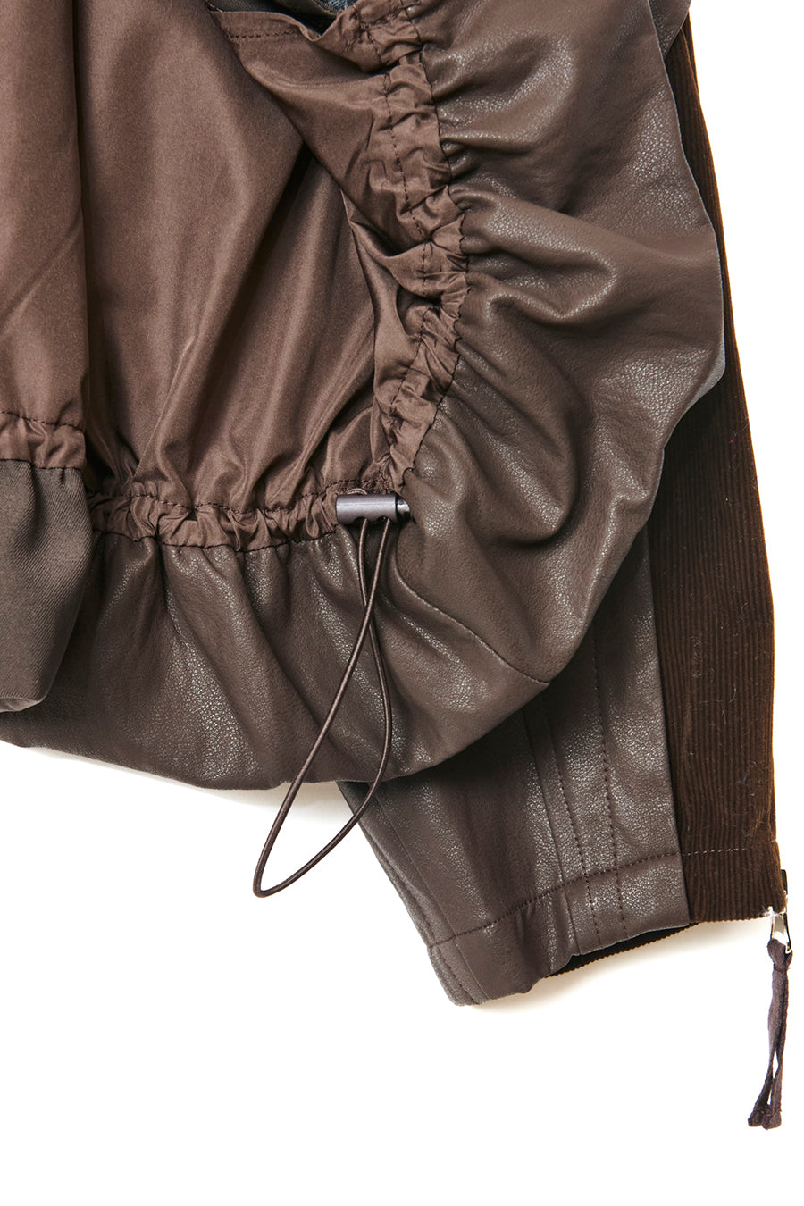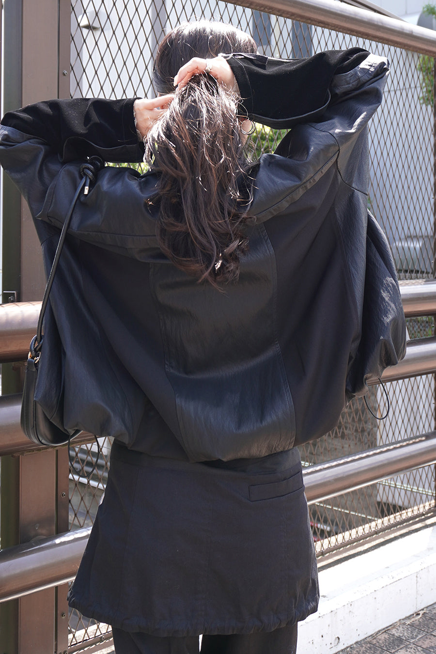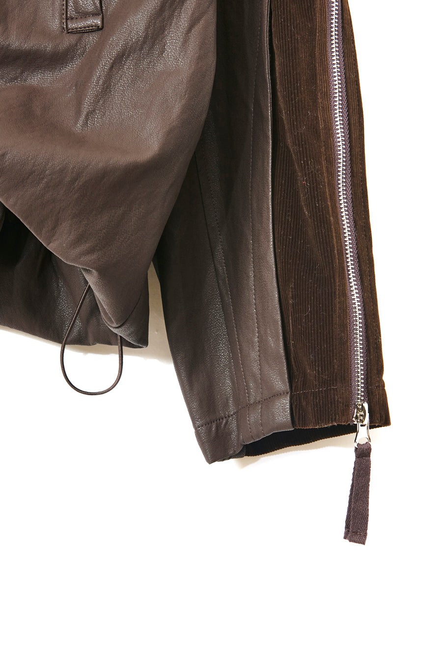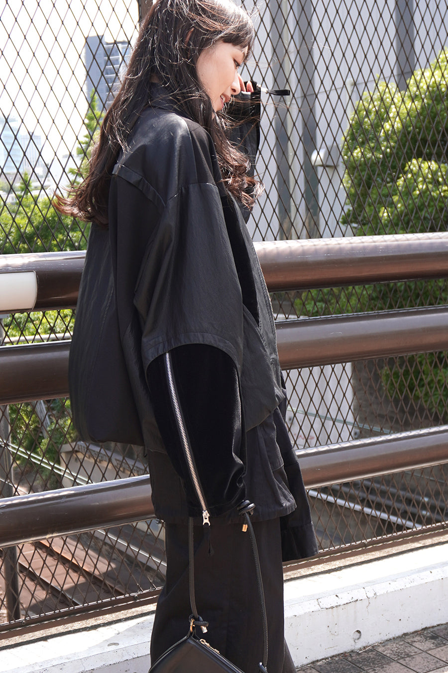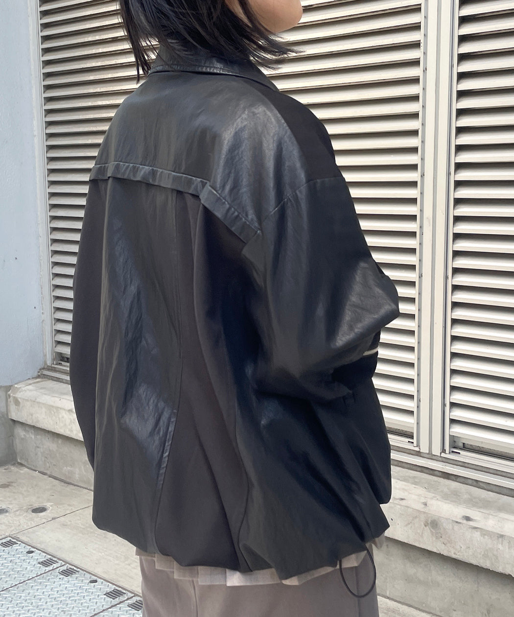 薄くしなやかでヴィンテージ感のあるエコレザーを使ったブルゾン。裾のドロストコードの絞り具合でシルエットが調節でき、ゆったりAラインからボリューミーなバルーンヘムまで、コーディネートに合わせて変えられるのが嬉しい。部分的にTRで切り替えたり、袖口や右ポケット上には深みにあるコーデュロイ素材を組み合わせてアクセントに。身頃のみ裏地付きで、秋口から初冬まで長く着られるアイテム。袖口ファスナースリット仕様。