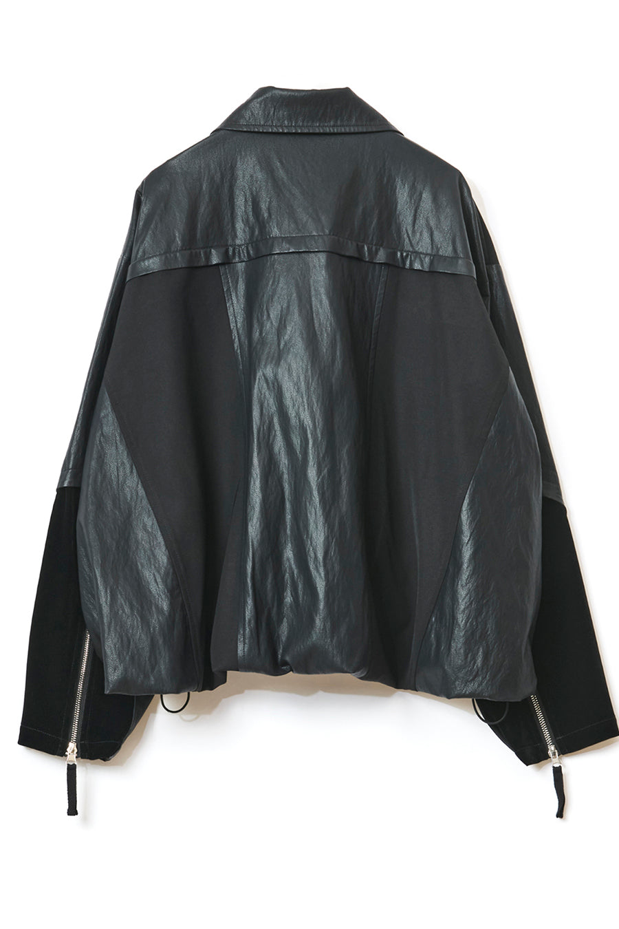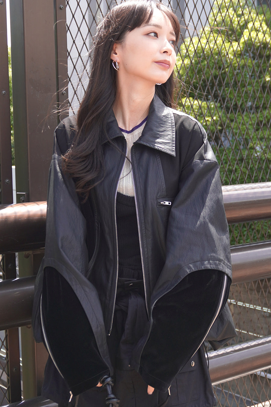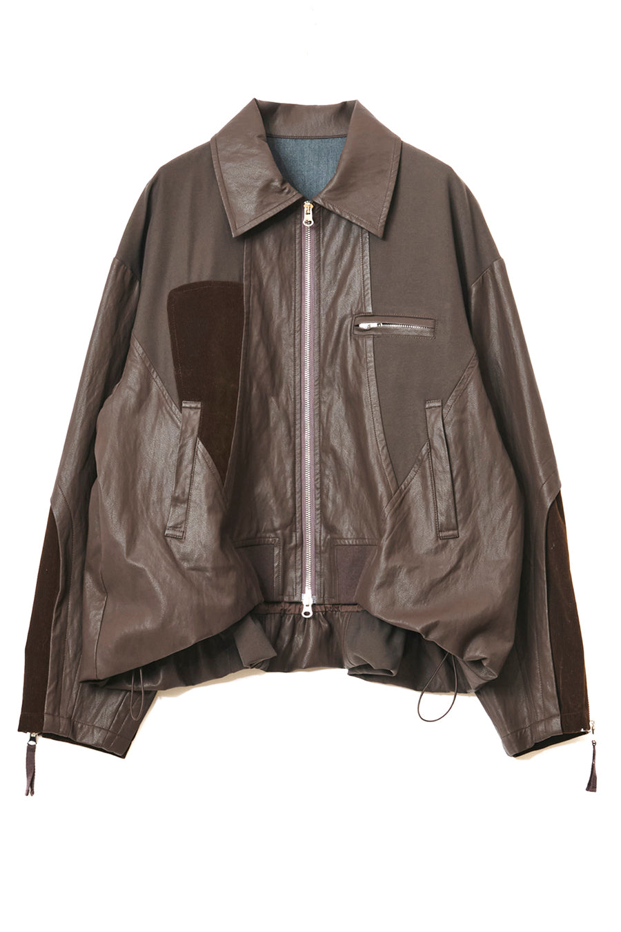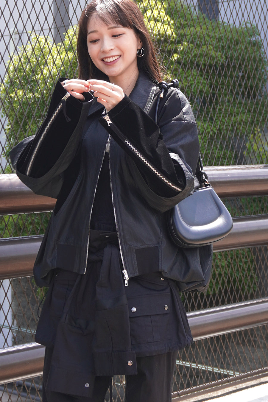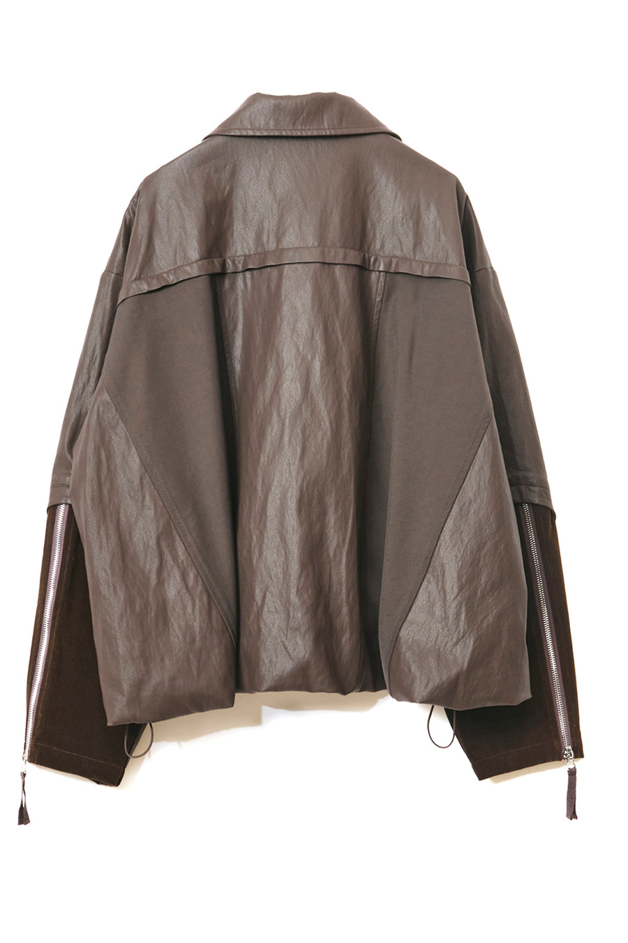薄くしなやかでヴィンテージ感のあるエコレザーを使ったブルゾン。裾のドロストコードの絞り具合でシルエットが調節でき、ゆったりAラインからボリューミーなバルーンヘムまで、コーディネートに合わせて変えられるのが嬉しい。部分的にTRで切り替えたり、袖口や右ポケット上には深みにあるコーデュロイ素材を組み合わせてアクセントに。身頃のみ裏地付きで、秋口から初冬まで長く着られるアイテム。袖口ファスナースリット仕様。