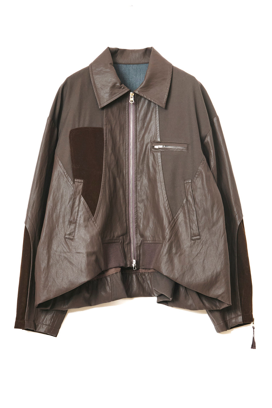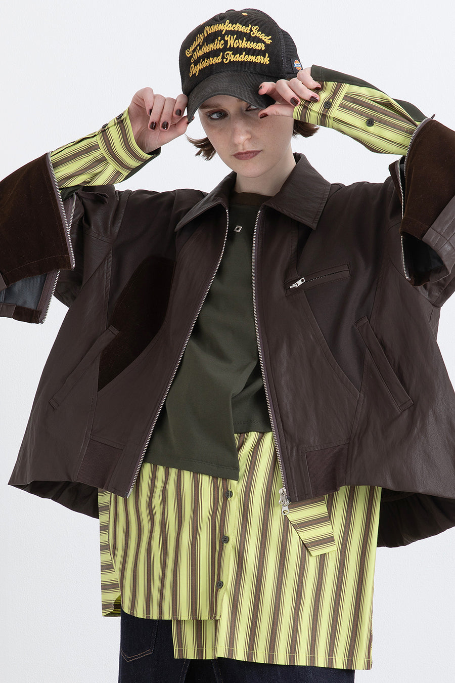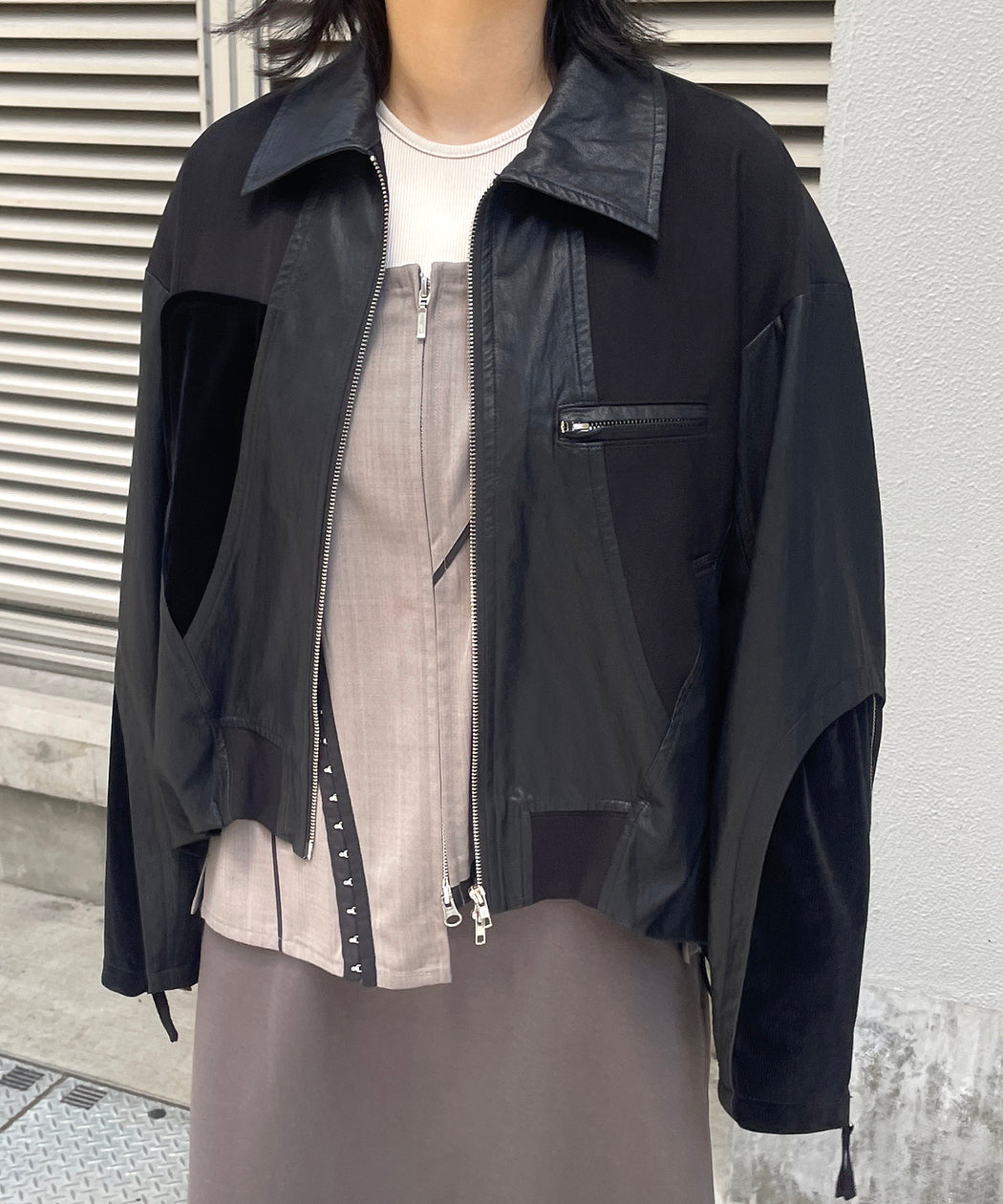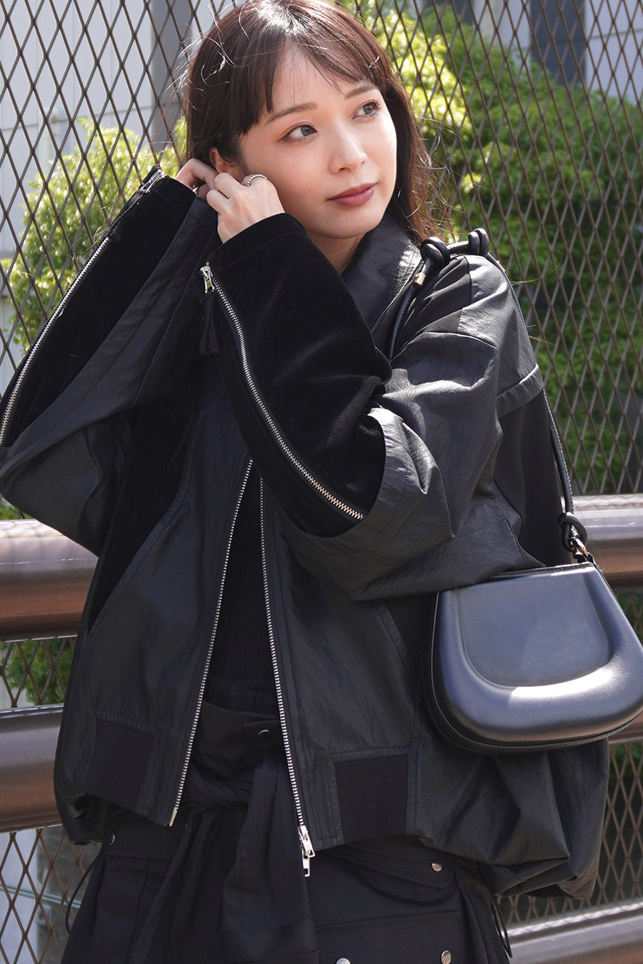 薄くしなやかでヴィンテージ感のあるエコレザーを使ったブルゾン。裾のドロストコードの絞り具合でシルエットが調節でき、ゆったりAラインからボリューミーなバルーンヘムまで、コーディネートに合わせて変えられるのが嬉しい。部分的にTRで切り替えたり、袖口や右ポケット上には深みにあるコーデュロイ素材を組み合わせてアクセントに。身頃のみ裏地付きで、秋口から初冬まで長く着られるアイテム。袖口ファスナースリット仕様。