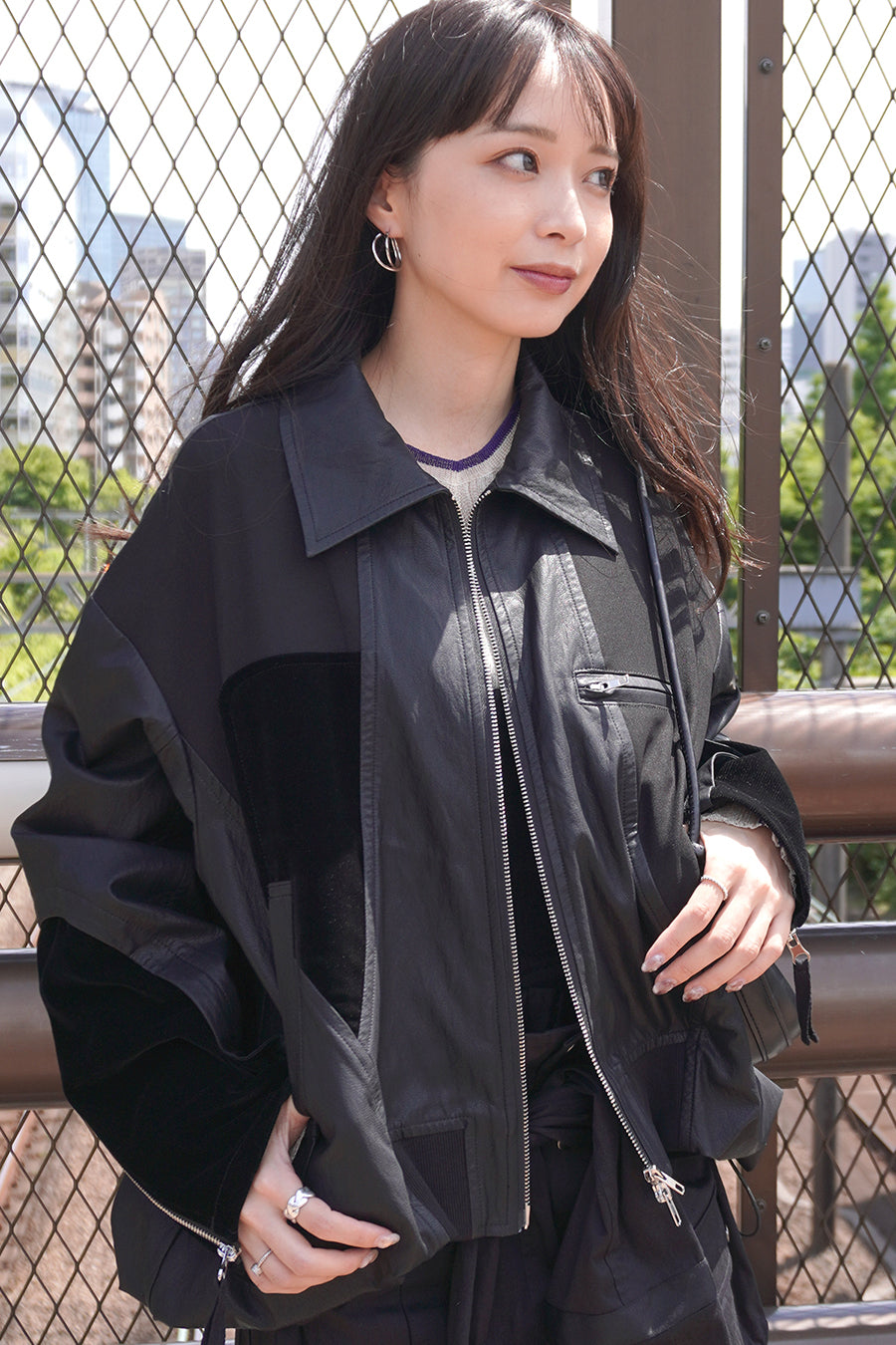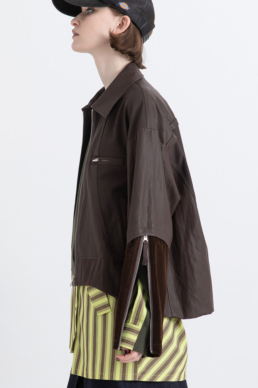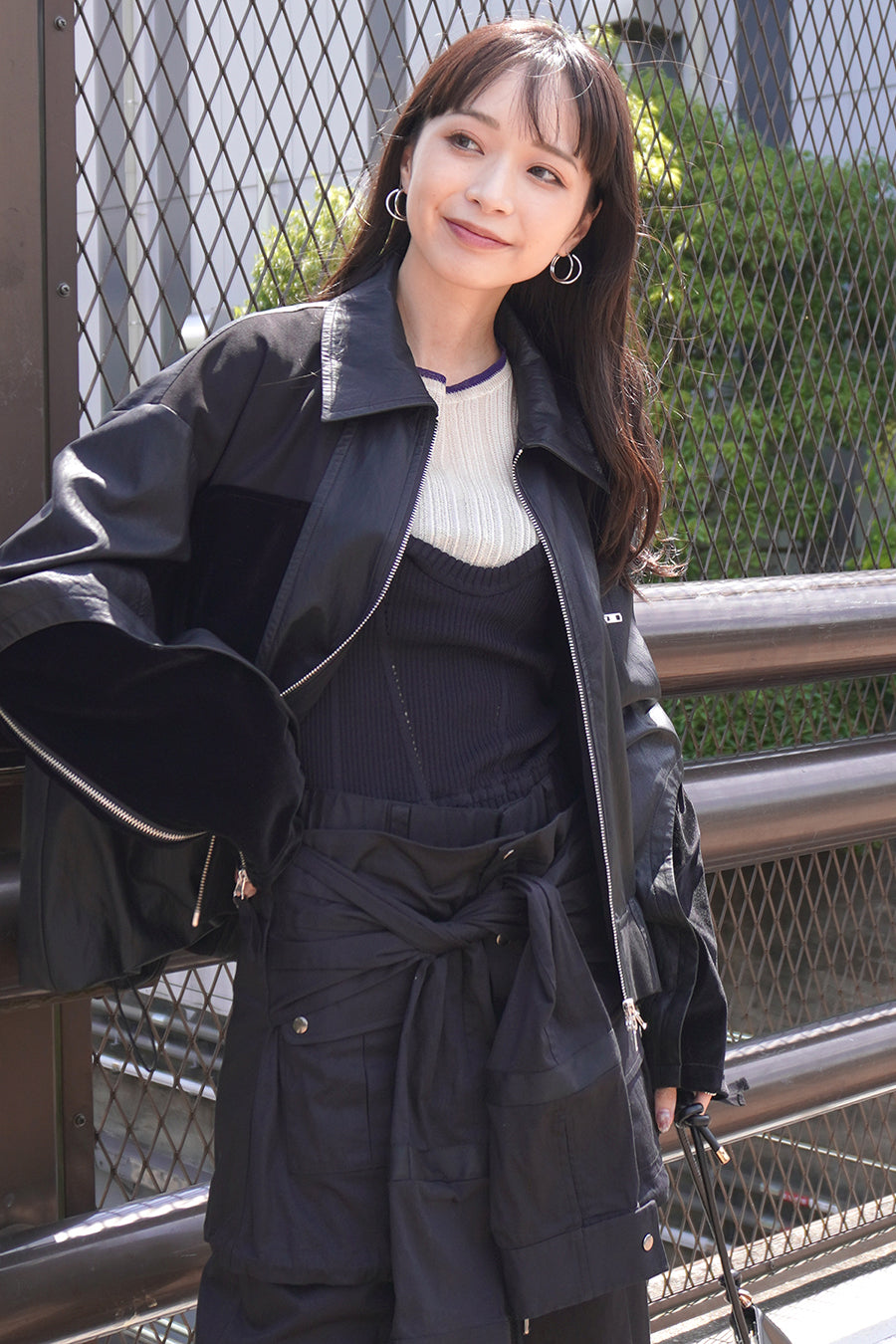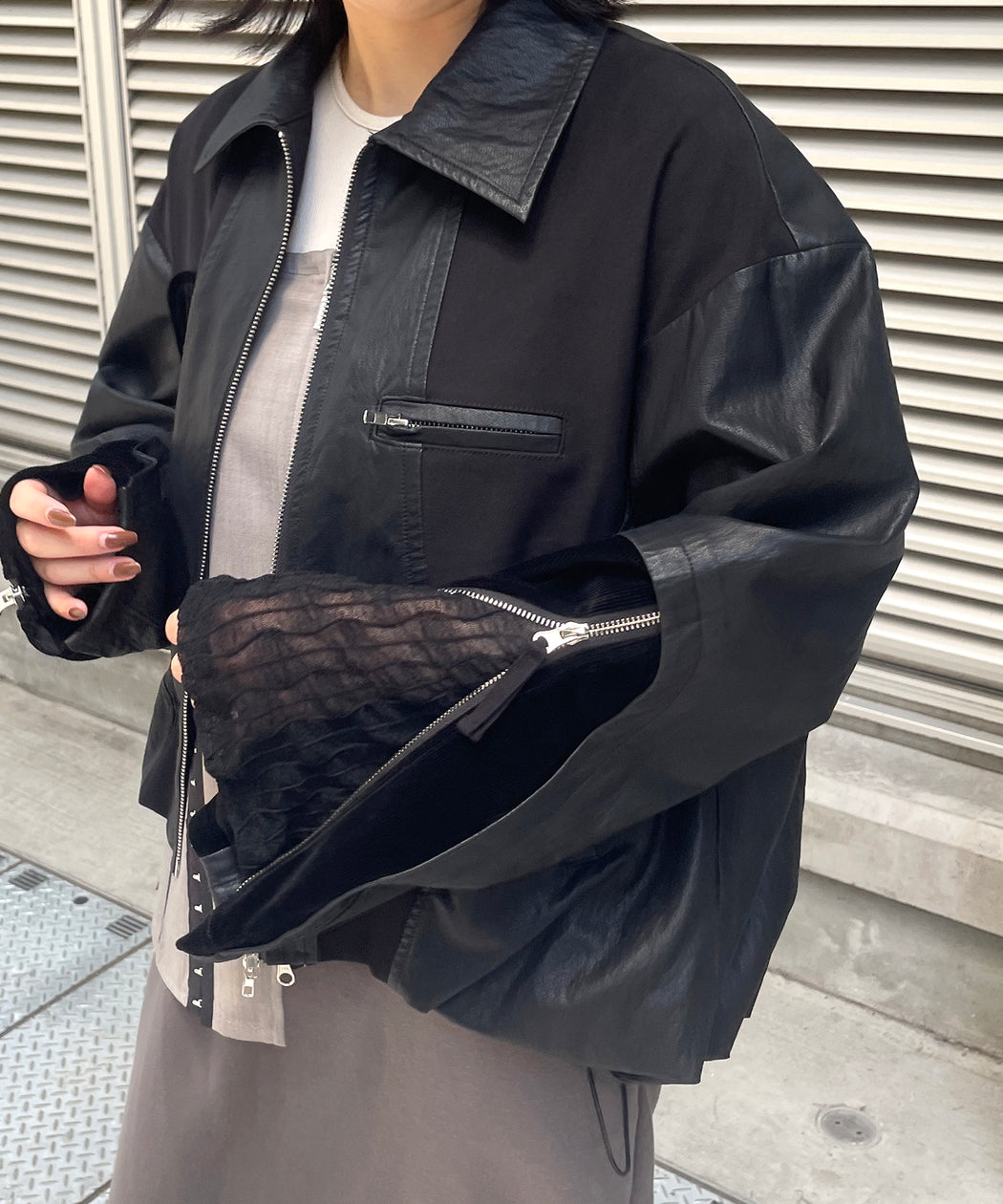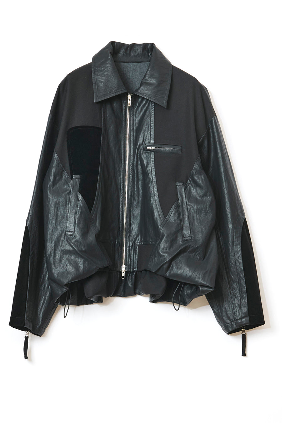 薄くしなやかでヴィンテージ感のあるエコレザーを使ったブルゾン。裾のドロストコードの絞り具合でシルエットが調節でき、ゆったりAラインからボリューミーなバルーンヘムまで、コーディネートに合わせて変えられるのが嬉しい。部分的にTRで切り替えたり、袖口や右ポケット上には深みにあるコーデュロイ素材を組み合わせてアクセントに。身頃のみ裏地付きで、秋口から初冬まで長く着られるアイテム。袖口ファスナースリット仕様。
