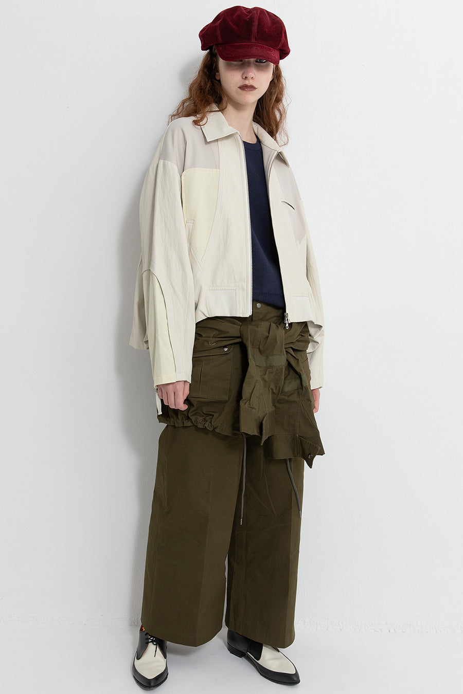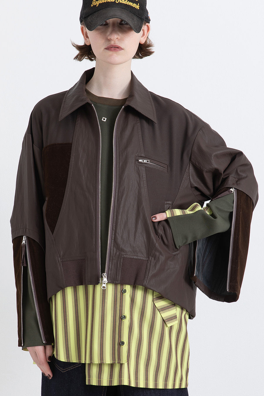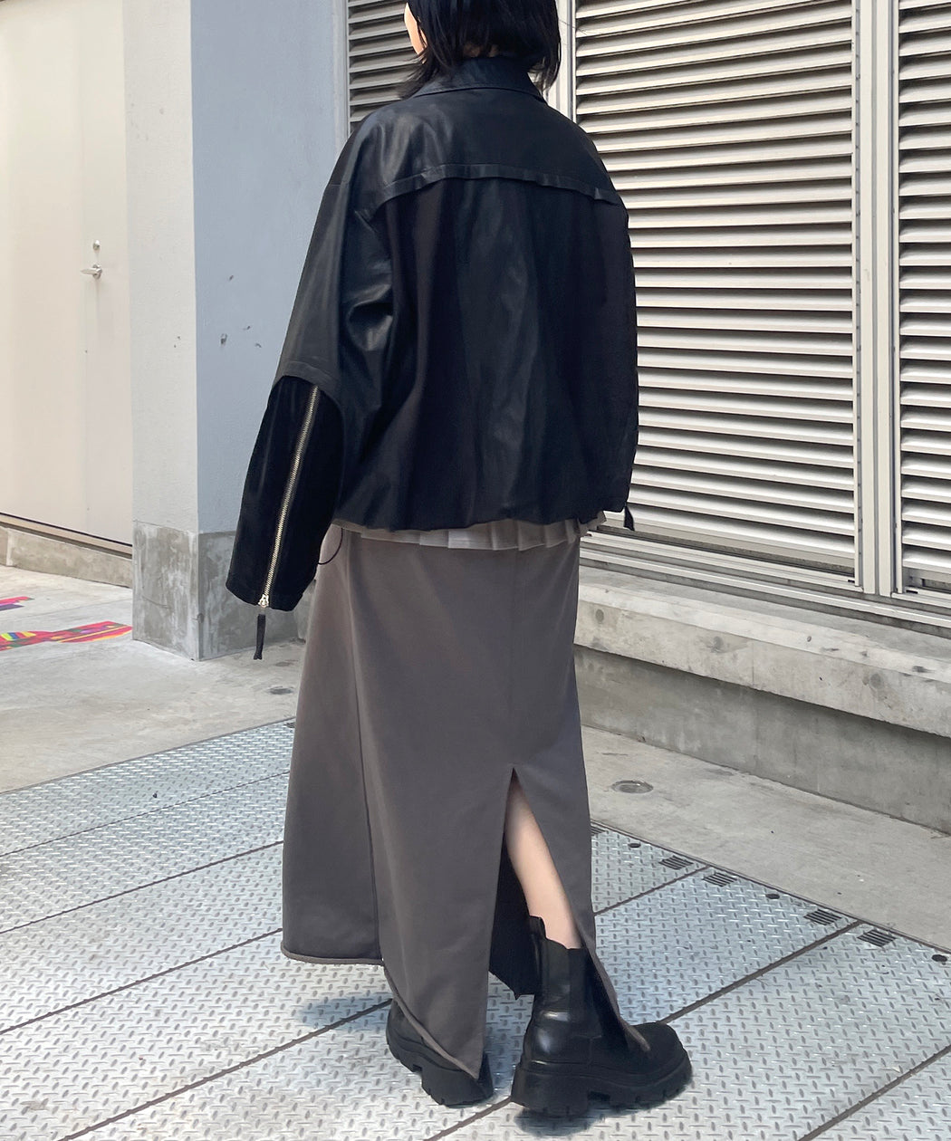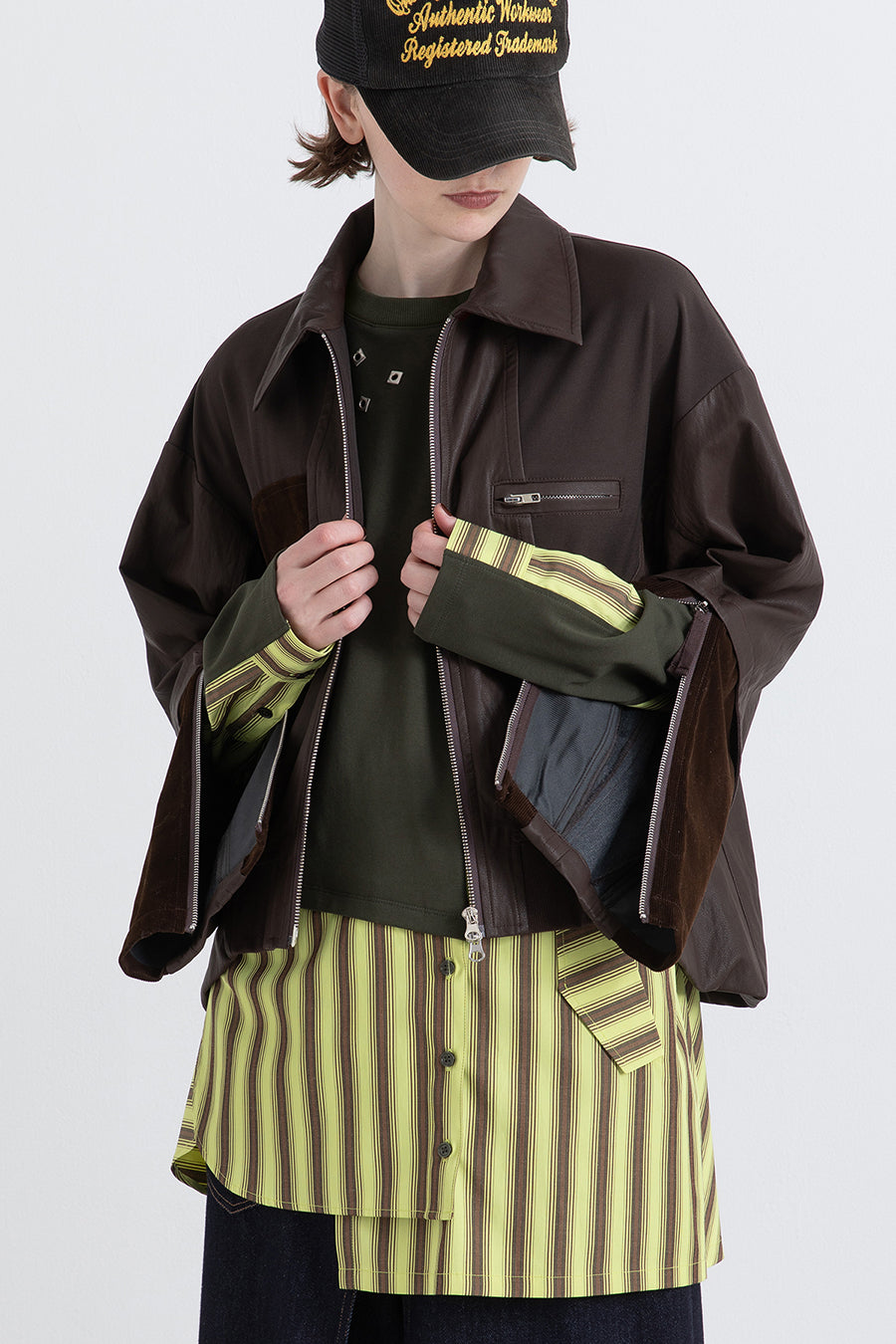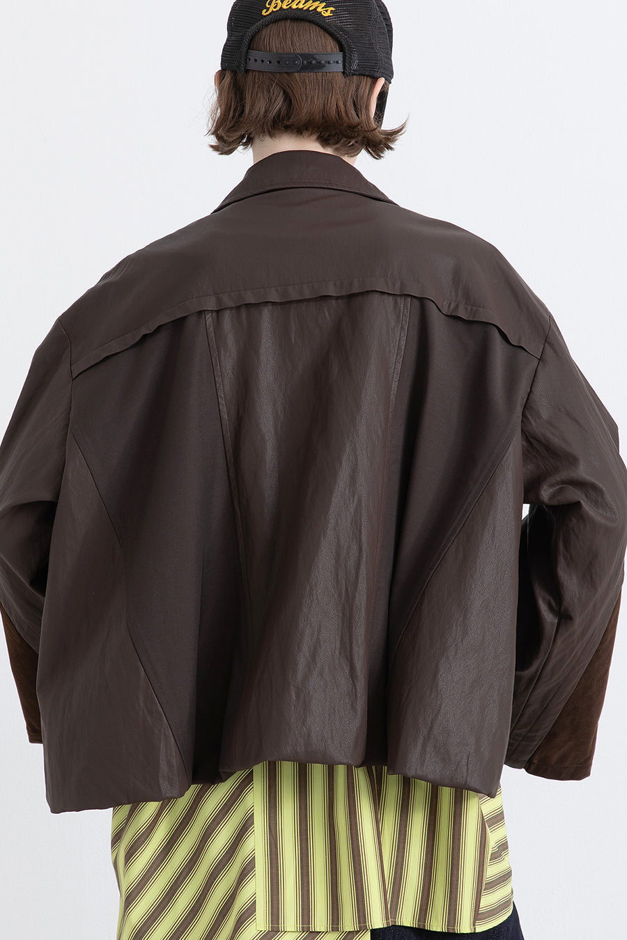 薄くしなやかでヴィンテージ感のあるエコレザーを使ったブルゾン。裾のドロストコードの絞り具合でシルエットが調節でき、ゆったりAラインからボリューミーなバルーンヘムまで、コーディネートに合わせて変えられるのが嬉しい。部分的にTRで切り替えたり、袖口や右ポケット上には深みにあるコーデュロイ素材を組み合わせてアクセントに。身頃のみ裏地付きで、秋口から初冬まで長く着られるアイテム。袖口ファスナースリット仕様。