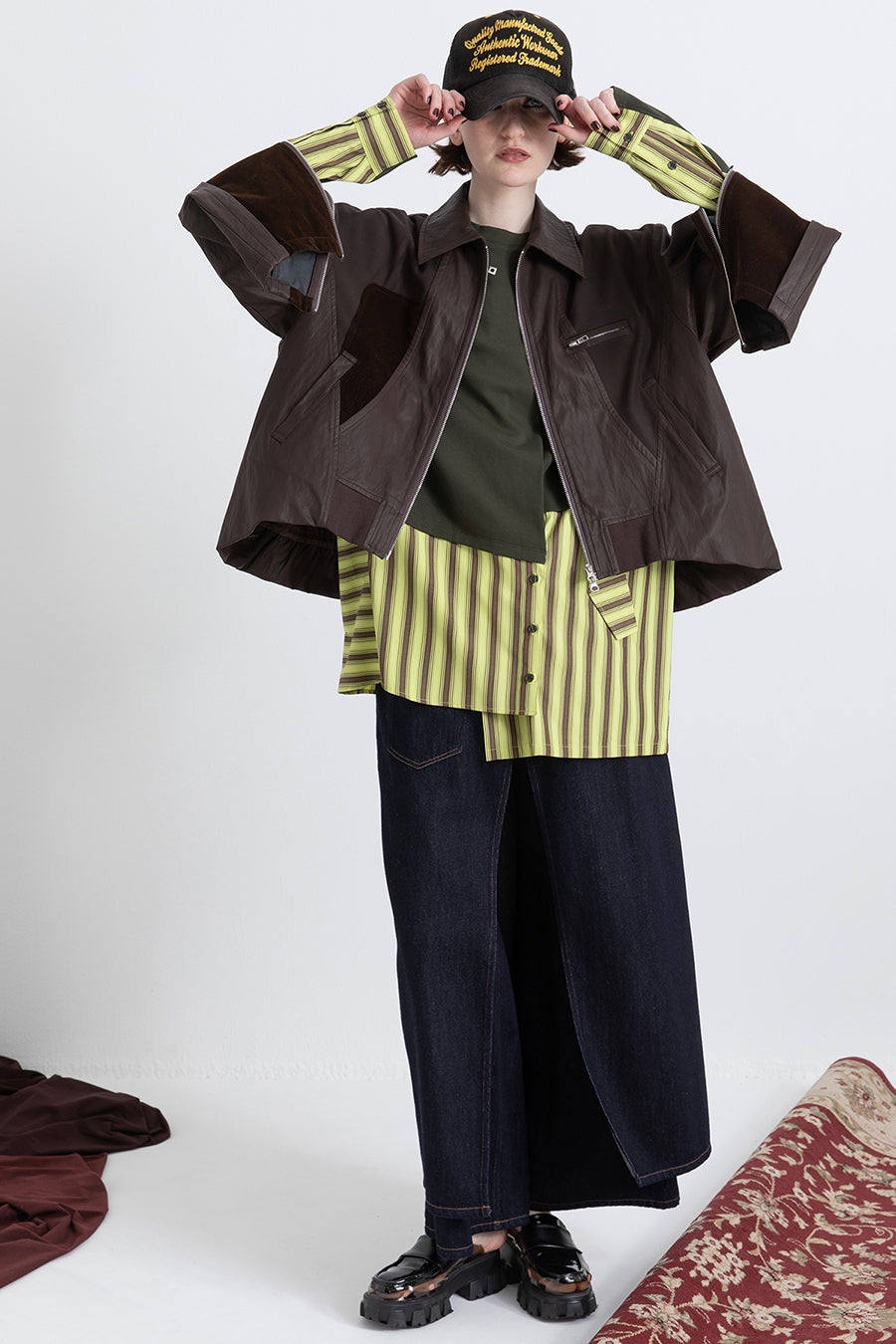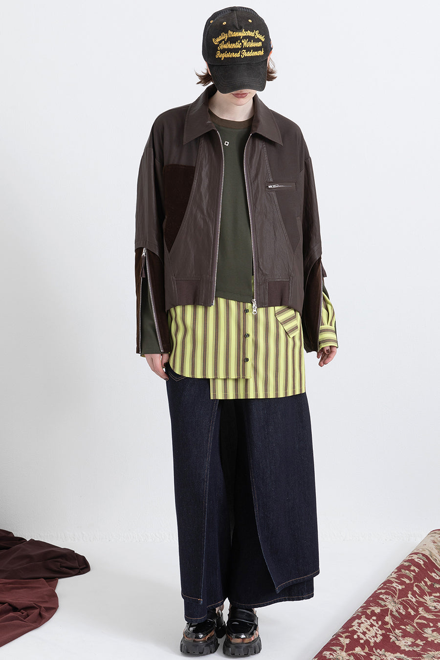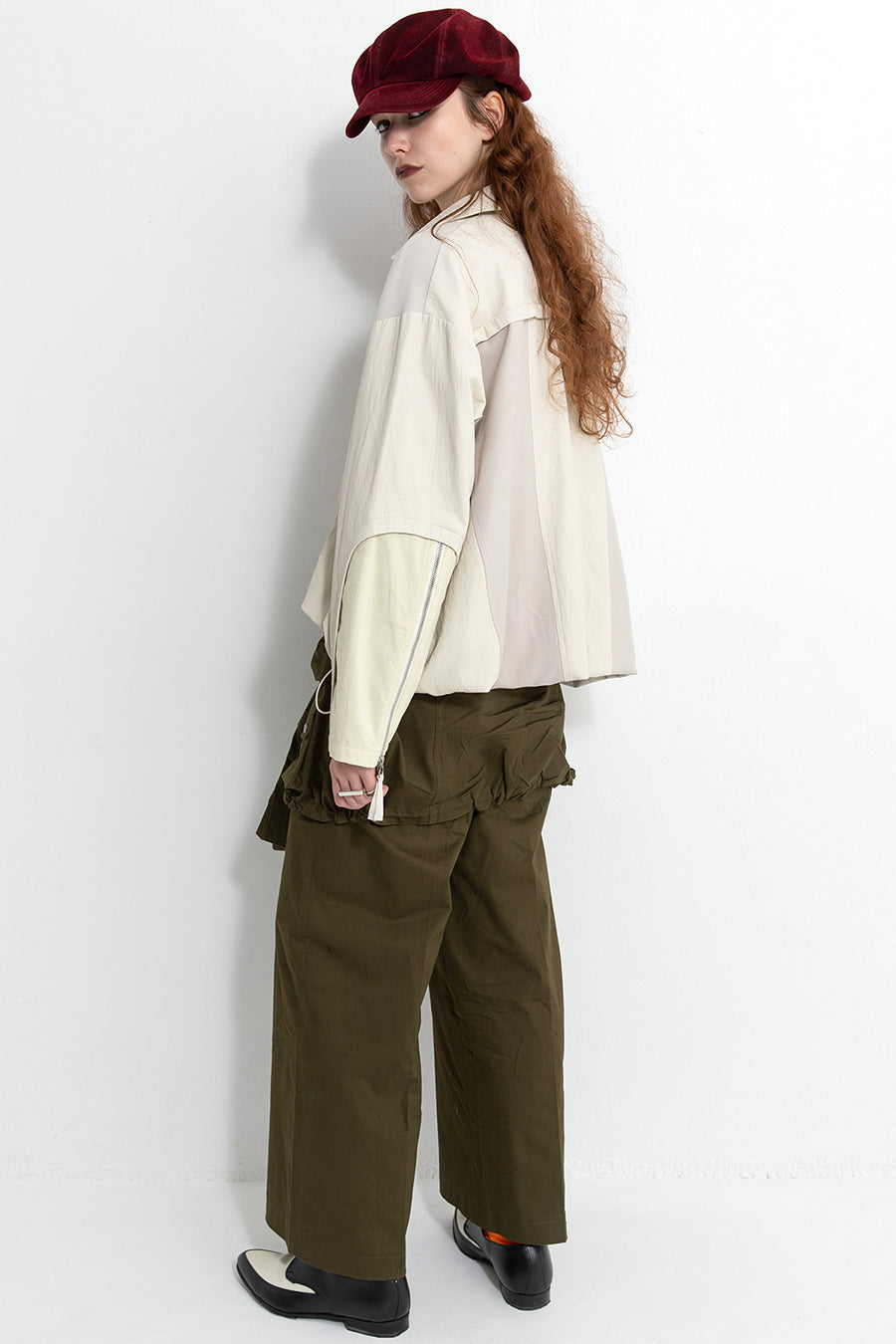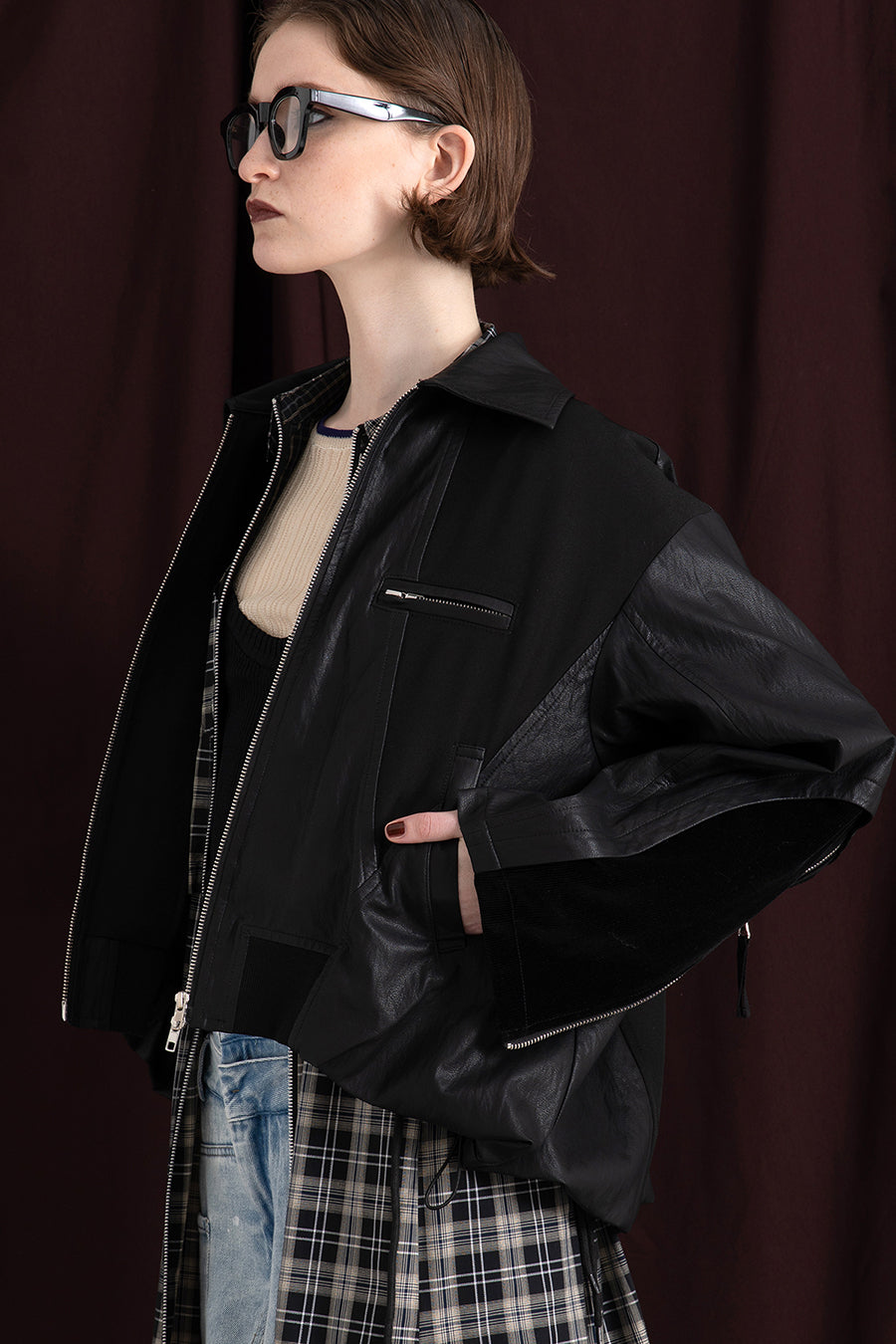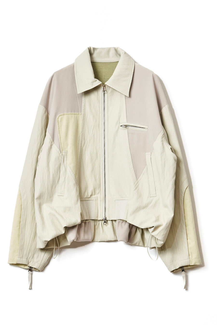 薄くしなやかでヴィンテージ感のあるエコレザーを使ったブルゾン。裾のドロストコードの絞り具合でシルエットが調節でき、ゆったりAラインからボリューミーなバルーンヘムまで、コーディネートに合わせて変えられるのが嬉しい。部分的にTRで切り替えたり、袖口や右ポケット上には深みにあるコーデュロイ素材を組み合わせてアクセントに。身頃のみ裏地付きで、秋口から初冬まで長く着られるアイテム。袖口ファスナースリット仕様。