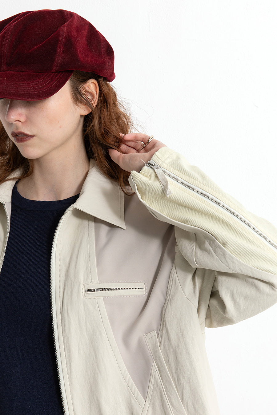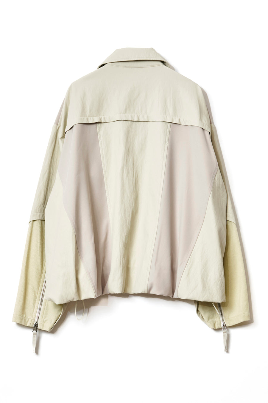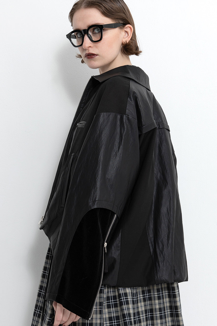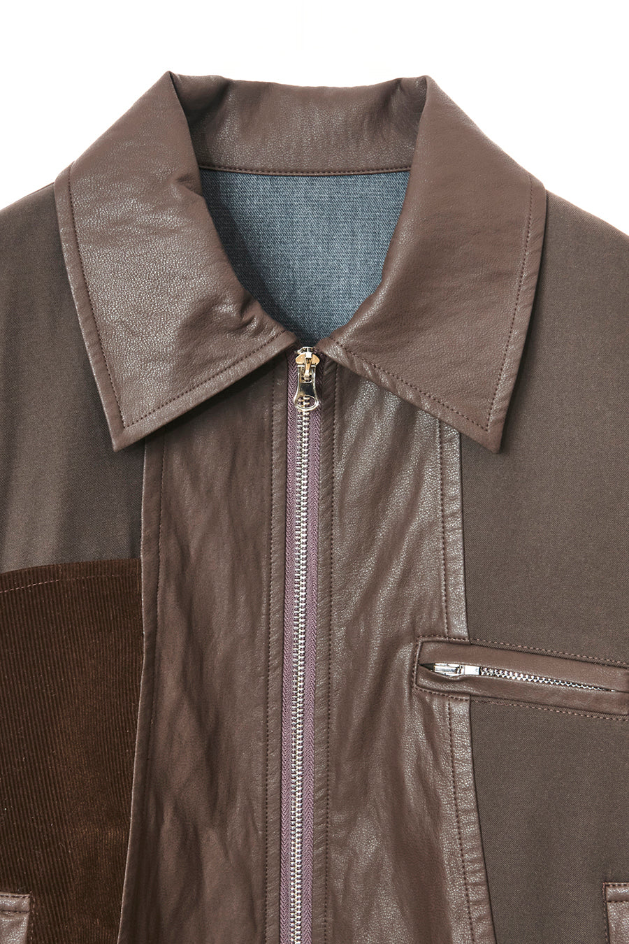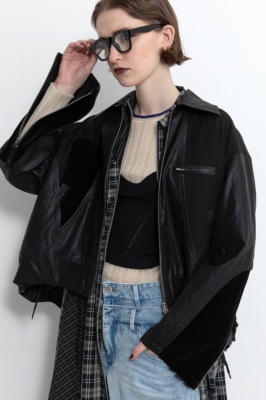 薄くしなやかでヴィンテージ感のあるエコレザーを使ったブルゾン。裾のドロストコードの絞り具合でシルエットが調節でき、ゆったりAラインからボリューミーなバルーンヘムまで、コーディネートに合わせて変えられるのが嬉しい。部分的にTRで切り替えたり、袖口や右ポケット上には深みにあるコーデュロイ素材を組み合わせてアクセントに。身頃のみ裏地付きで、秋口から初冬まで長く着られるアイテム。袖口ファスナースリット仕様。