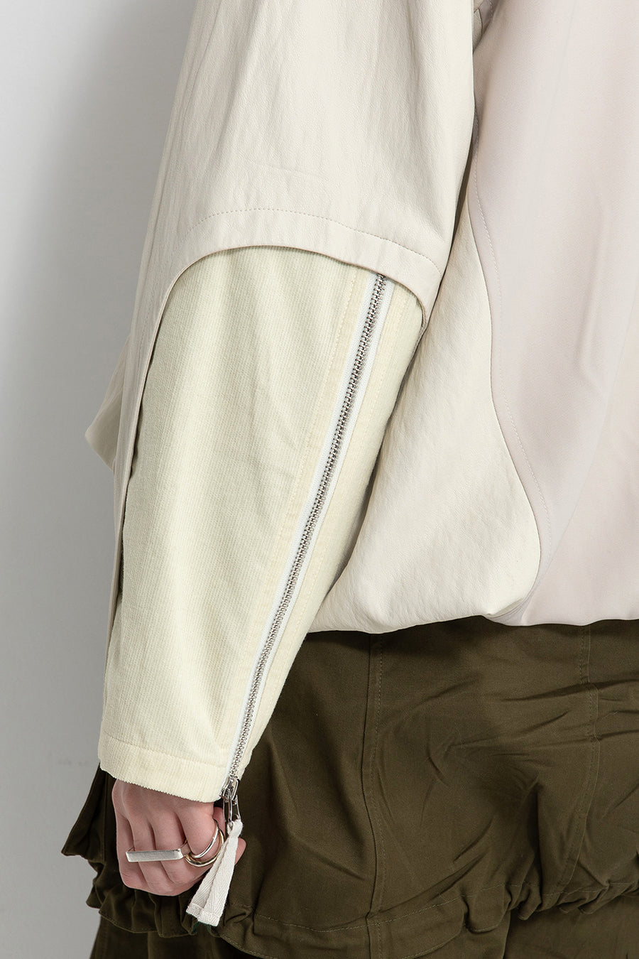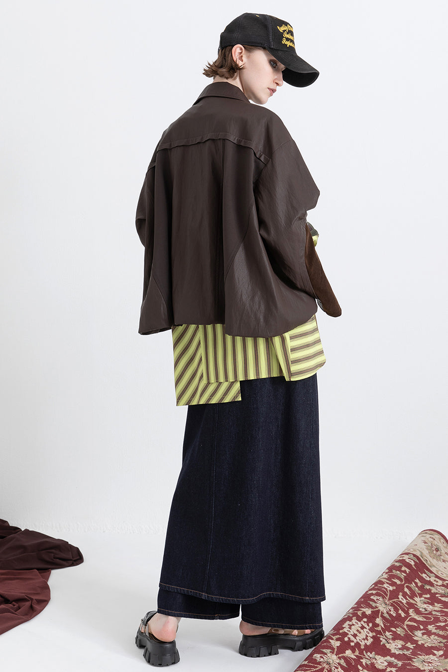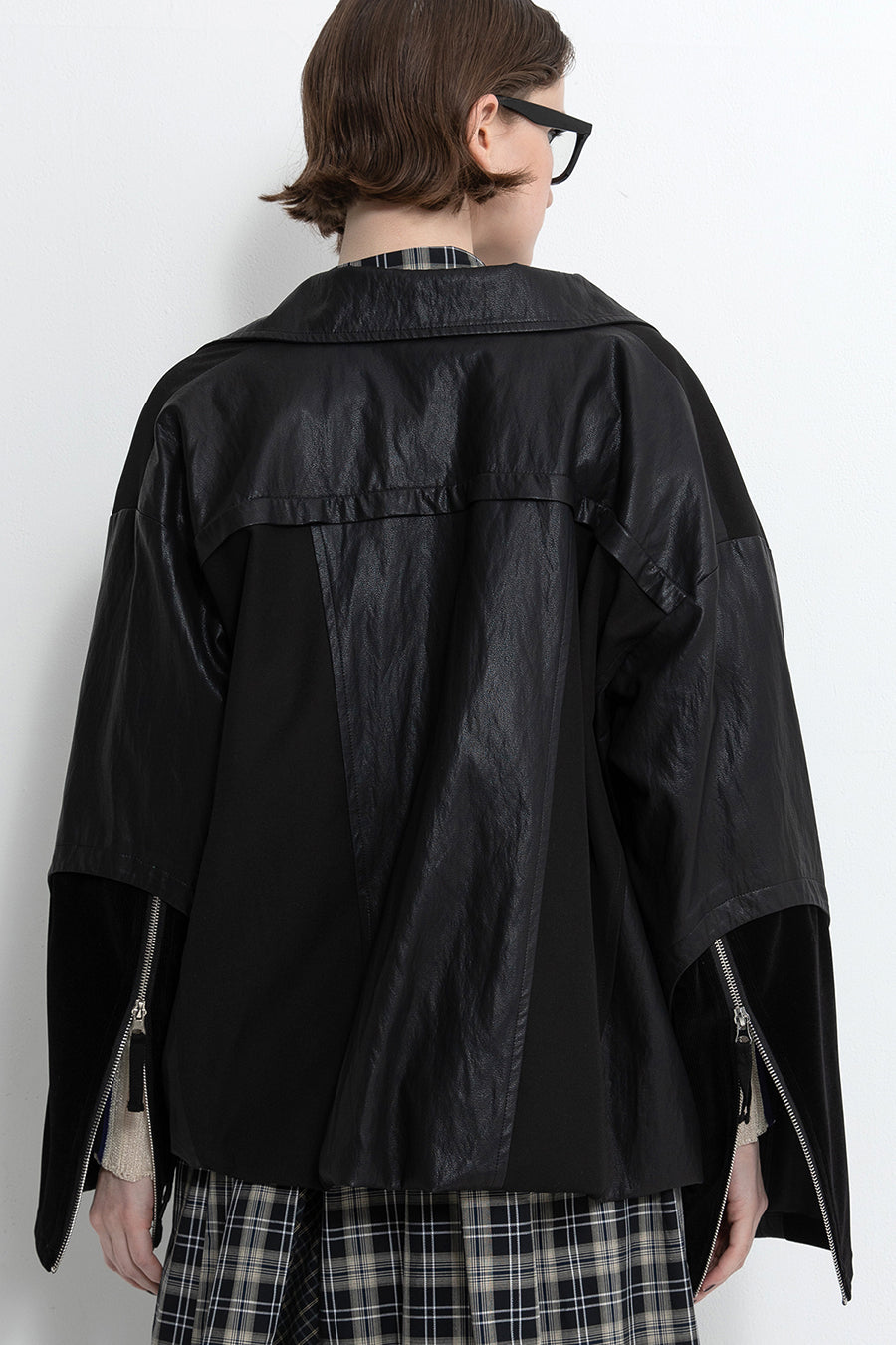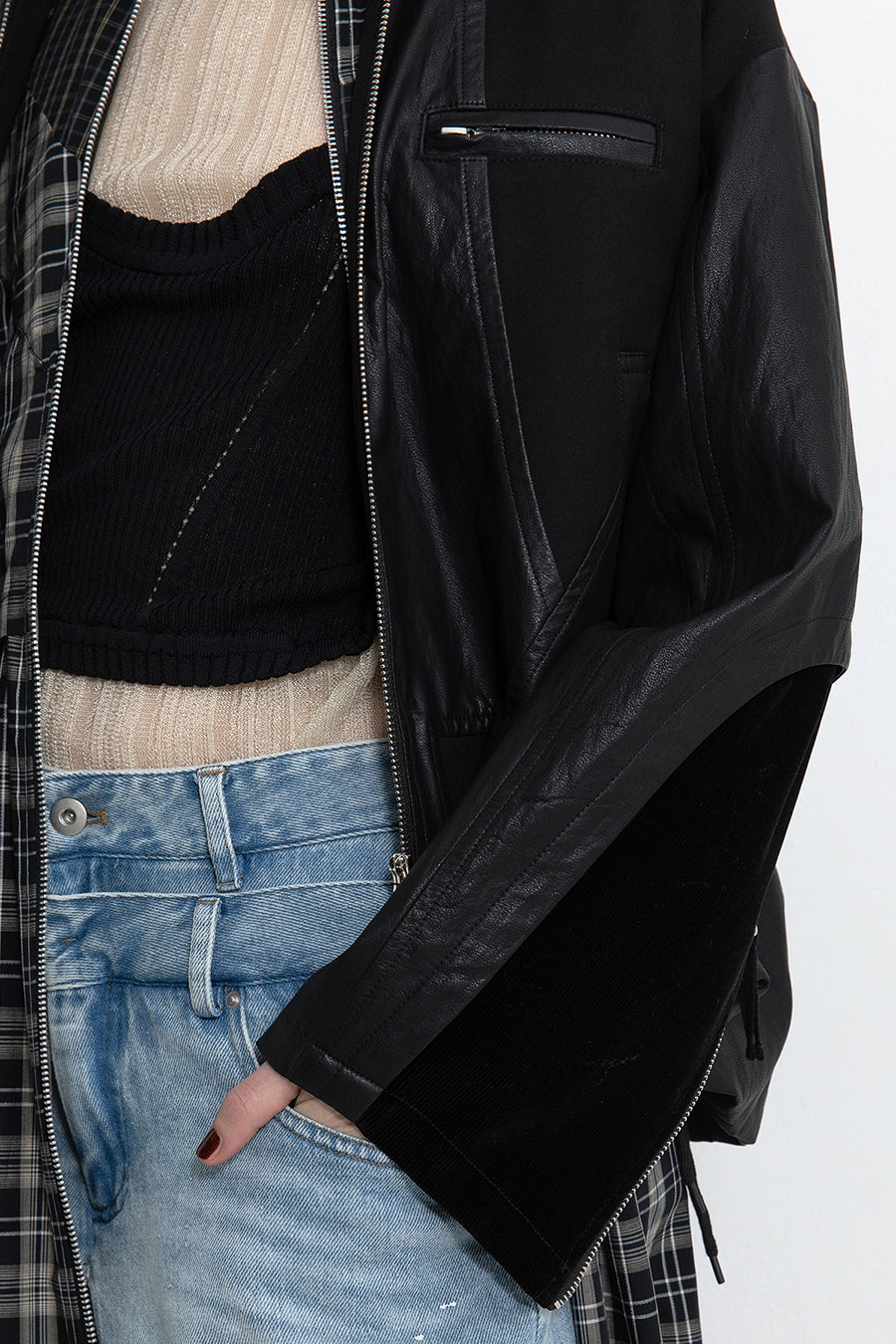 薄くしなやかでヴィンテージ感のあるエコレザーを使ったブルゾン。裾のドロストコードの絞り具合でシルエットが調節でき、ゆったりAラインからボリューミーなバルーンヘムまで、コーディネートに合わせて変えられるのが嬉しい。部分的にTRで切り替えたり、袖口や右ポケット上には深みにあるコーデュロイ素材を組み合わせてアクセントに。身頃のみ裏地付きで、秋口から初冬まで長く着られるアイテム。袖口ファスナースリット仕様。