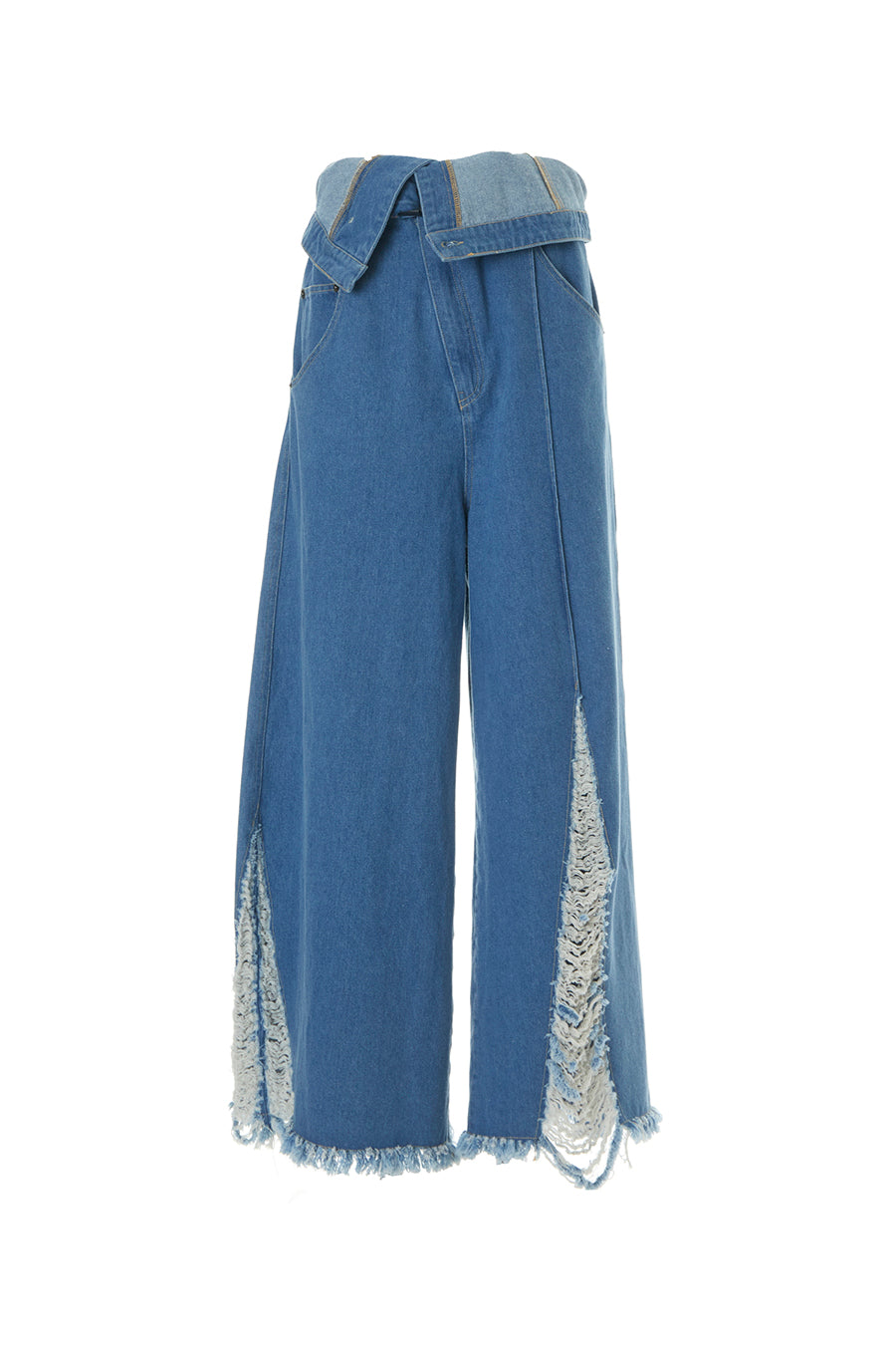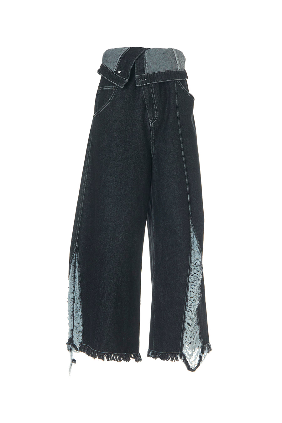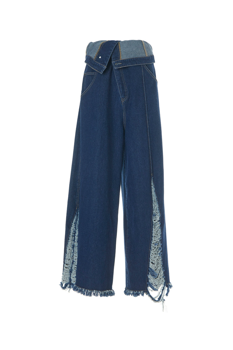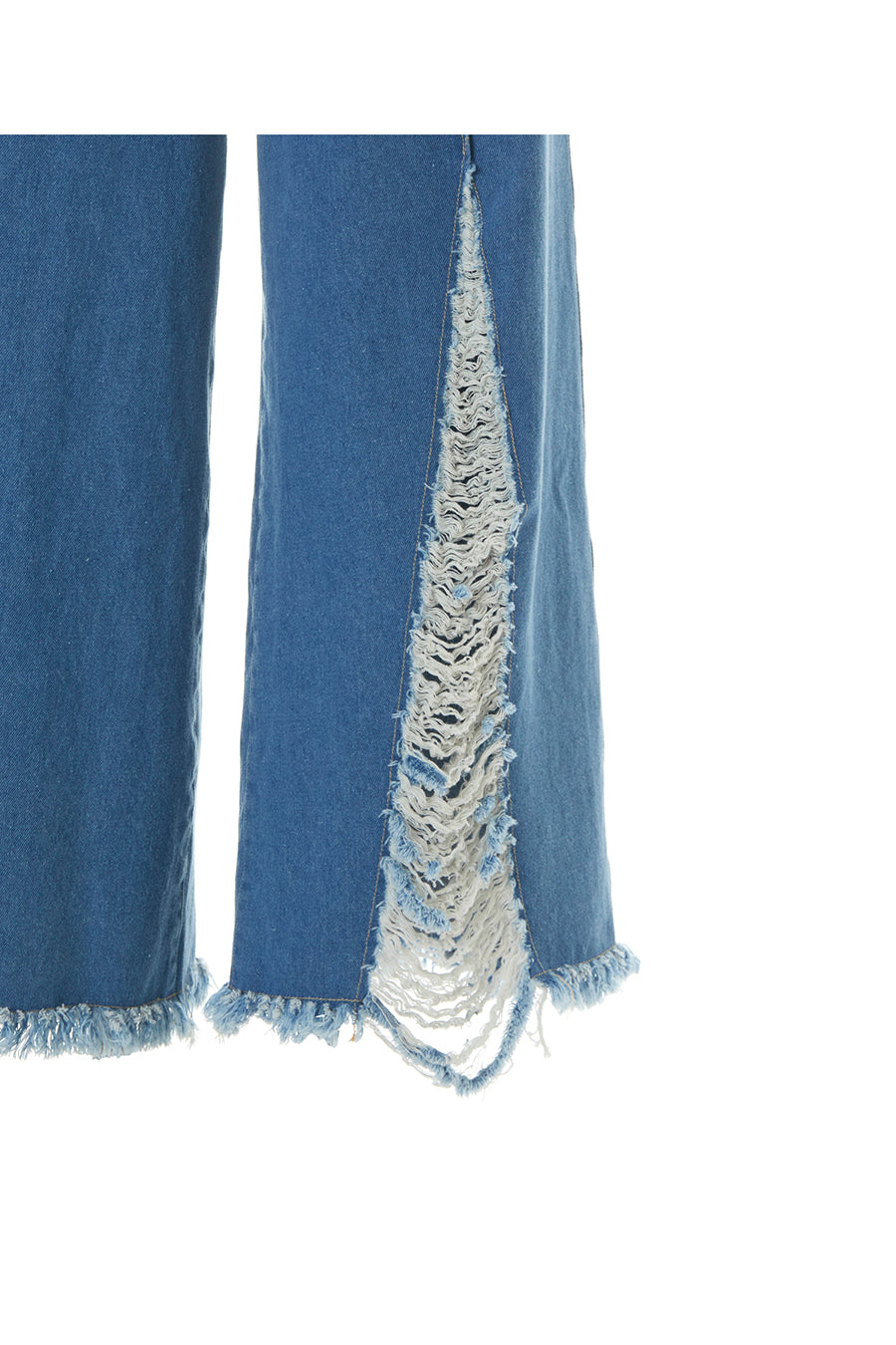 裾に大胆なダメージ入りのデニムパンツ。ダメージ加工は横糸を残した三角のダメージで、裾に2か所ポイントで加工。
