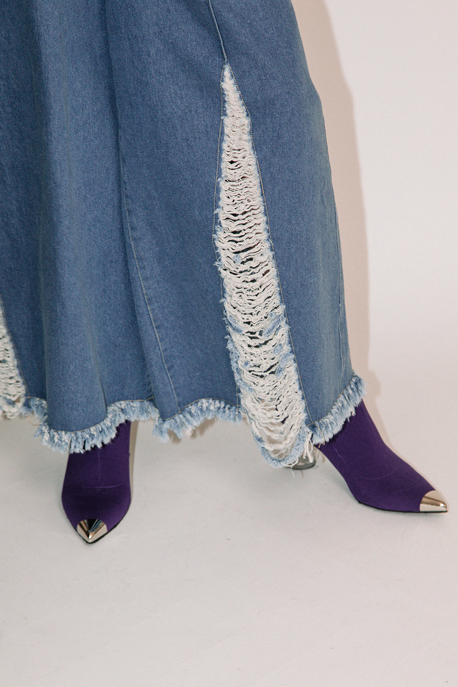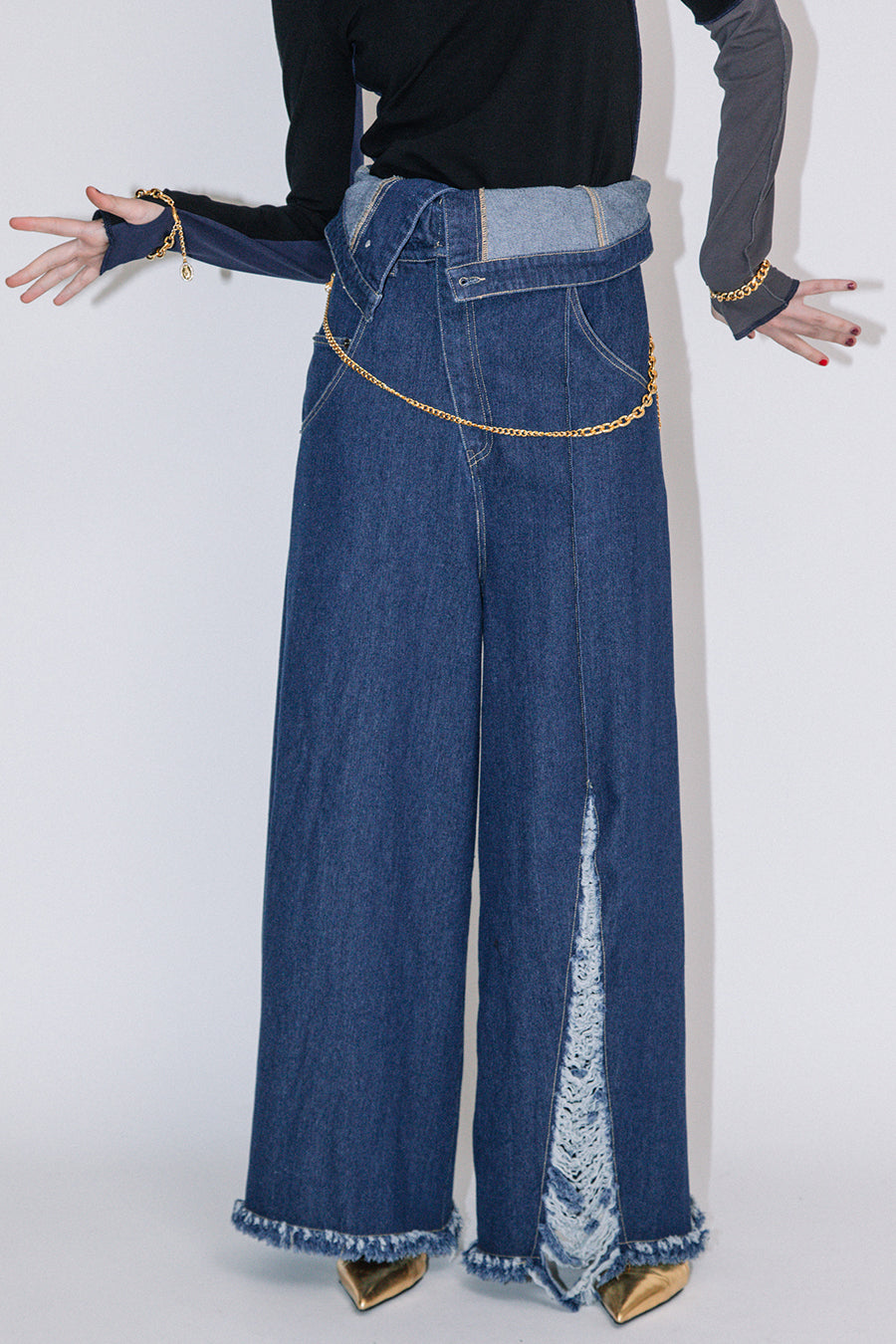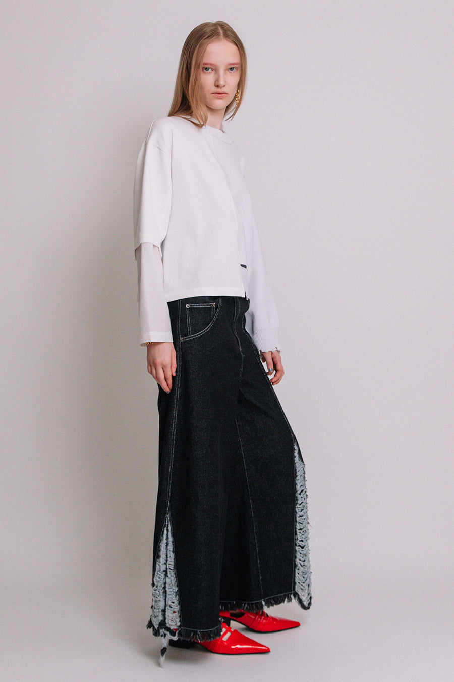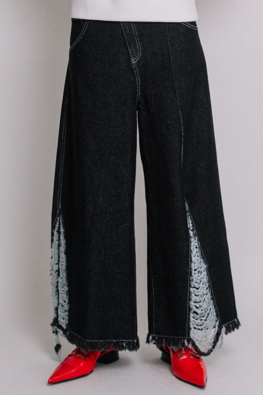 裾に大胆なダメージ入りのデニムパンツ。ダメージ加工は横糸を残した三角のダメージで、裾に2か所ポイントで加工。