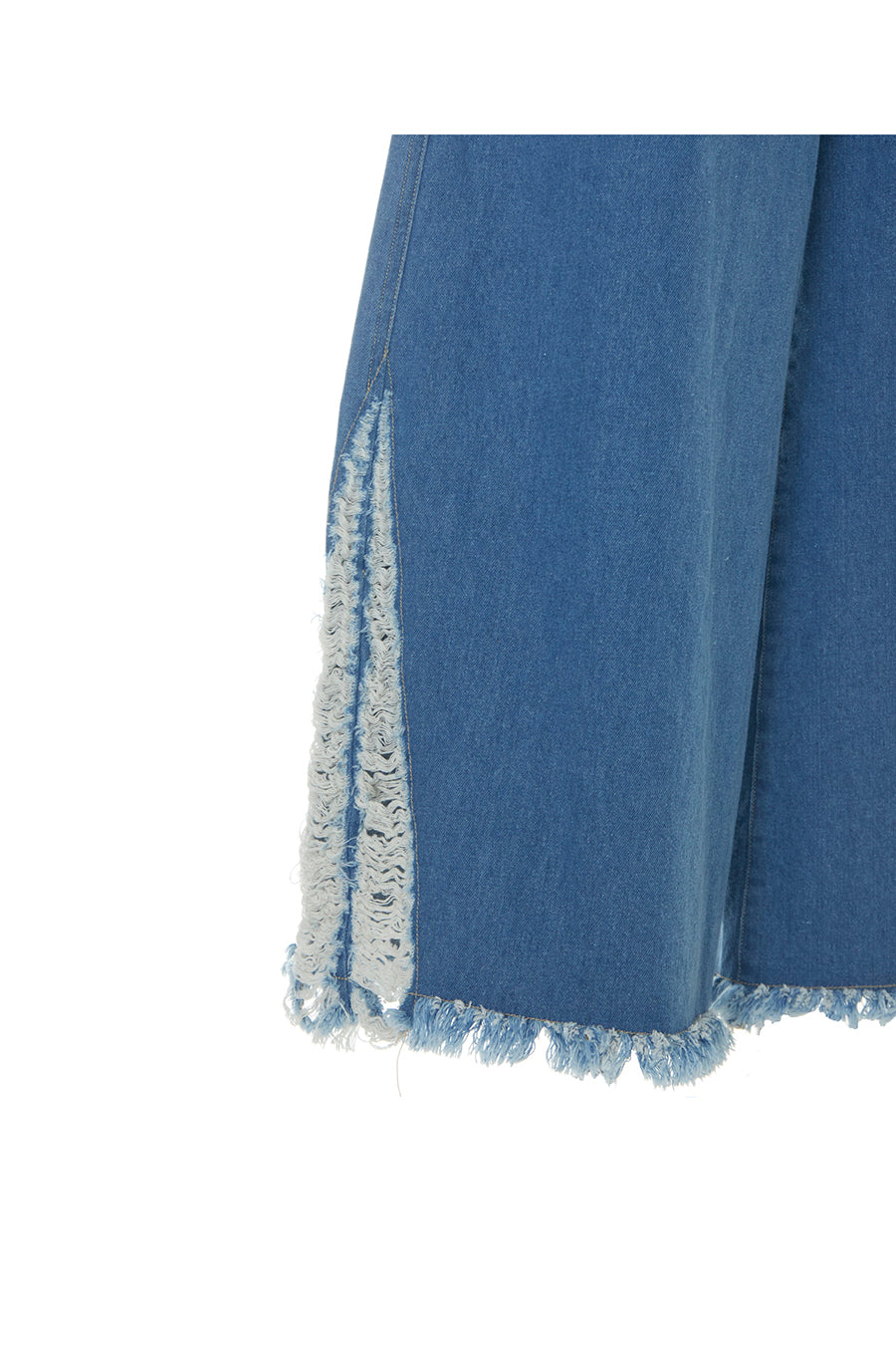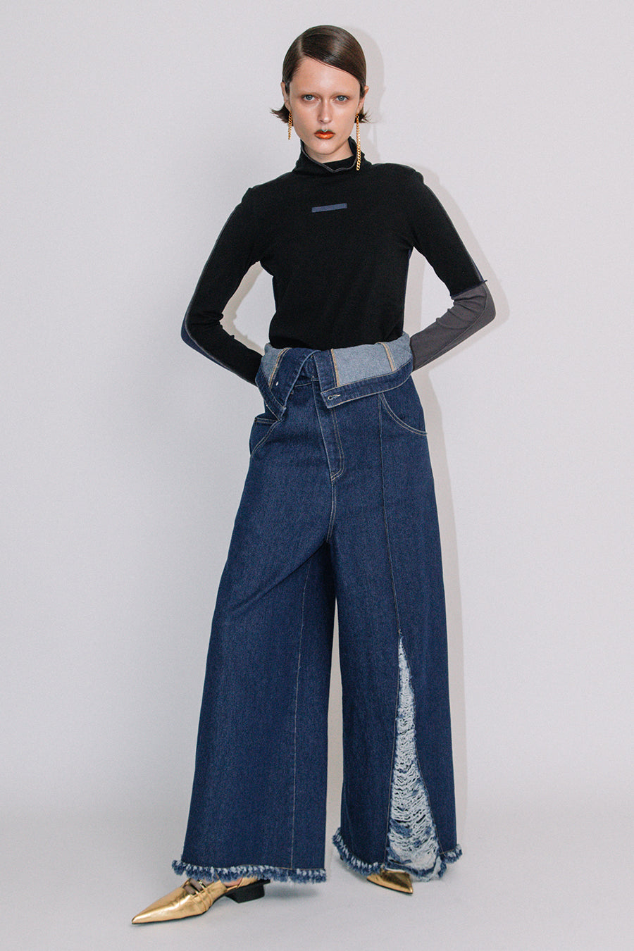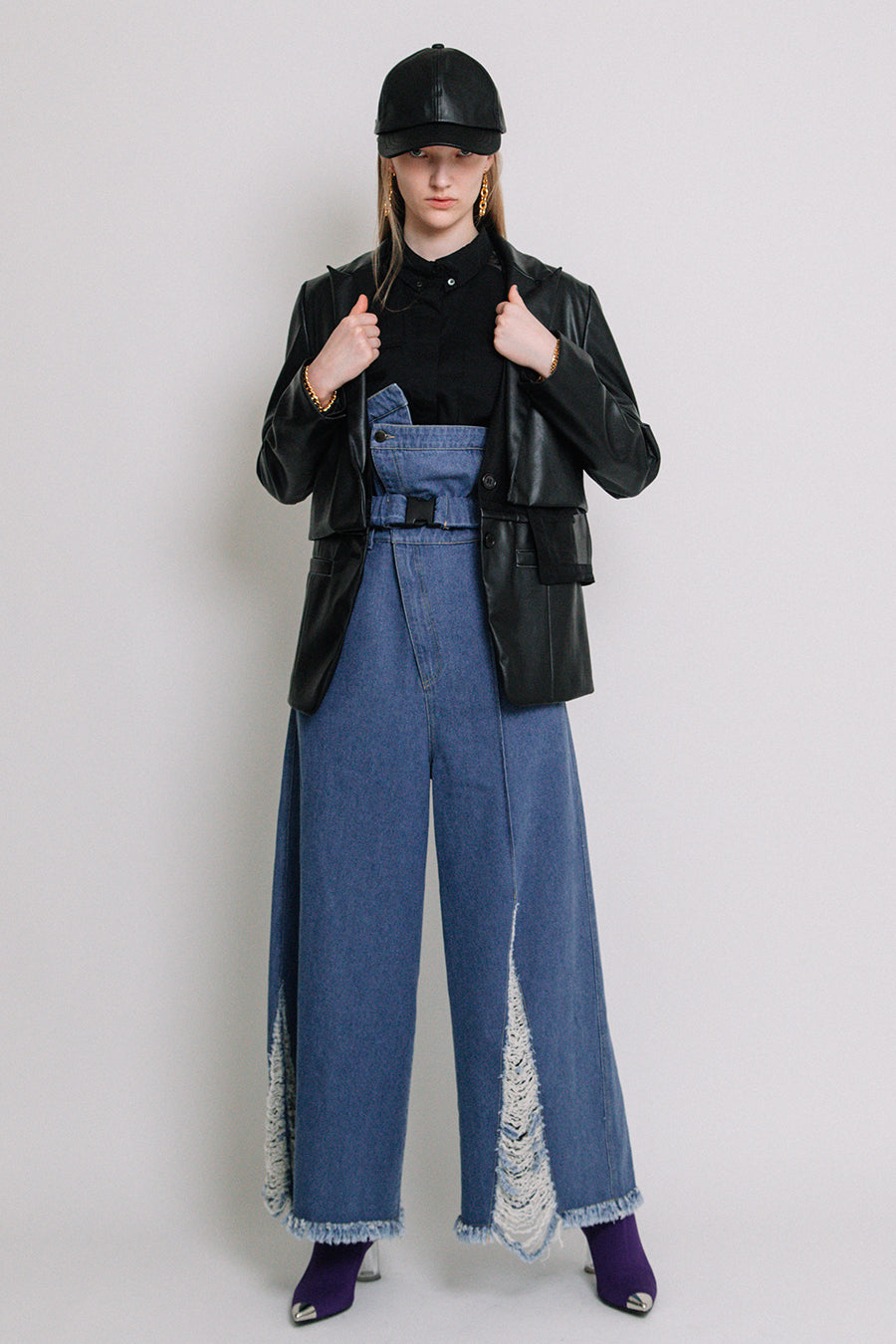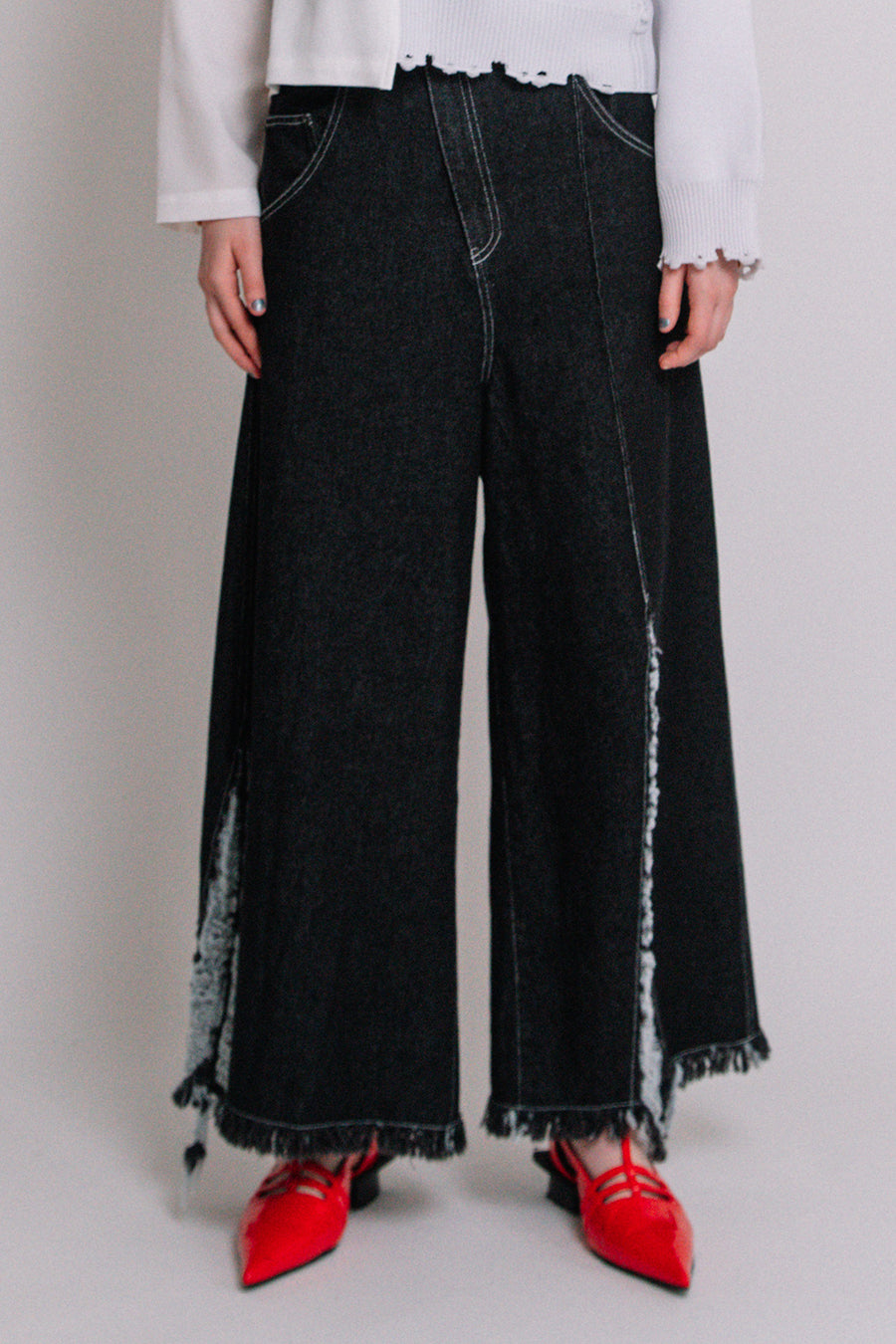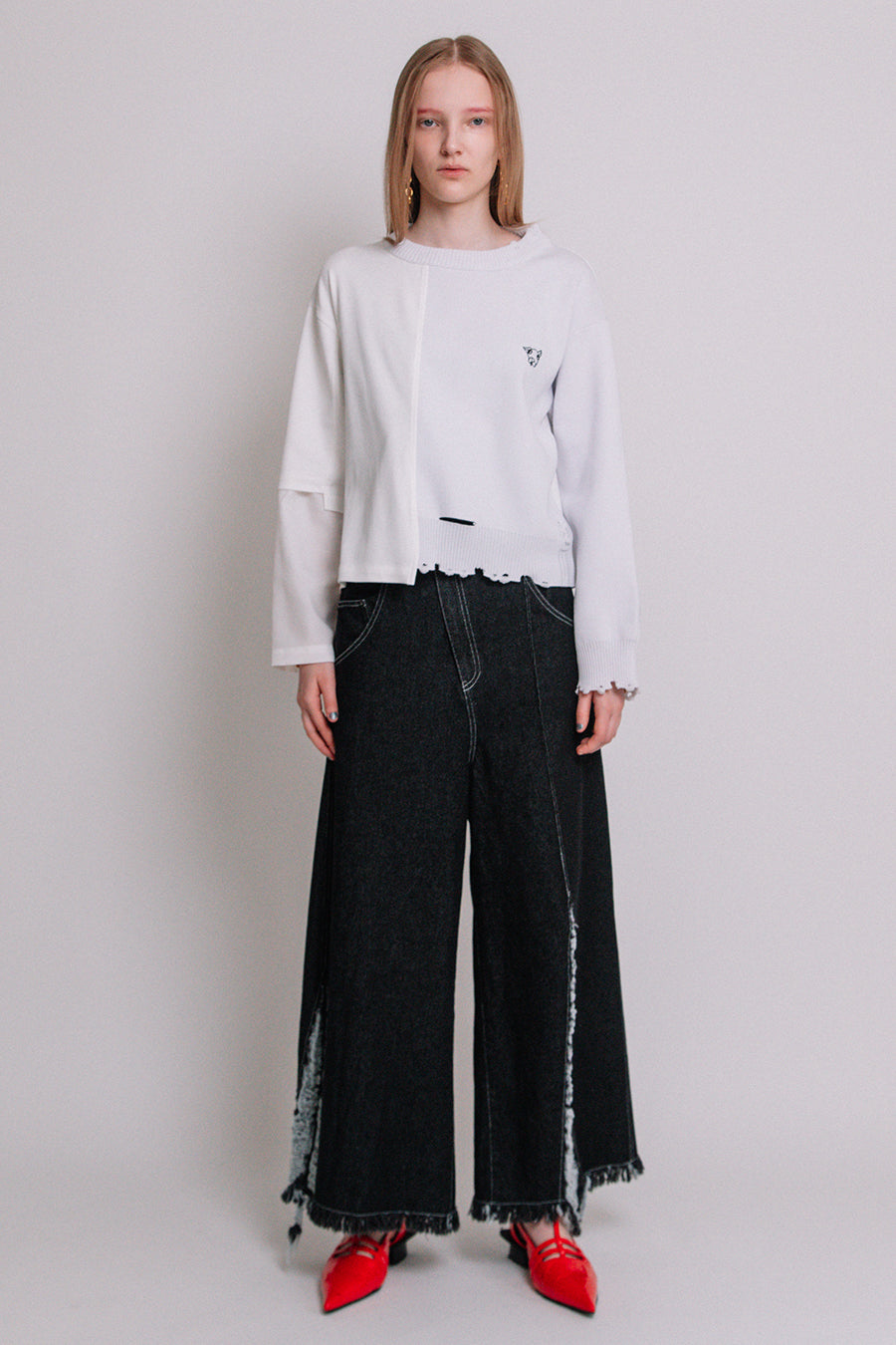 裾に大胆なダメージ入りのデニムパンツ。ダメージ加工は横糸を残した三角のダメージで、裾に2か所ポイントで加工。
