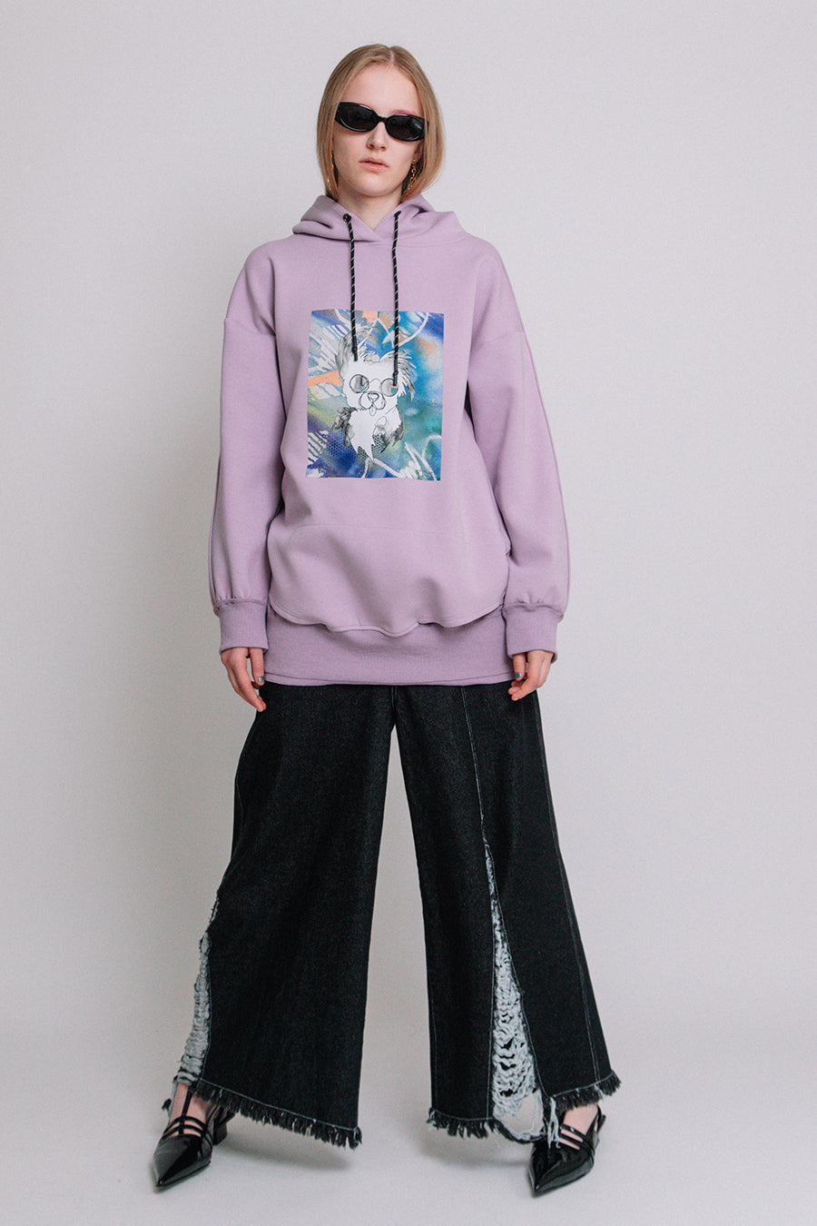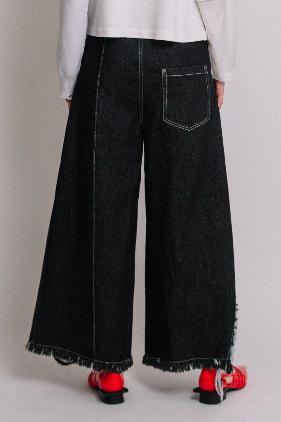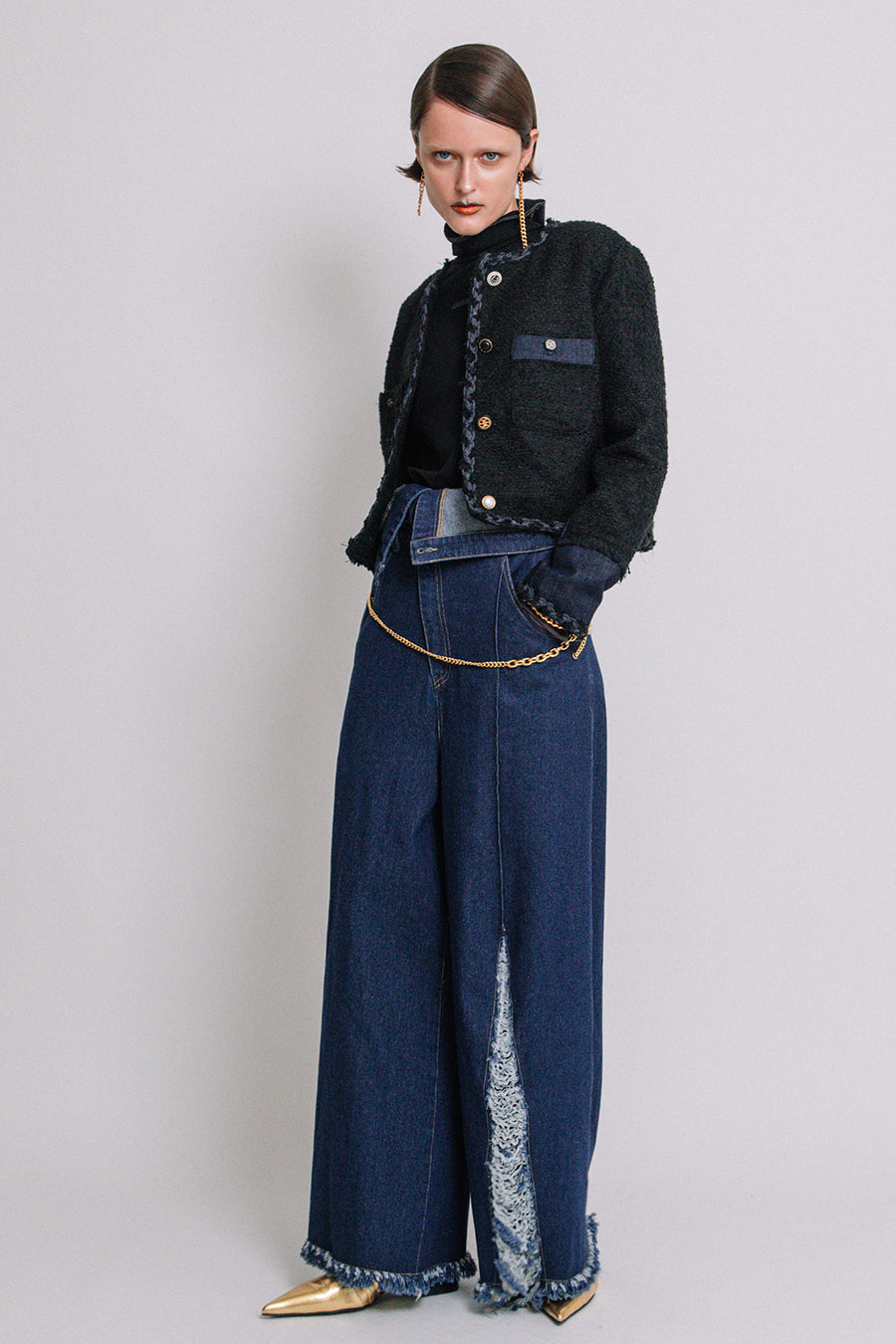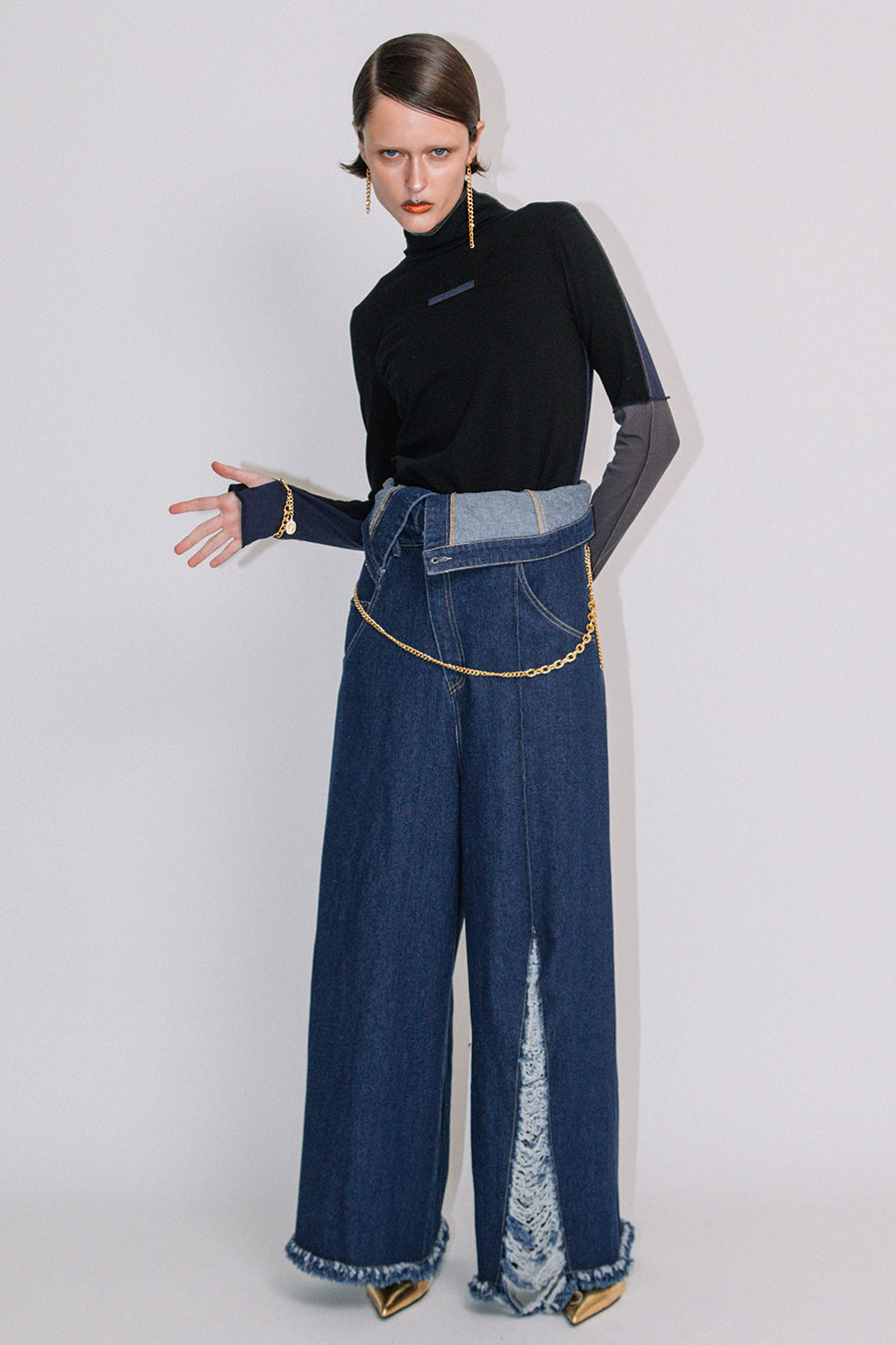 裾に大胆なダメージ入りのデニムパンツ。ダメージ加工は横糸を残した三角のダメージで、裾に2か所ポイントで加工。