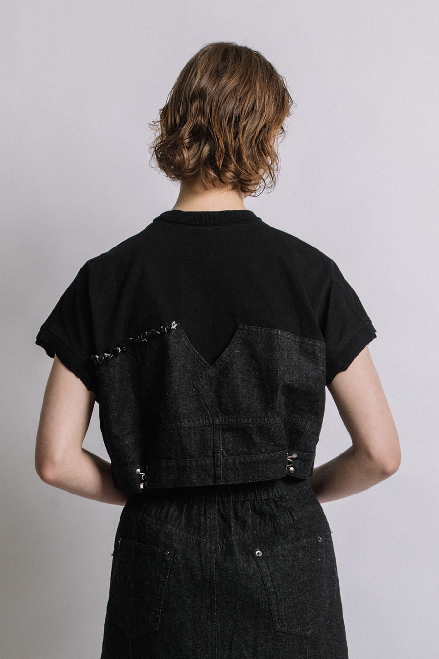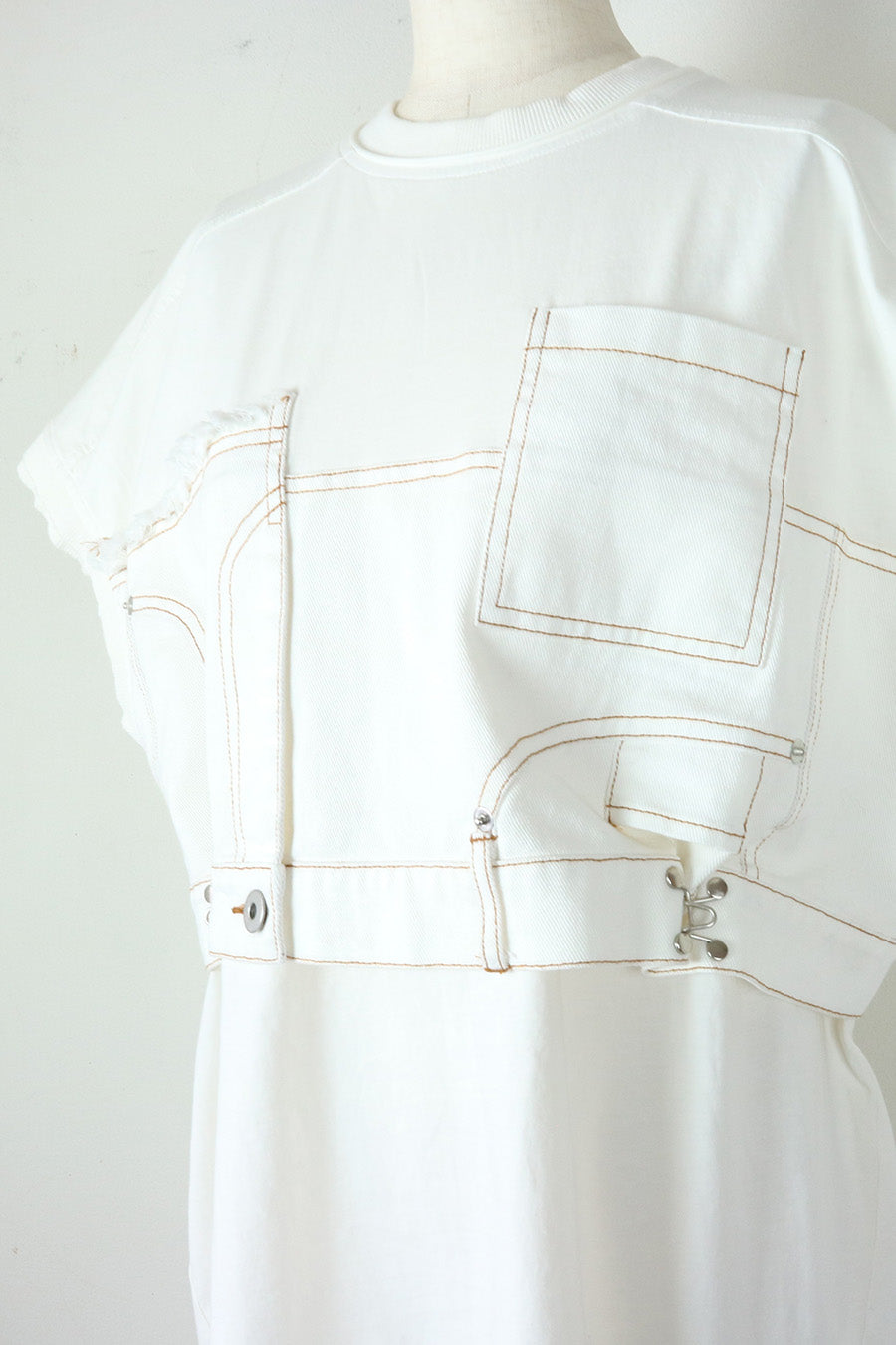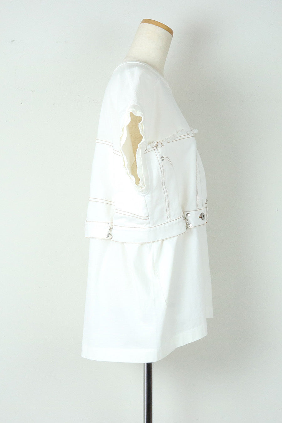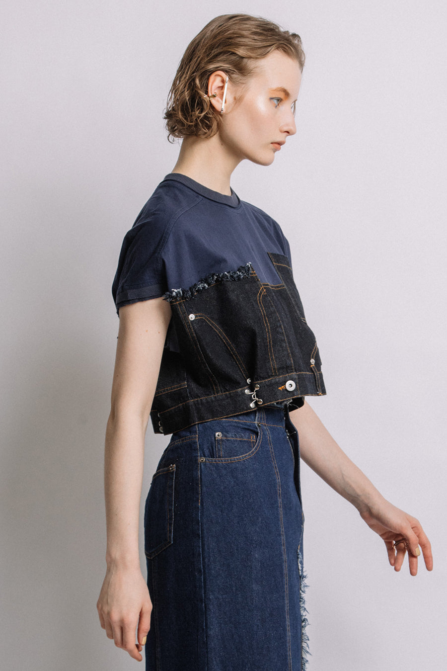 コットン天竺とライトオンスデニムのアシンメトリーコンビTシャツ。薄く軽やかなコットン天竺素材とライトオンスデニムを使用し、春先のインナーとしても、真夏のトップスとしても着用可能。デニムは加工を施し、柔らかく、ヴィンテージライクな風合いに仕上げ、アシンメトリーに施したフリンジもポイントに。デニムのウエスト箇所の前後ホックを留めるとレディライクなフレアシルエットに変わり、ウエストが絞られることでスタイルアップ効果も◎スタイリングによって好みのシルエットを楽しめます。着丈はヒップにかかる設定なので腰回りを、フレンチスリーブは長めの設定で二の腕をカバーしてくれるのも嬉しいポイント。