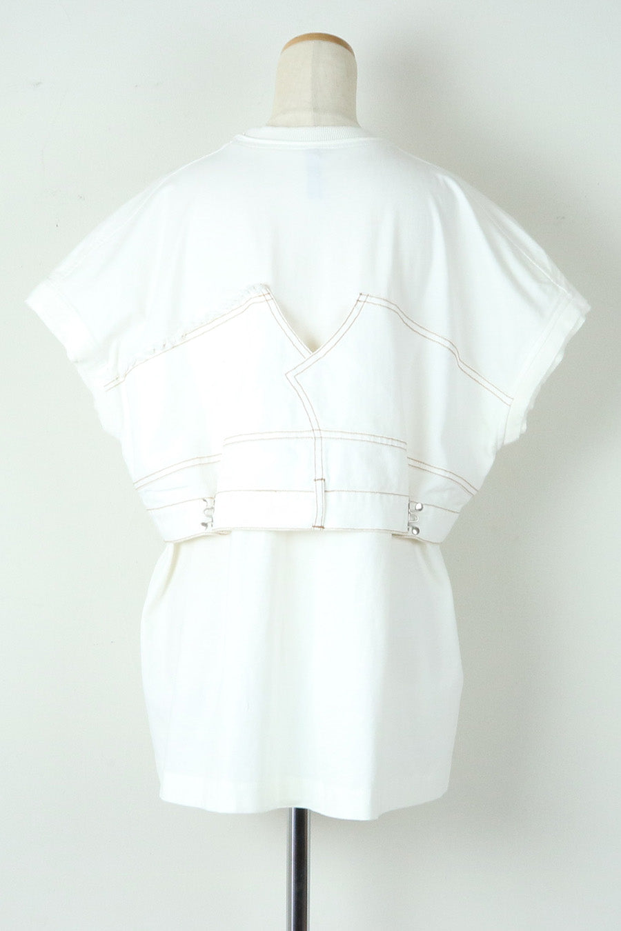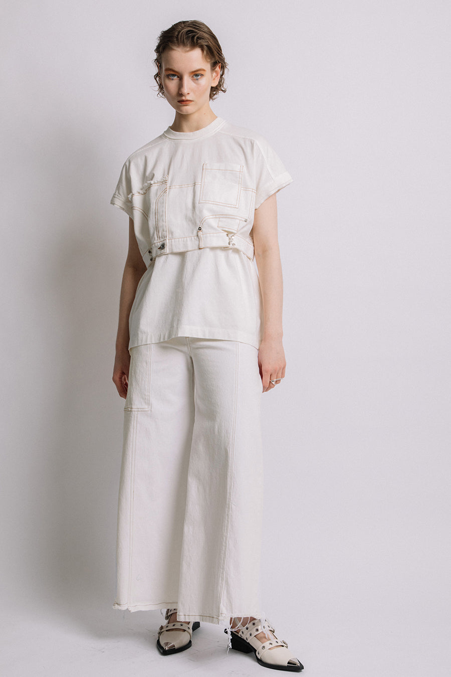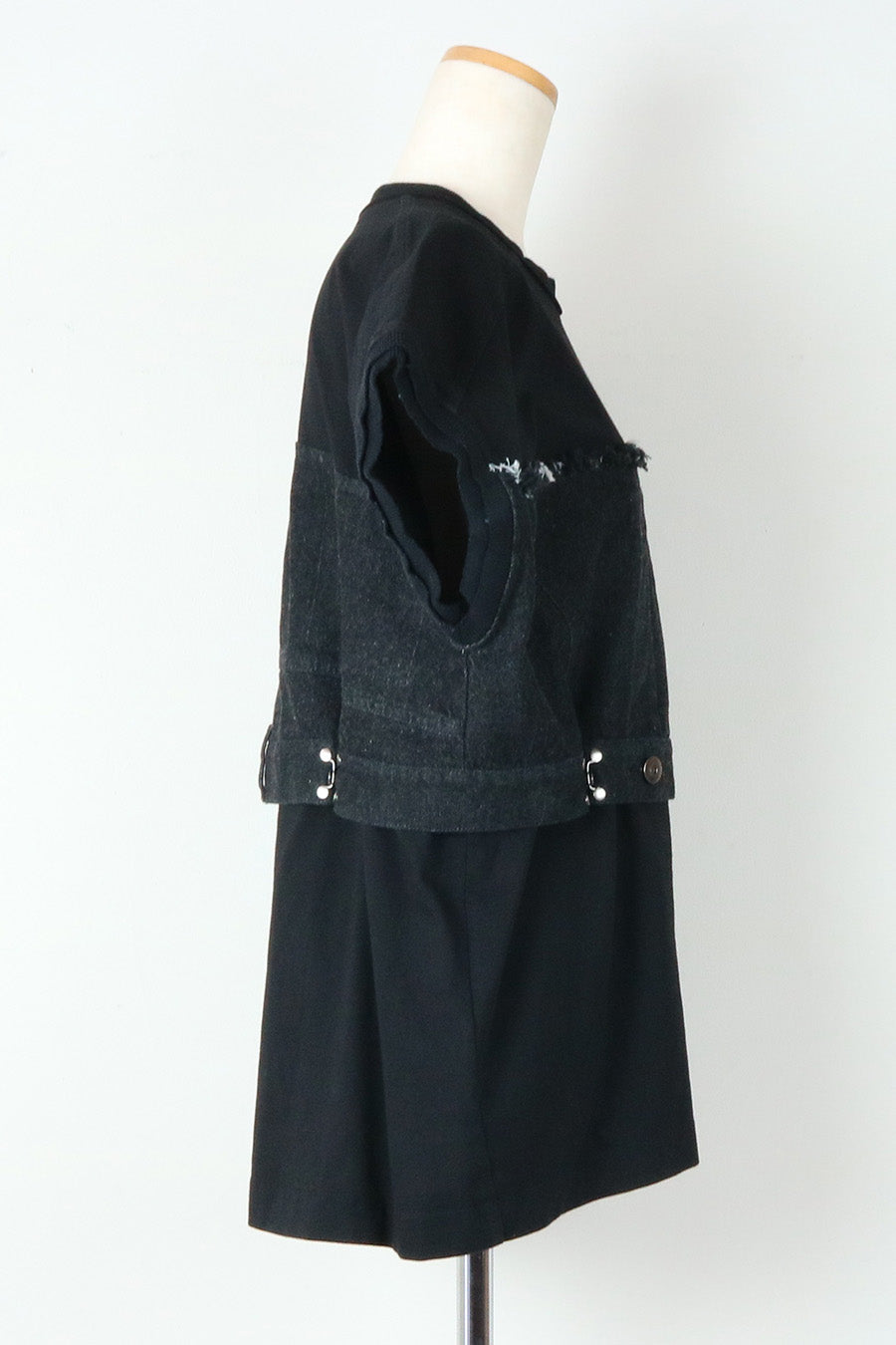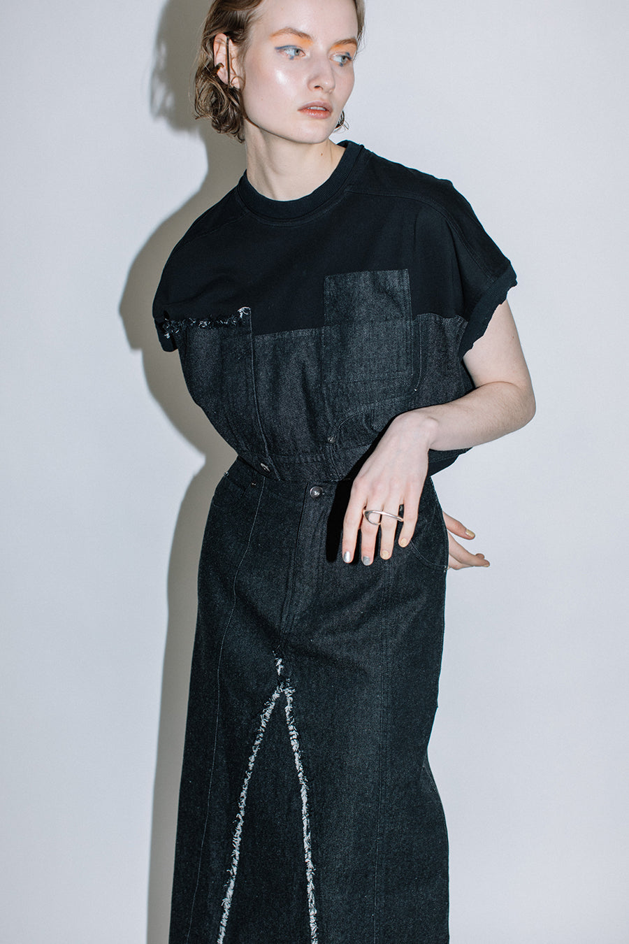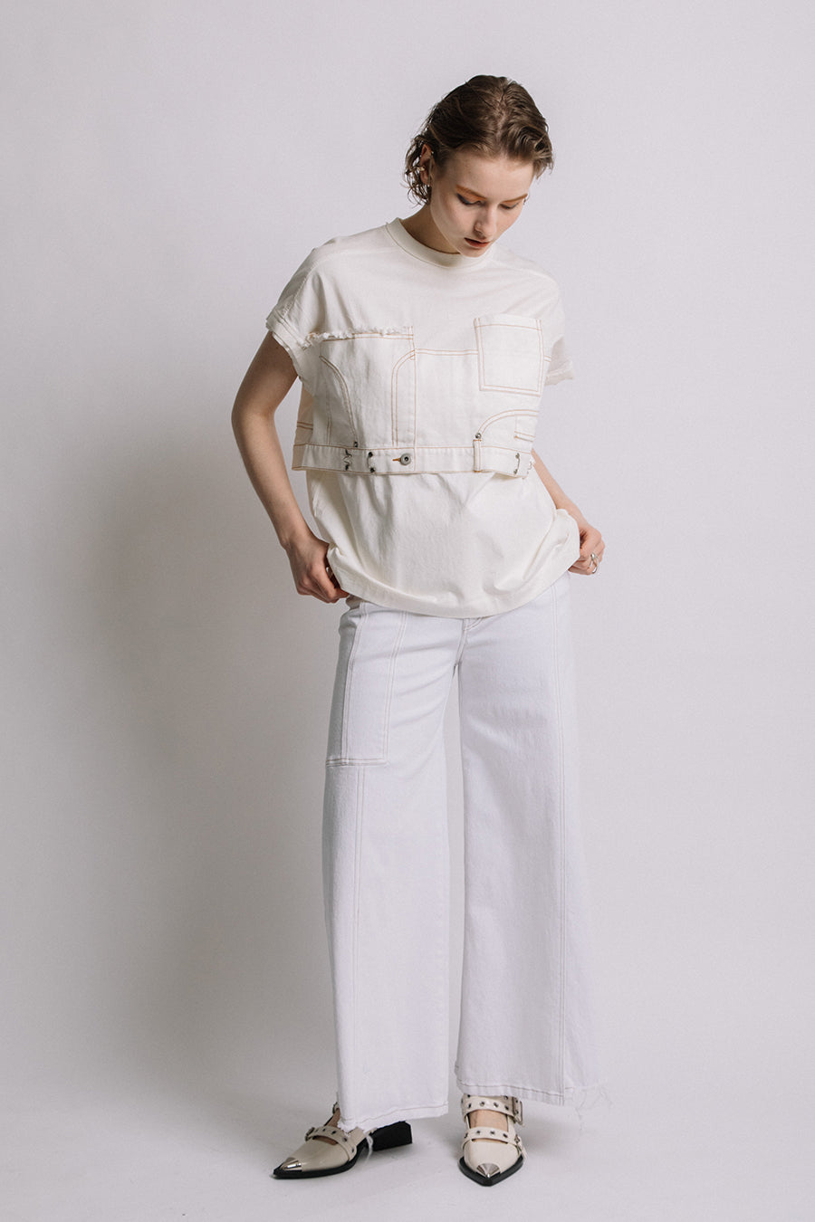 コットン天竺とライトオンスデニムのアシンメトリーコンビTシャツ。薄く軽やかなコットン天竺素材とライトオンスデニムを使用し、春先のインナーとしても、真夏のトップスとしても着用可能。デニムは加工を施し、柔らかく、ヴィンテージライクな風合いに仕上げ、アシンメトリーに施したフリンジもポイントに。デニムのウエスト箇所の前後ホックを留めるとレディライクなフレアシルエットに変わり、ウエストが絞られることでスタイルアップ効果も◎スタイリングによって好みのシルエットを楽しめます。着丈はヒップにかかる設定なので腰回りを、フレンチスリーブは長めの設定で二の腕をカバーしてくれるのも嬉しいポイント。